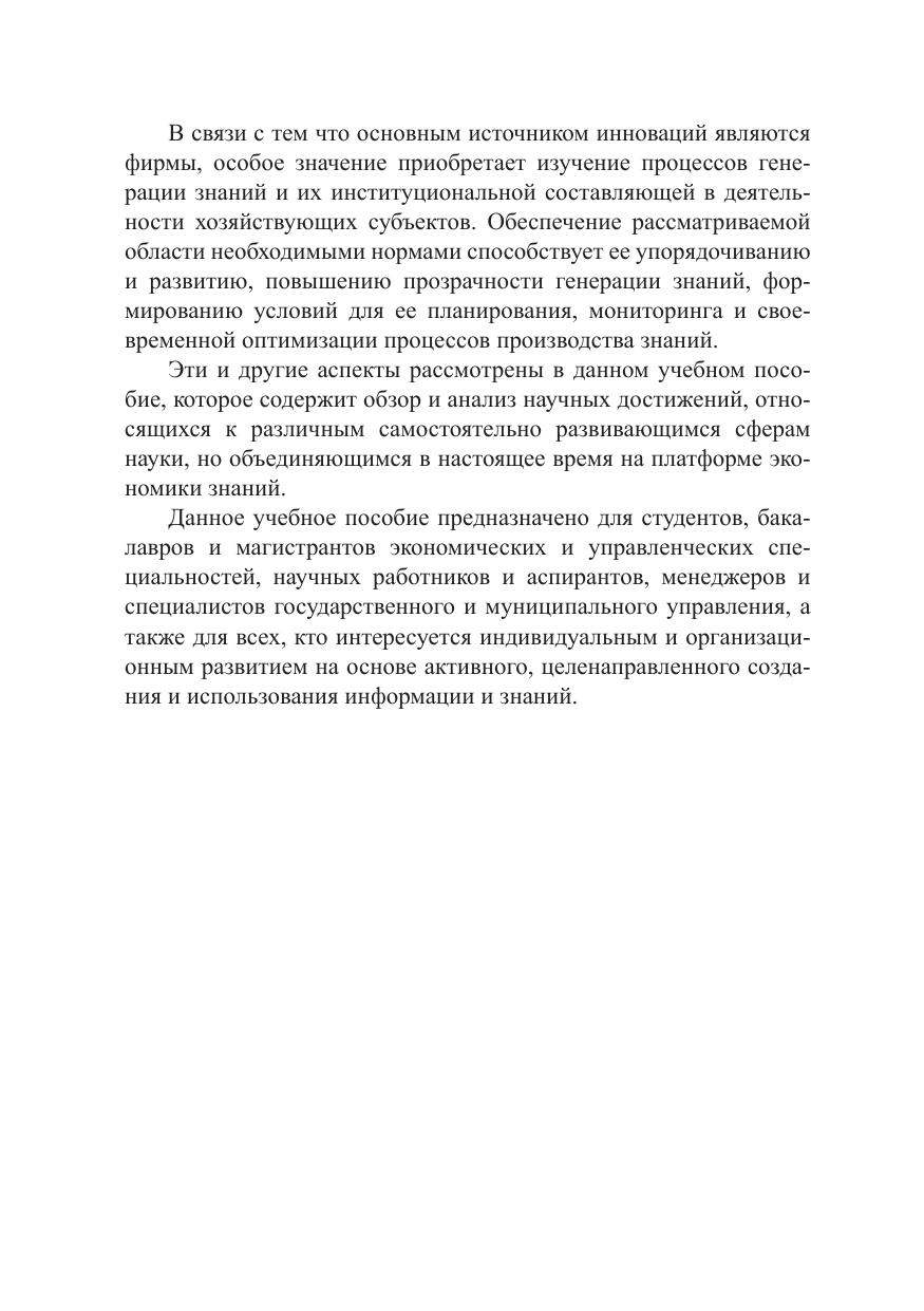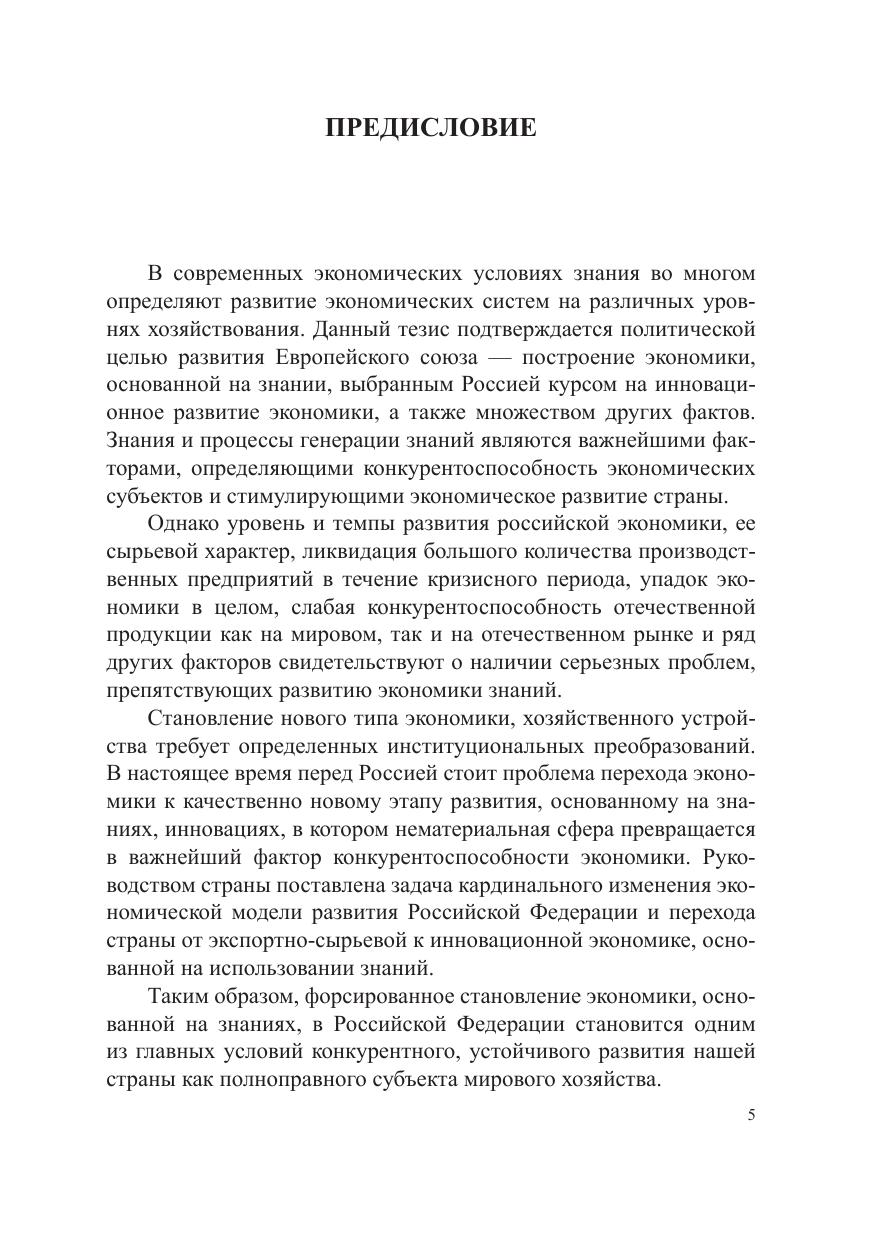 В учебном пособии рассмотрены наиболее важные вопросы становления и развития экономики знаний. Раскрыты особенности формирования государственной политики в условиях экономики знаний, институциональные аспекты развития экономики, основанной на знаниях; представлены модели управления знаниями на предприятиях и основы институционального проектирования системы генерации знаний фирмы; даны классификация и характеристика стратегий генерации знаний; предложены технологии управления знаниями на предприятиях. Предназначено для студентов, аспирантов и преподавателей экономических вузов, а также для научных работников и практических специалистов, занимающихся проблемами экономики знаний и управления знаниями.