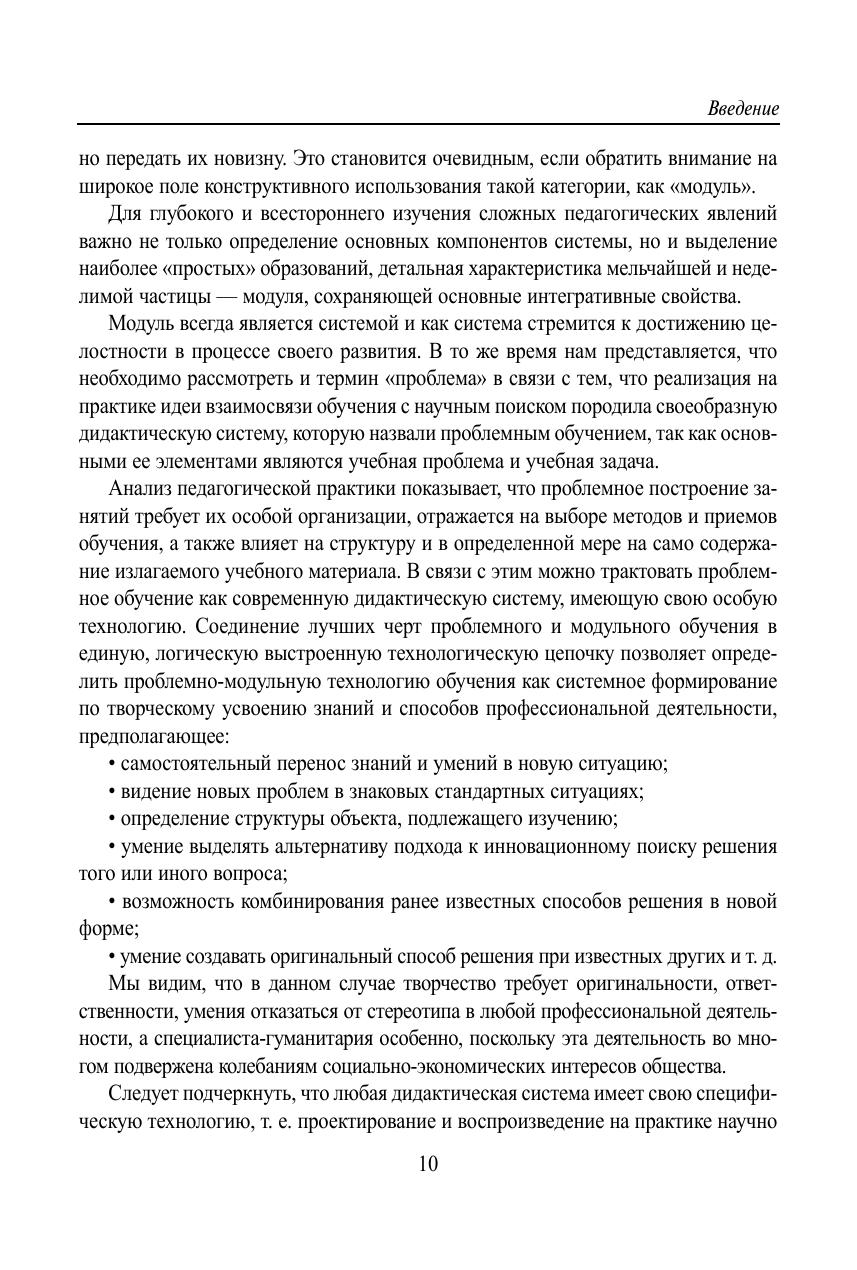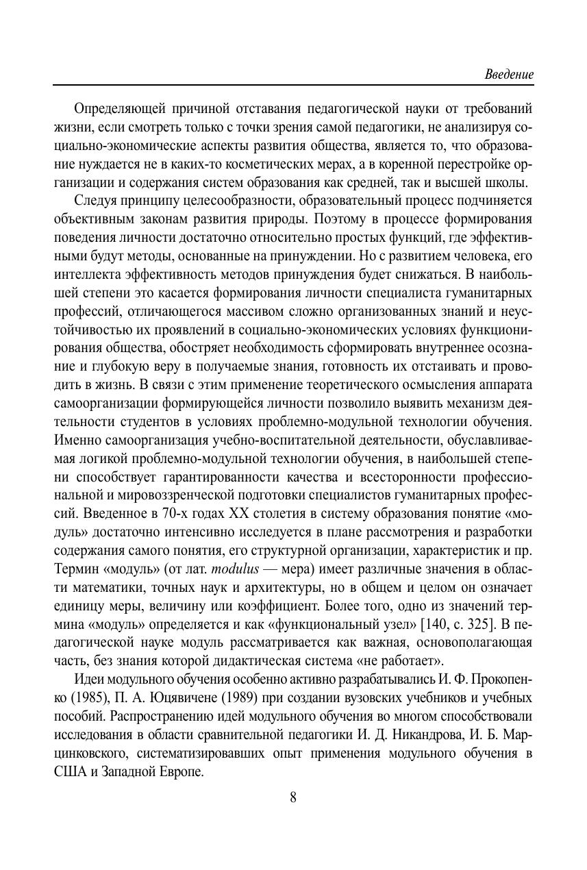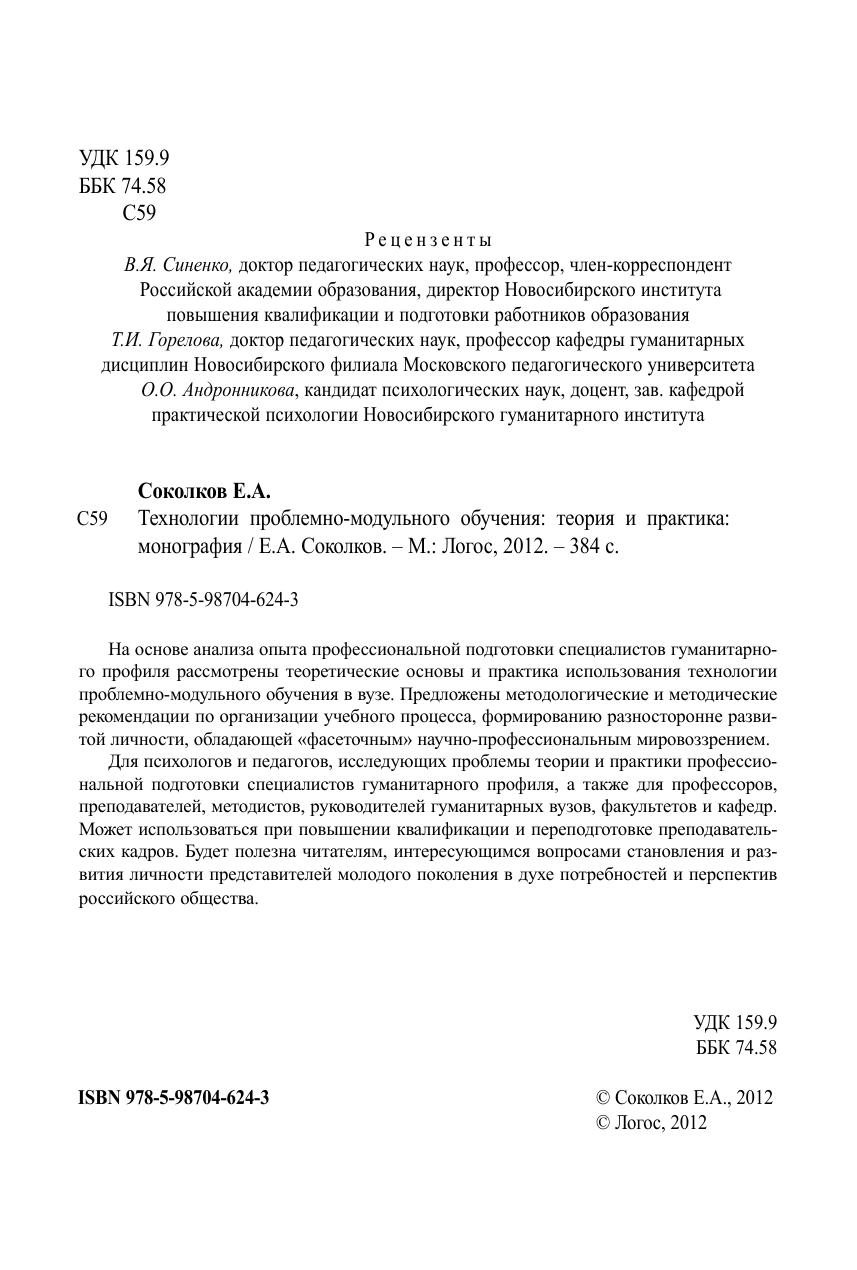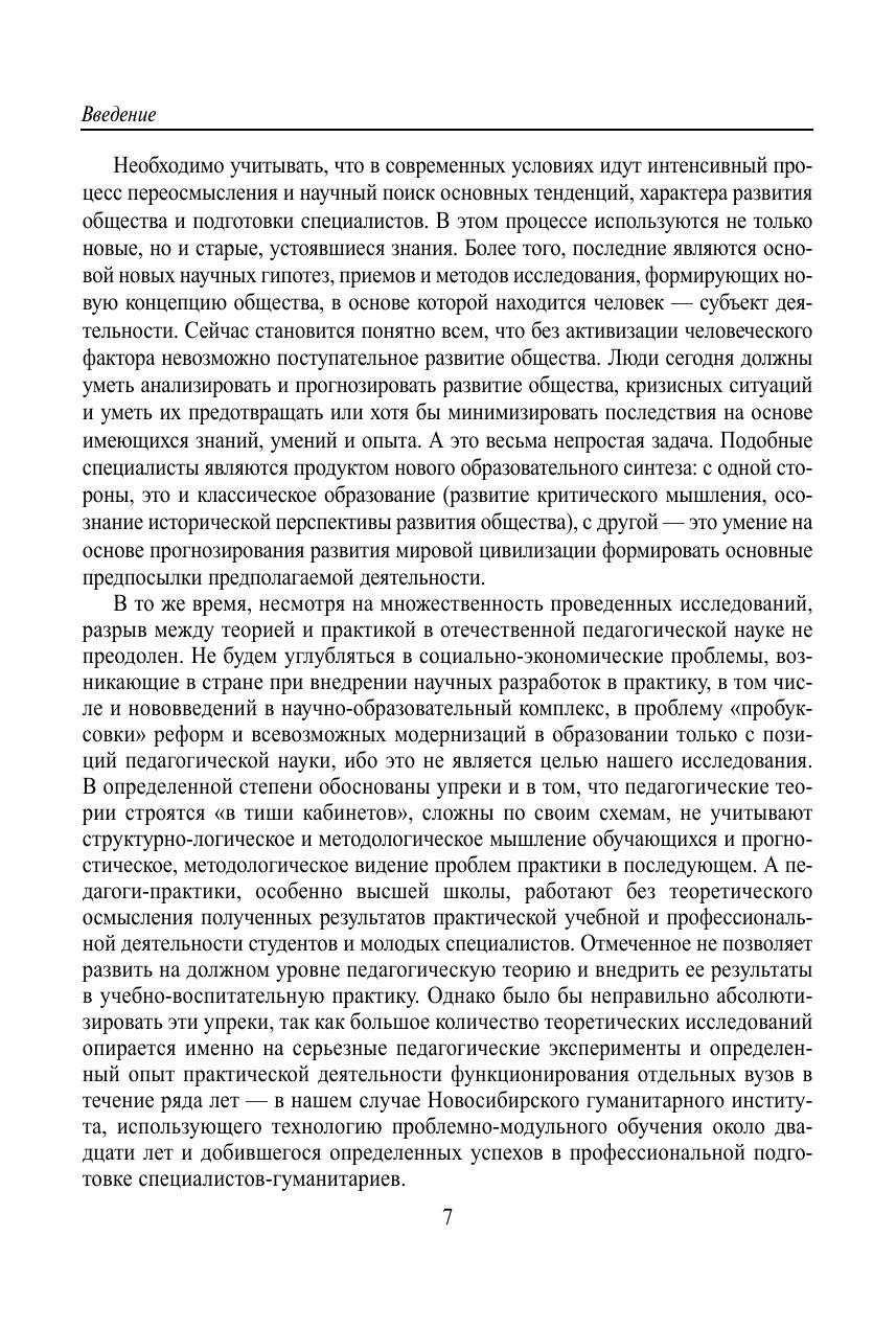 На основе анализа опыта профессиональной подготовки специалистов гуманитарного профиля рассмотрены теоретические основы и практика использования технологии проблемно-модульного обучения в вузе. Предложены методологические и методические рекомендации по организации учебного процесса, формированию разносторонне развитой личности, обладающей «фасеточным» научно-профессиональным мировоззрением. Для психологов и педагогов, исследующих проблемы теории и практики профессиональной подготовки специалистов гуманитарного профиля, а также для профессоров, преподавателей, методистов, руководителей гуманитарных вузов, факультетов и кафедр. Может использоваться при повышении квалификации и переподготовке преподавательских кадров. Будет полезна читателям, интересующимся вопросами становления и развития личности представителей молодого поколения в духе потребностей и перспектив российского общества.