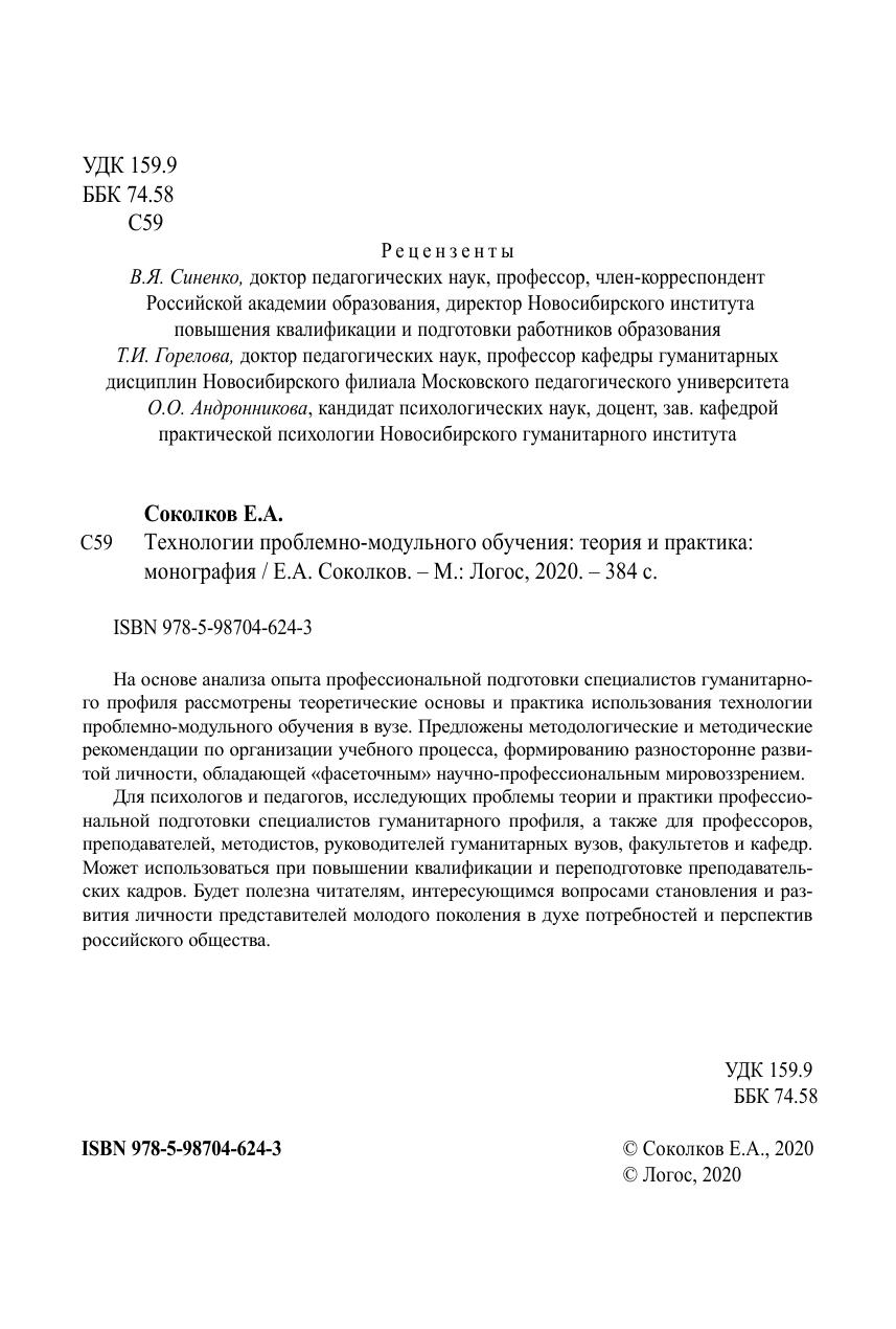 На основе анализа опыта профессиональной подготовки специалистов гуманитарного профиля рассмотрены теоретические основы и практика использования технологии проблемно-модульного обучения в вузе. Предложены методологические и методические рекомендации по организации учебного процесса, формированию разносторонне развитой личности, обладающей «фасеточным» научно-профессиональным мировоззрением. Для психологов и педагогов, исследующих проблемы теории и практики профессиональной подготовки специалистов гуманитарного профиля, а также для профессоров, преподавателей, методистов, руководителей гуманитарных вузов, факультетов и кафедр. Может использоваться при повышении квалификации и переподготовке преподавательских кадров. Будет полезна читателям, интересующимся вопросами становления и развития личности представителей молодого поколения в духе потребностей и перспектив российского общества.