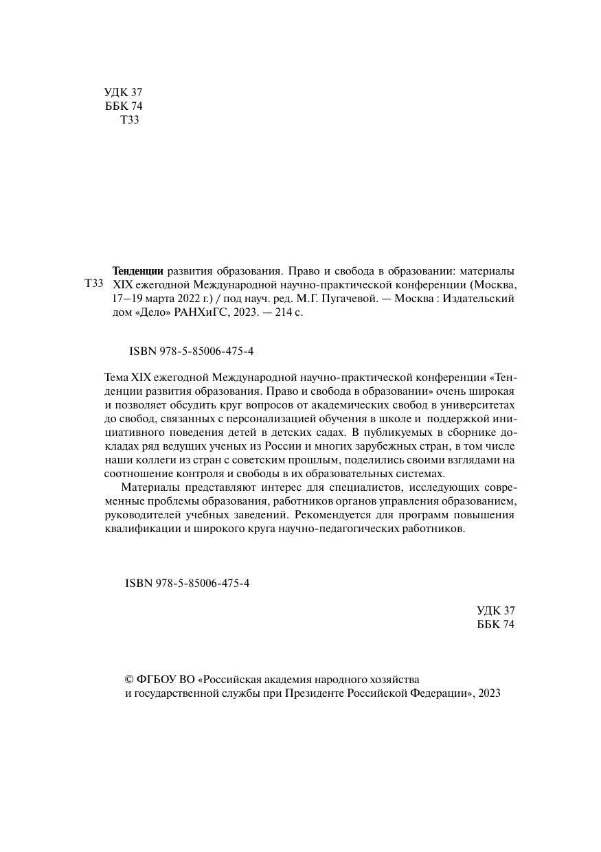 Тема XIX ежегодной Международной научно-практической конференции «Тенденции развития образования. Право и свобода в образовании» очень широкая и позволяет обсудить круг вопросов от академических свобод в университетах до свобод, связанных с персонализацией обучения в школе и поддержкой инициативного поведения детей в детских садах. В публикуемых в сборнике докладах ряд ведущих ученых из России и многих зарубежных стран, в том числе наши коллеги из стран с советским прошлым, поделились своими взглядами на соотношение контроля и свободы в их образовательных системах. Материалы представляют интерес для специалистов, исследующих современные проблемы образования, работников органов управления образованием, руководителей учебных заведений. Рекомендуется для программ повышения квалификации и ирокого круга научно-педагогических работников.