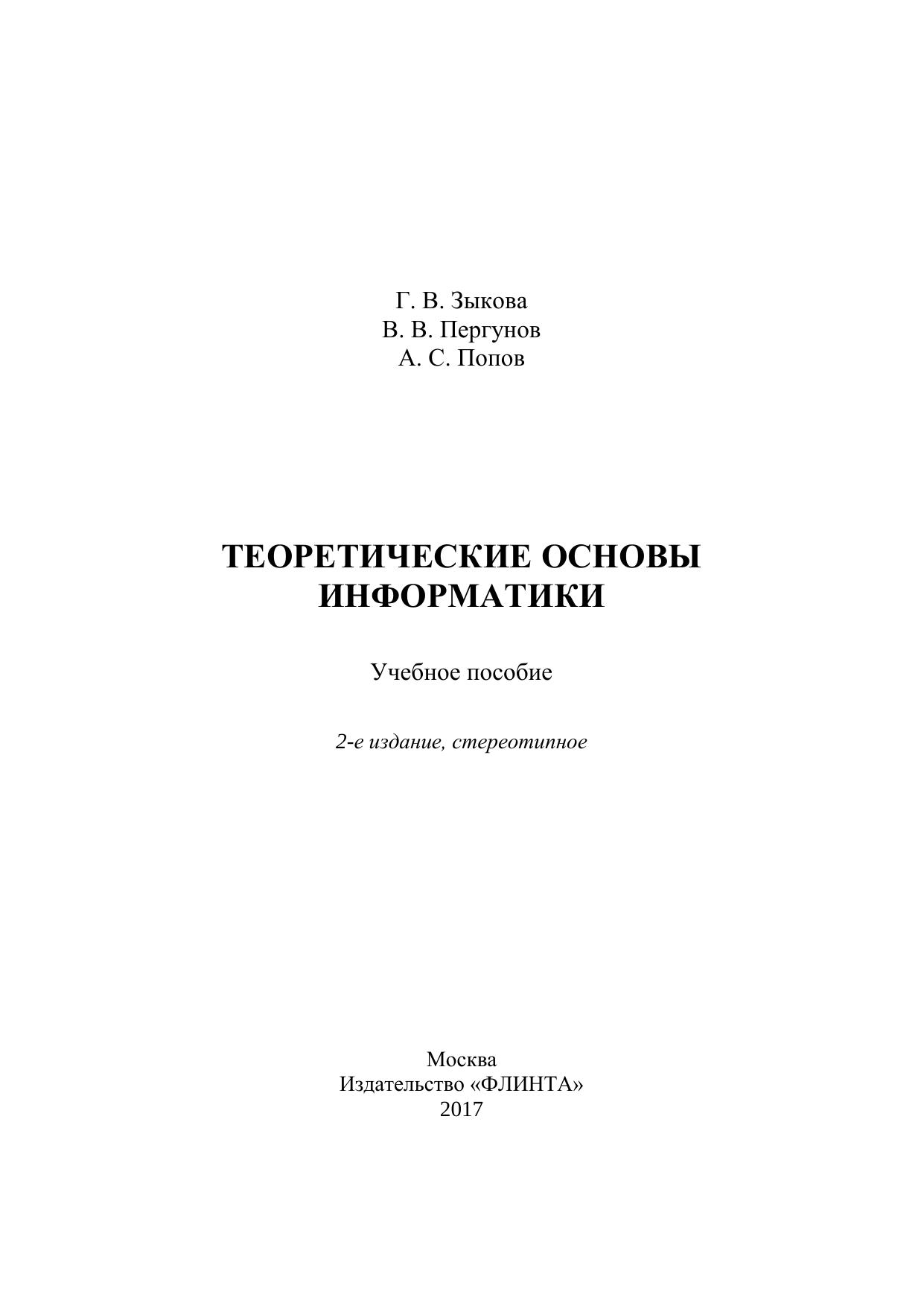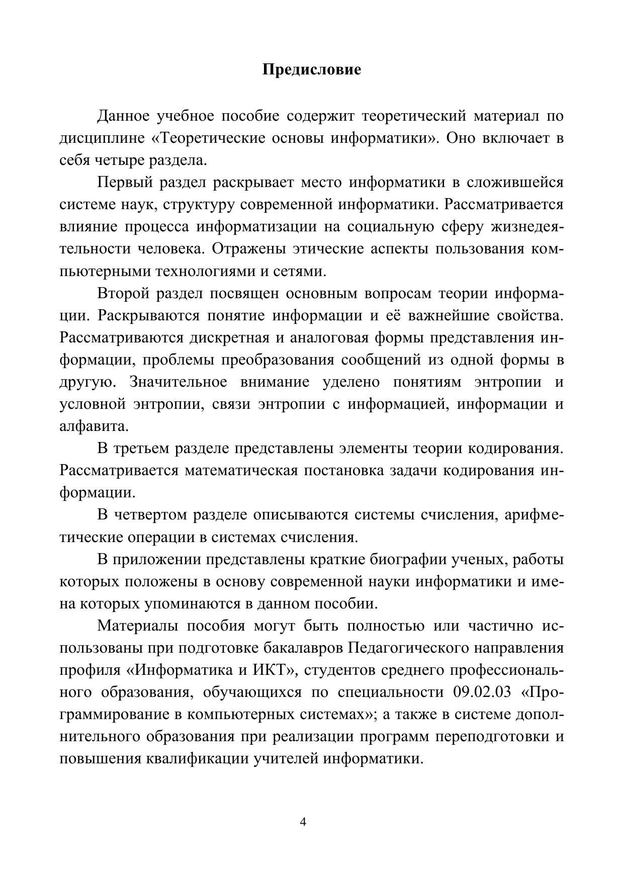 Учебное пособие может быть использовано при изучении дисциплины «Теоретические основы информатики» для бакалавров направления «Педагогическое образование», профиль «Информатика и ИКТ»; студентов среднего профессионального образования, обучающихся по специальности 09.02.03 «Программирование в компьютерных системах»; а также в системе дополнительной профессиональной переподготовки учителей информатики и ИКТ.