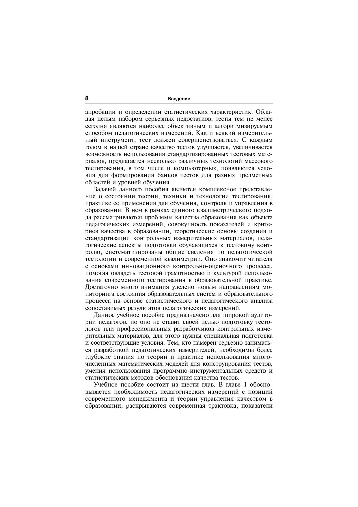 Рассматриваются вопросы качества образования и пути его повышения, теория и практика педагогических измерений, формы и методы массового тестирования. Показаны возможности квалиметрического образовательного мониторинга качества обучения в масштабах страны, регионов, территорий или отдельных образовательных учреждений. Предназначена студентам и аспирантам, а также преподавателям педагогических вузов.