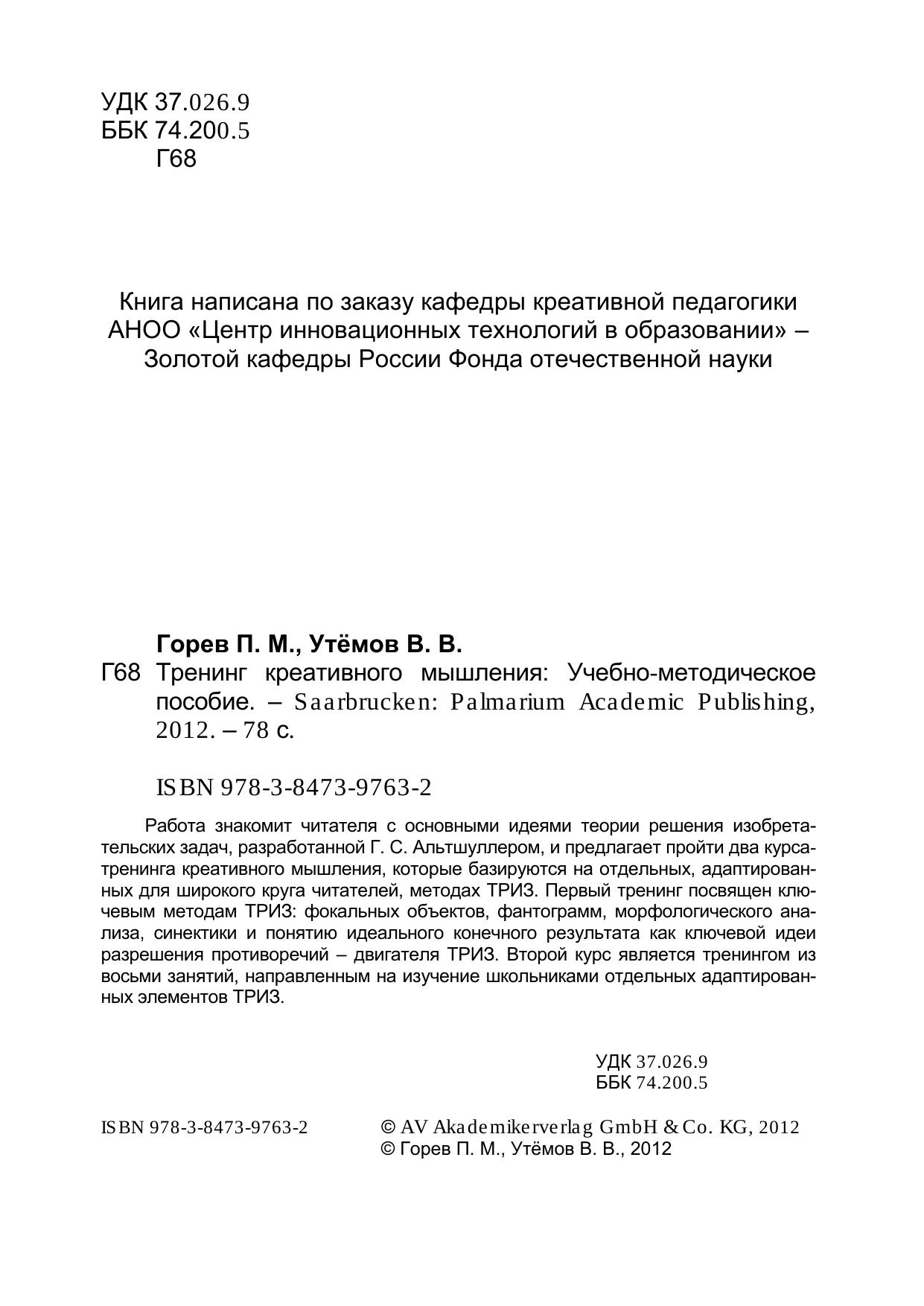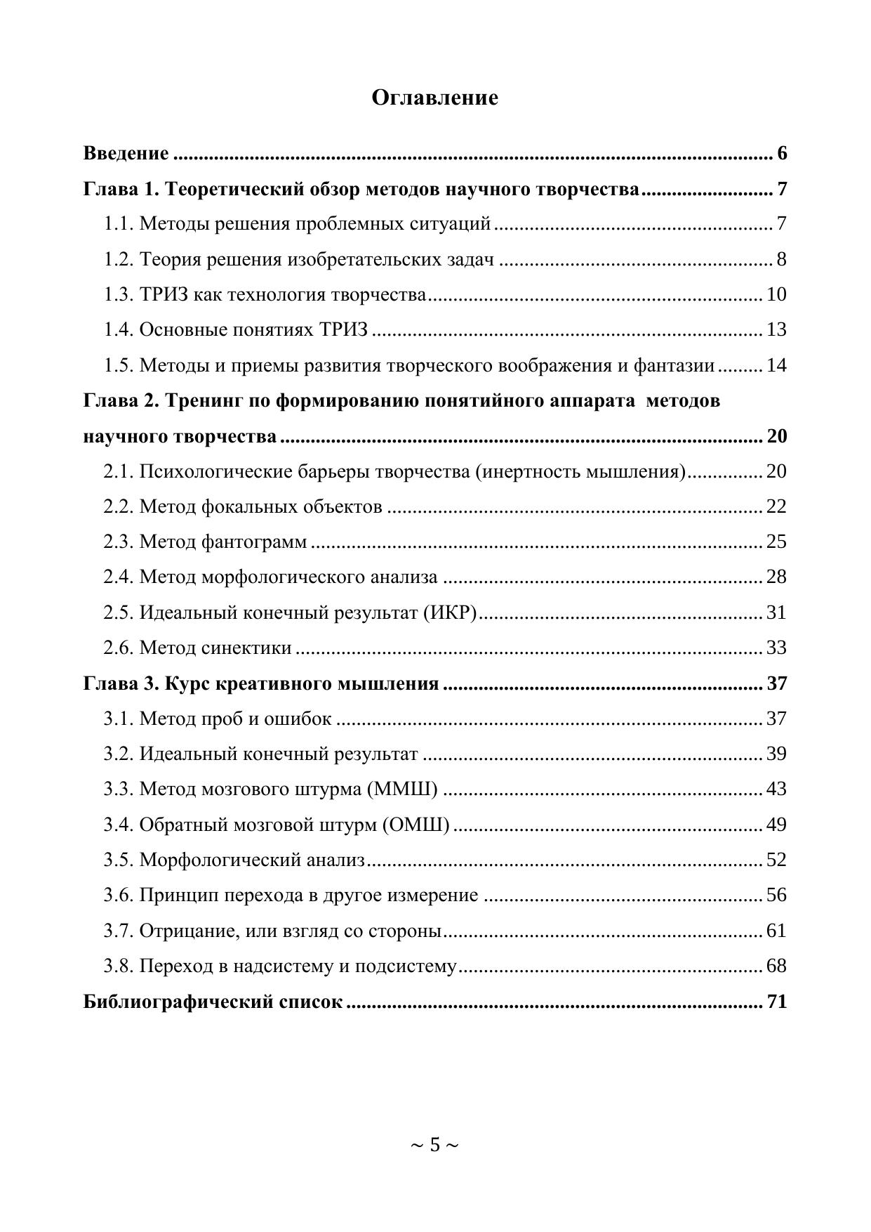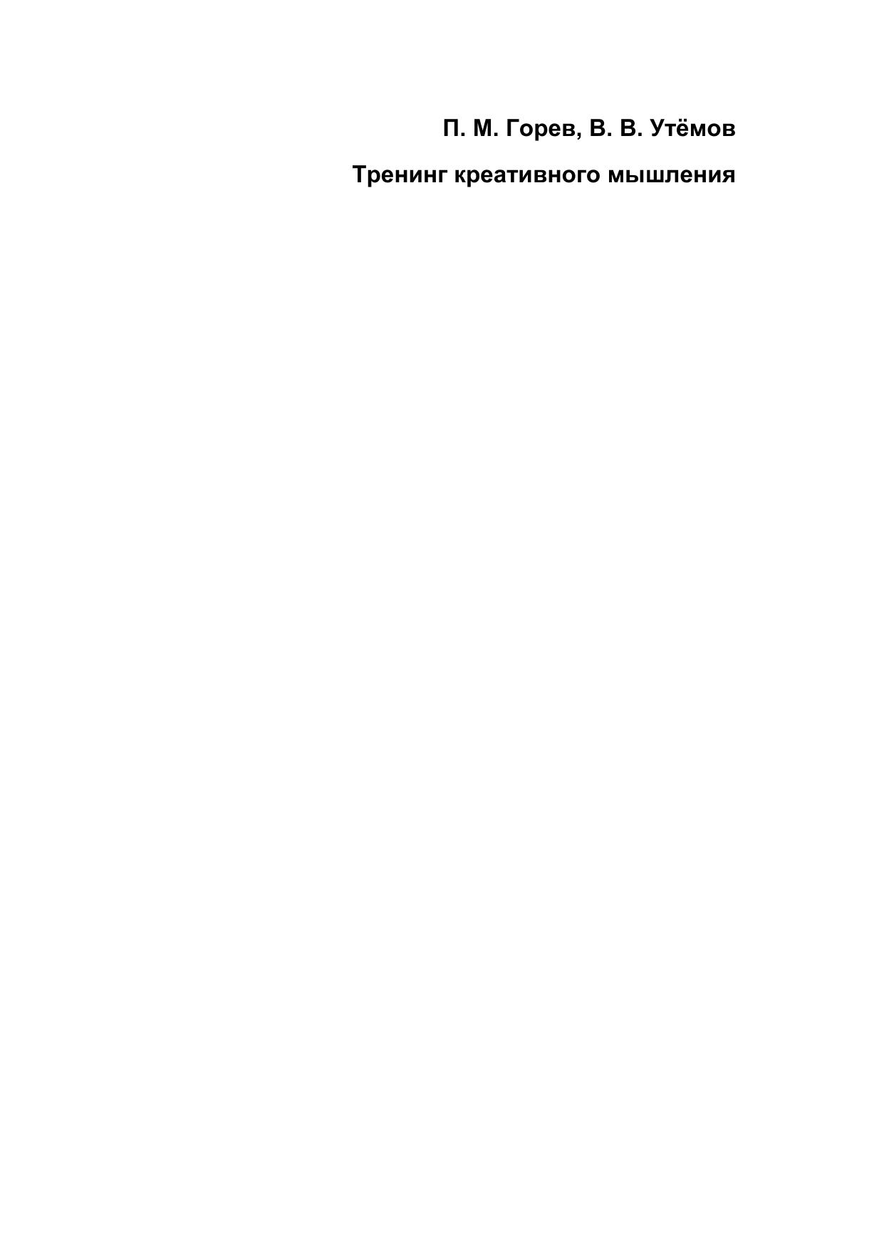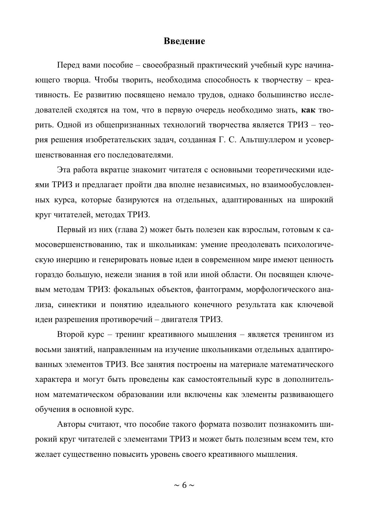 Работа знакомит читателя с основными идеями теории решения изобретательских задач, разработанной Г. С. Альтшуллером, и предлагает пройти два курса-тренинга креативного мышления, которые базируются на отдельных, адаптированных для широкого круга читателей, методах ТРИЗ. Первый тренинг посвящен ключевым методам ТРИЗ: фокальных объектов, фантограмм, морфологического анализа, синектики и понятию идеального конечного результата как ключевой идеи разрешения противоречий - двигателя ТРИЗ. Второй курс является тренингом из восьми занятий, направленным на изучение школьниками отдельных адаптированных элементов ТРИЗ.