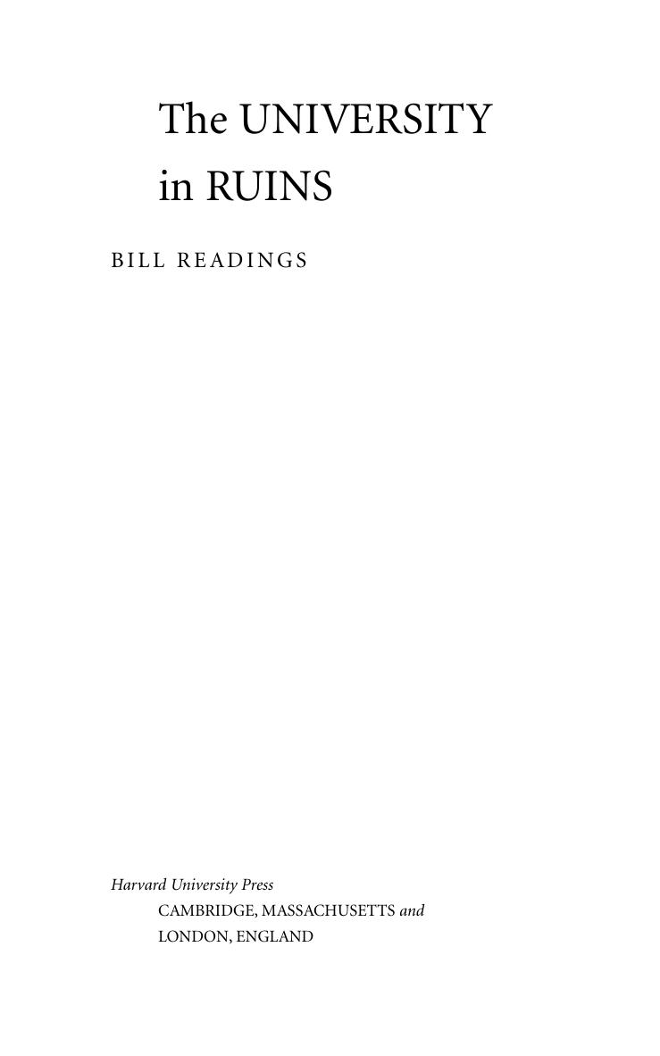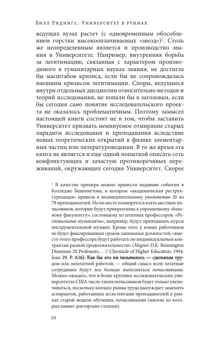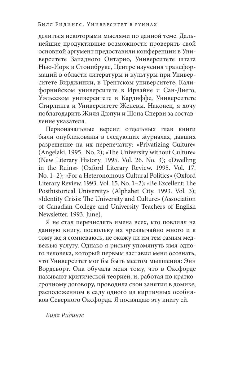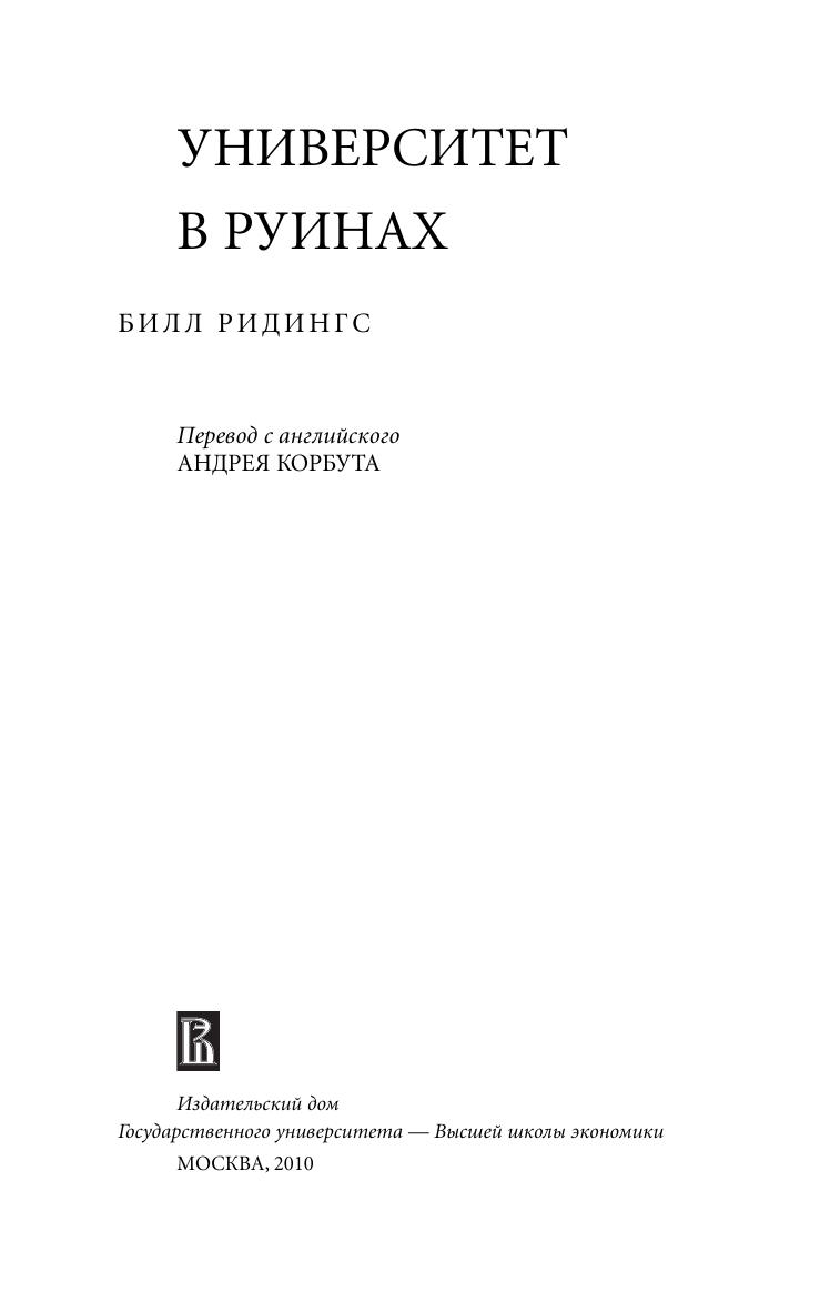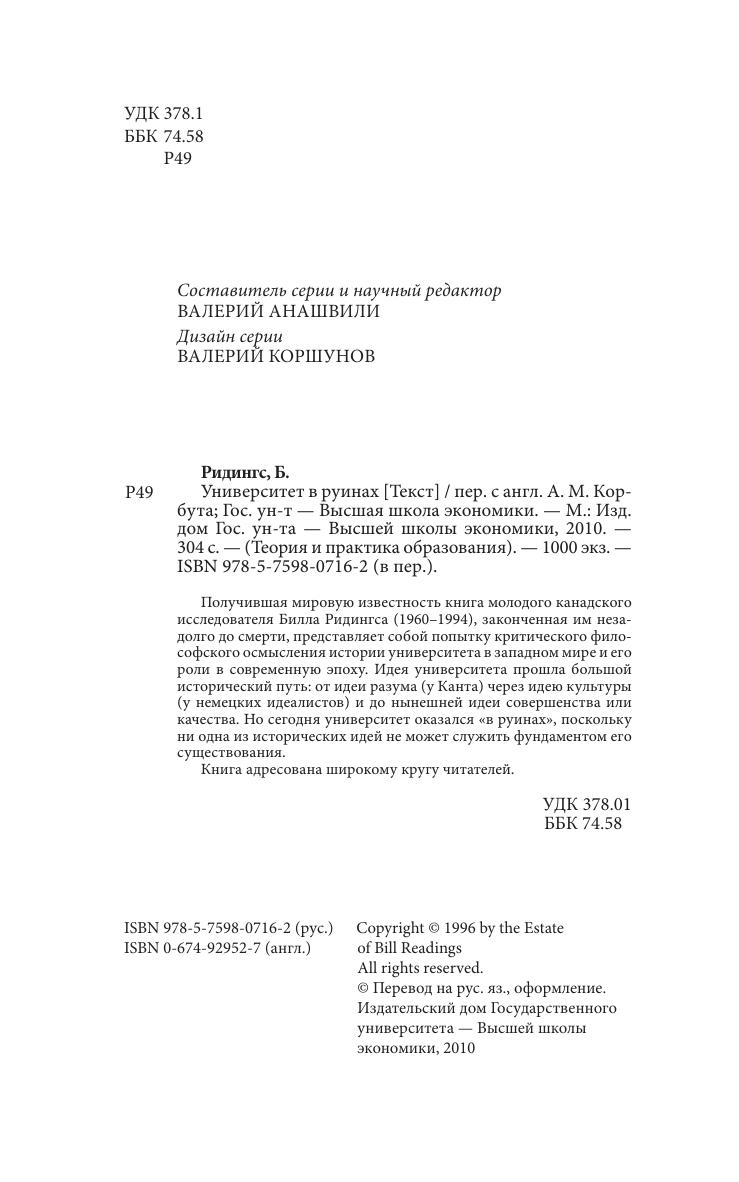 Получившая мировую известность книга молодого канадского исследователя Билла Ридингса (1960–1994), законченная им незадолго до смерти, представляет собой попытку критического философского осмысления истории университета в западном мире и его роли в современную эпоху. Идея университета прошла большой исторический путь: от идеи разума (у Канта) через идею культуры (у немецких идеалистов) и до нынешней идеи совершенства или качества. Но сегодня университет оказался «в руинах», поскольку ни одна из исторических идей не может служить фундаментом его существования. Книга адресована широкому кругу читателей.