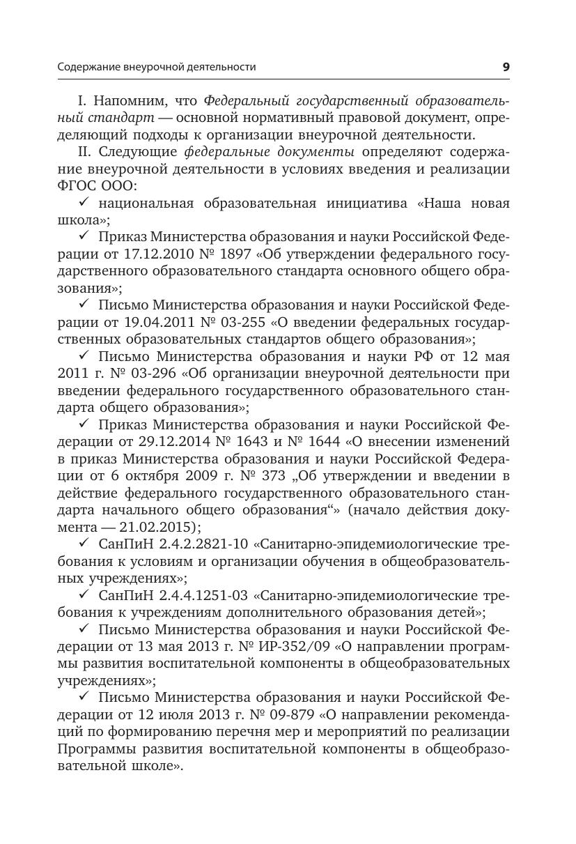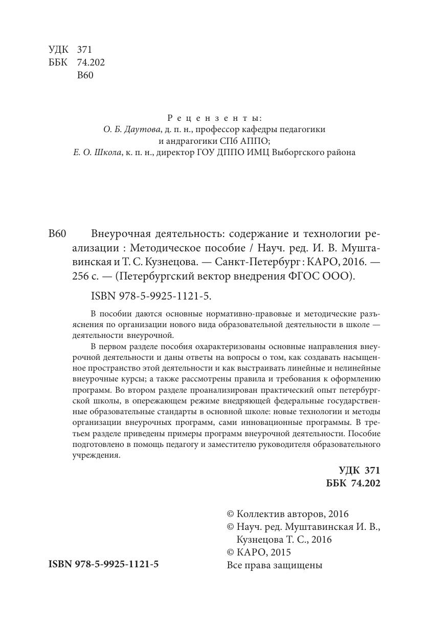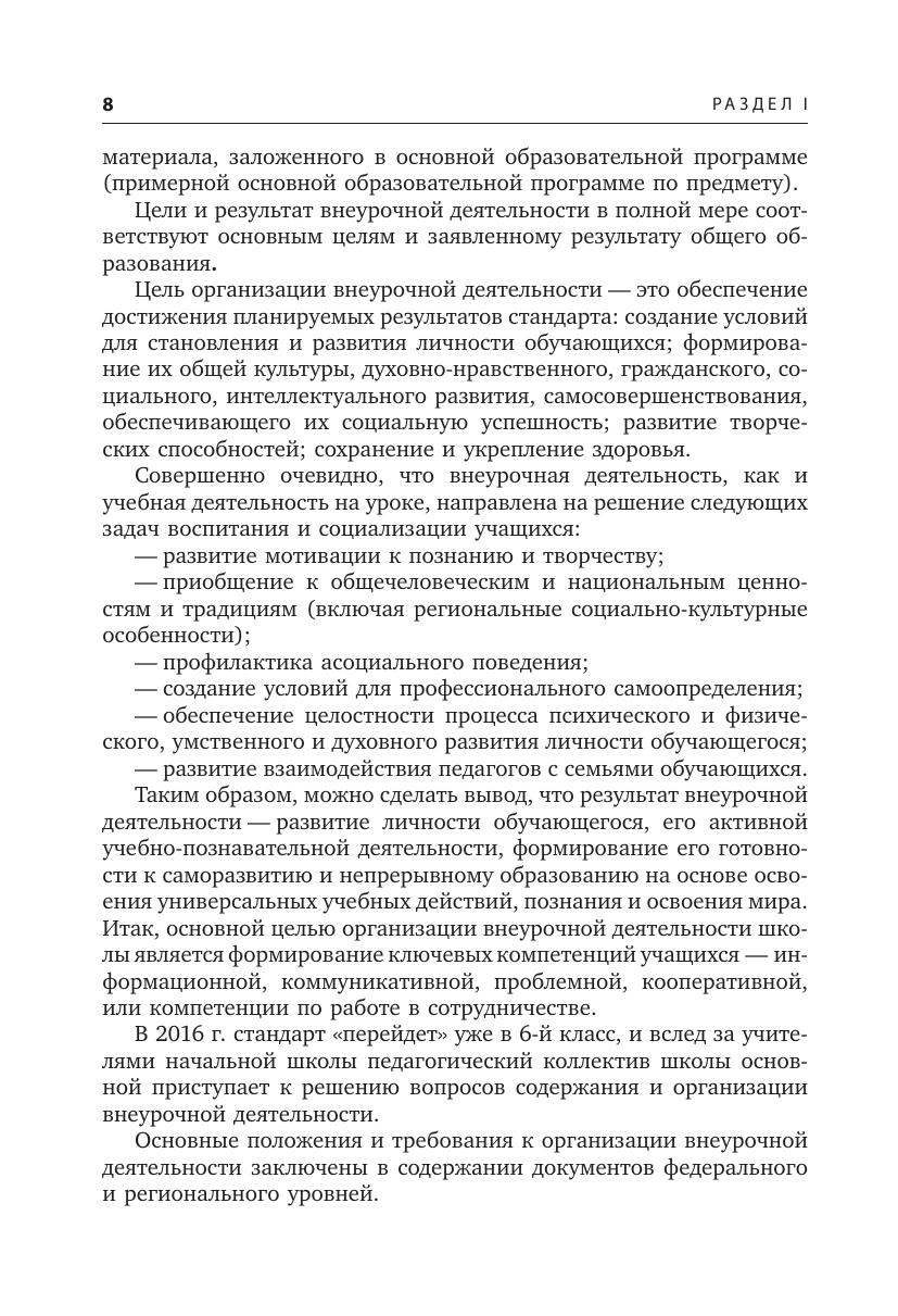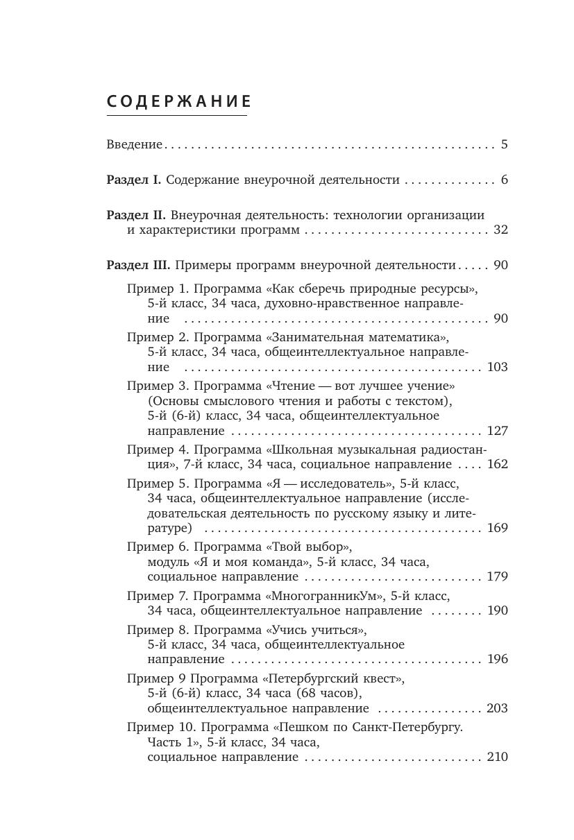 В первом разделе пособия охарактеризованы основные направления внеурочной деятельности и даны ответы на вопросы о том, как создавать насыщенное пространство этой деятельности и как выстраивать линейные и нелинейные внеурочные курсы; а также рассмотрены правила и требования к оформлению программ. Во втором разделе проанализирован практический опыт петербургской школы, в опережающем режиме внедряющей федеральные государственные образовательные стандарты в основной школе: новые технологии и методы организации внеурочных программ, сами инновационные программы. В третьем разделе приведены примеры программ внеурочной деятельности. Пособие подготовлено в помощь педагогу и заместителю руководителя образовательного учреждения.