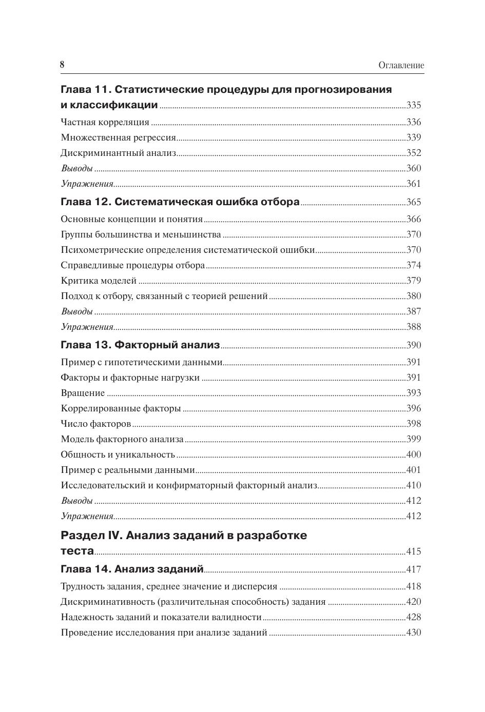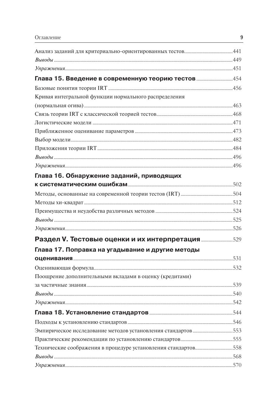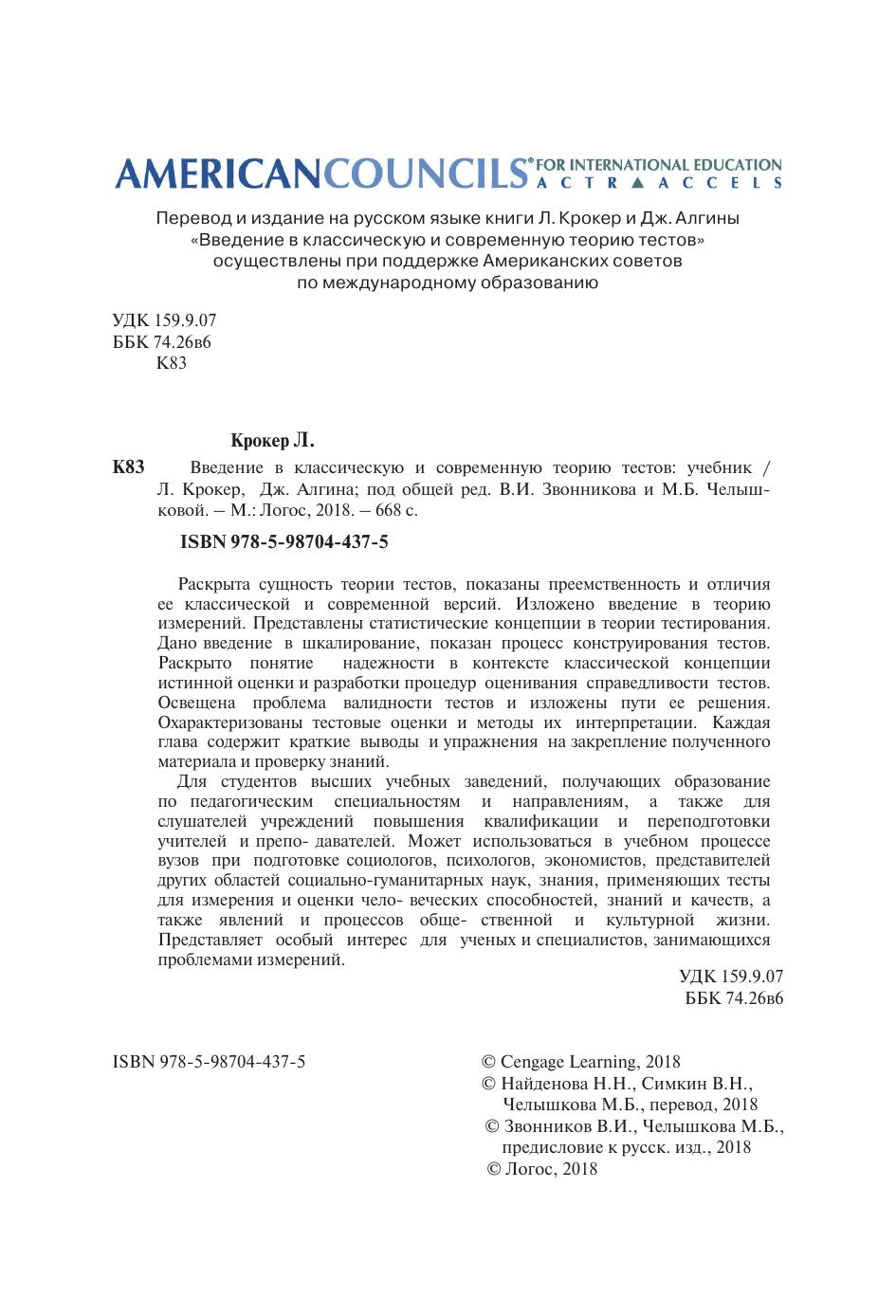 Раскрыта сущность теории тестов, показаны преемственность и отличия ее классической и современной версий. Изложено введение в теорию измерений. Представлены статистические концепции в теории тестирования. Дано введение в шкалирование, показан процесс конструирования тестов. Раскрыто понятие надежности в контексте классической концепции истинной оценки и разработки процедур оценивания справедливости тестов. Освещена проблема валидности тестов и изложены пути ее решения. Охарактеризованы тестовые оценки и методы их интерпретации. Каждая глава содержит краткие выводы и упражнения на закрепление полученного материала и проверку знаний. Для студентов высших учебных заведений, получающих образование по педагогическим специальностям и направлениям, а также для слушателей учреждений повышения квалификации и переподготовки учителей и препо- давателей. Может использоваться в учебном процессе вузов при подготовке социологов, психологов, экономистов, представителей других областей социально- гуманитарных наук, знания, применяющих тесты для измерения и оценки чело- веческих способностей, знаний и качеств, а также явлений и процессов обще- ственной и культурной жизни. Представляет особый интерес для ученых и специалистов, занимающихся проблемами измерений.