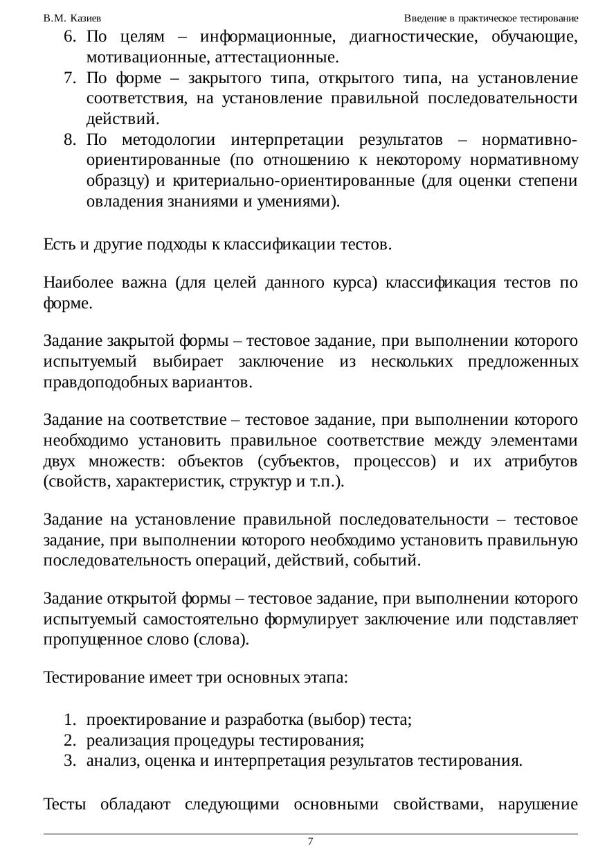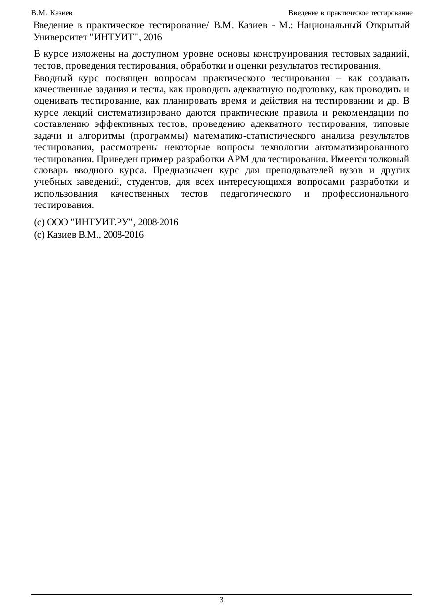 В курсе изложены на доступном уровне основы конструирования тестовых заданий, тестов, проведения тестирования, обработки и оценки результатов тестирования. Вводный курс посвящен вопросам практического тестирования – как создавать качественные задания и тесты, как проводить адекватную подготовку, как проводить и оценивать тестирование, как планировать время и действия на тестировании и др. В курсе лекций систематизировано даются практические правила и рекомендации по составлению эффективных тестов, проведению адекватного тестирования, типовые