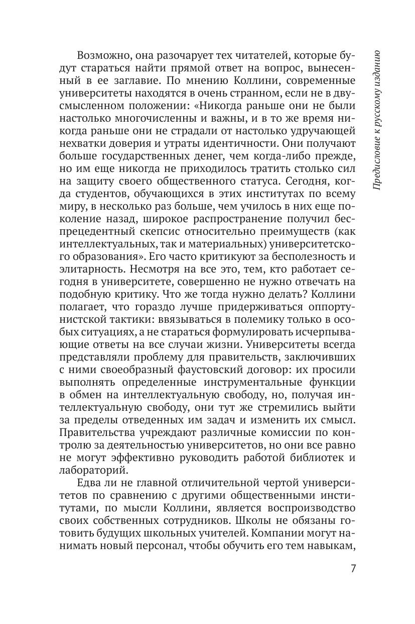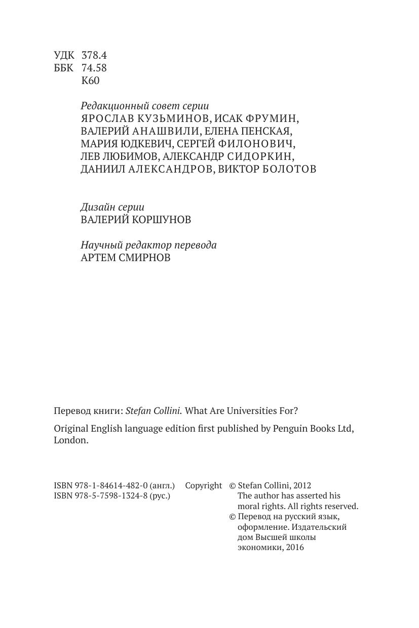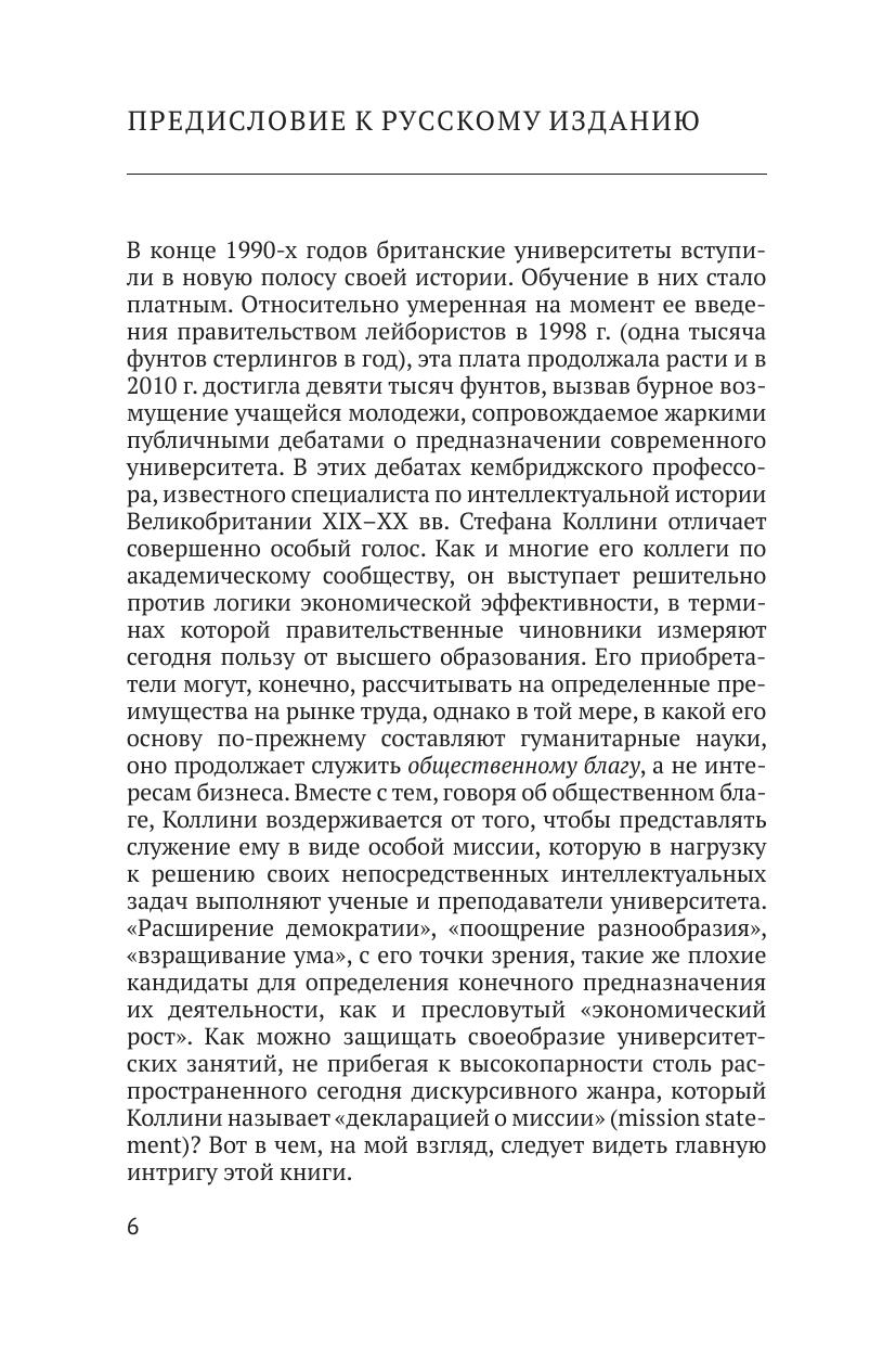 Сегодня во всем мире университетов больше, чем когда-либо прежде. Однако ясное понимание задач университетов отсутствует, и более того, наблюдается скептицизм в отношении их ценности. Известный британский историк идей Стефан Коллини призывает нас к переосмыслению представлений об университетах. Он оспаривает тезис о том, что университеты должны показать: они помогают зарабатывать деньги, чтобы обосновать получение больших денег для себя. Вместо этого он предлагает признать существование различных типов институтов, играющих различные роли. Мы должны осознать, что интеллектуальный поиск — одна из фундаментальных потребностей человека и важнейших функций университетского образования — не может быть ограничен текущими социальными и экономическими задачами.