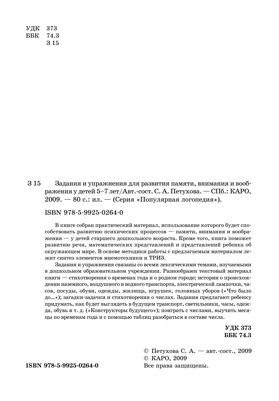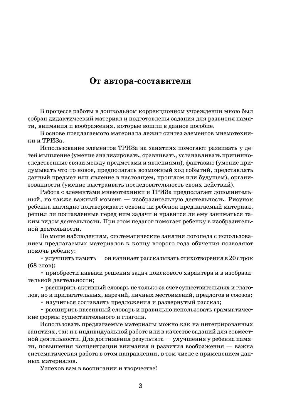 В книге собран практический материал, использование которого будет способствовать развитию психических процессов — памяти, внимания и воображения — у детей старшего дошкольного возраста. Кроме того, книга поможет развитию речи, математических представлений и представлений ребенка об окружающем мире. В основе методики работы с предлагаемым материалом лежит синтез элементов мнемотехники и ТРИЗ.