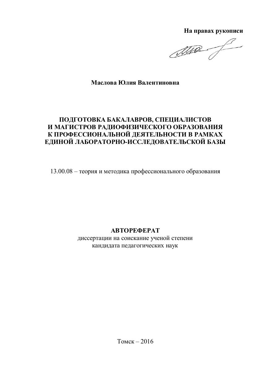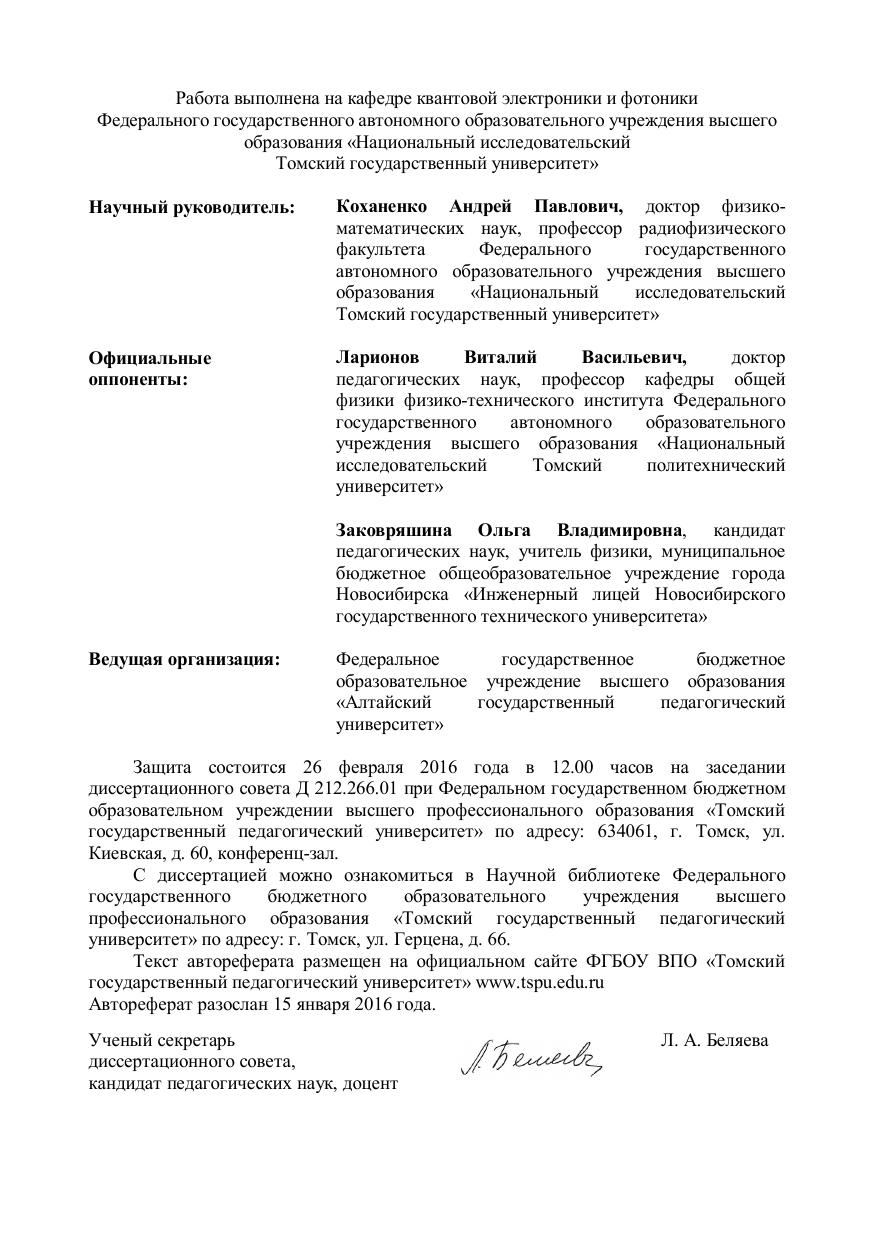 Автореферат диссертации на соискание ученой степени кандидата педагогических наук. Работа выполнена на кафедре квантовой электроники и фотоники Федерального государственного автономного образовательного учреждения высшего образования «Национальный исследовательский Томский государственный университет»