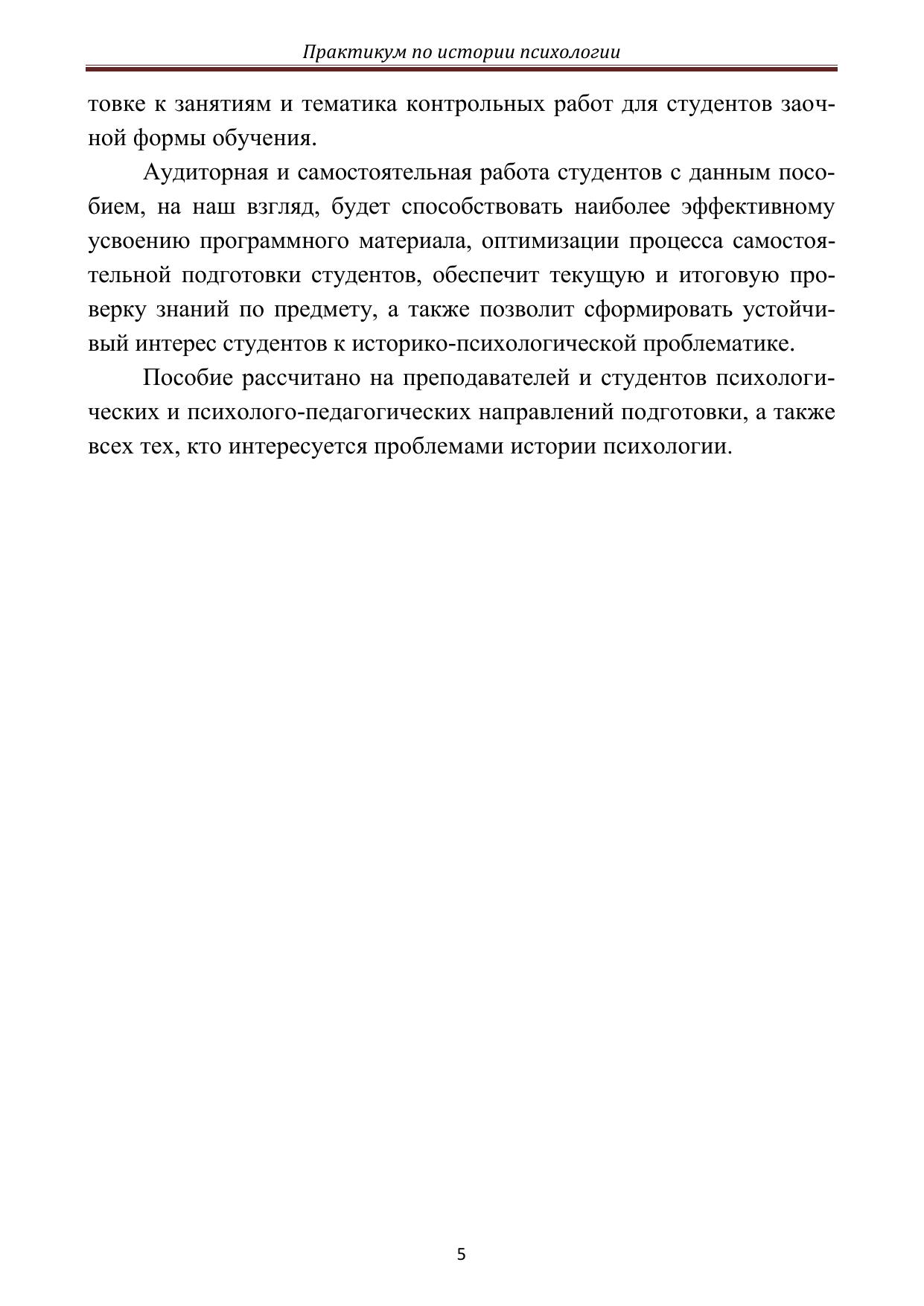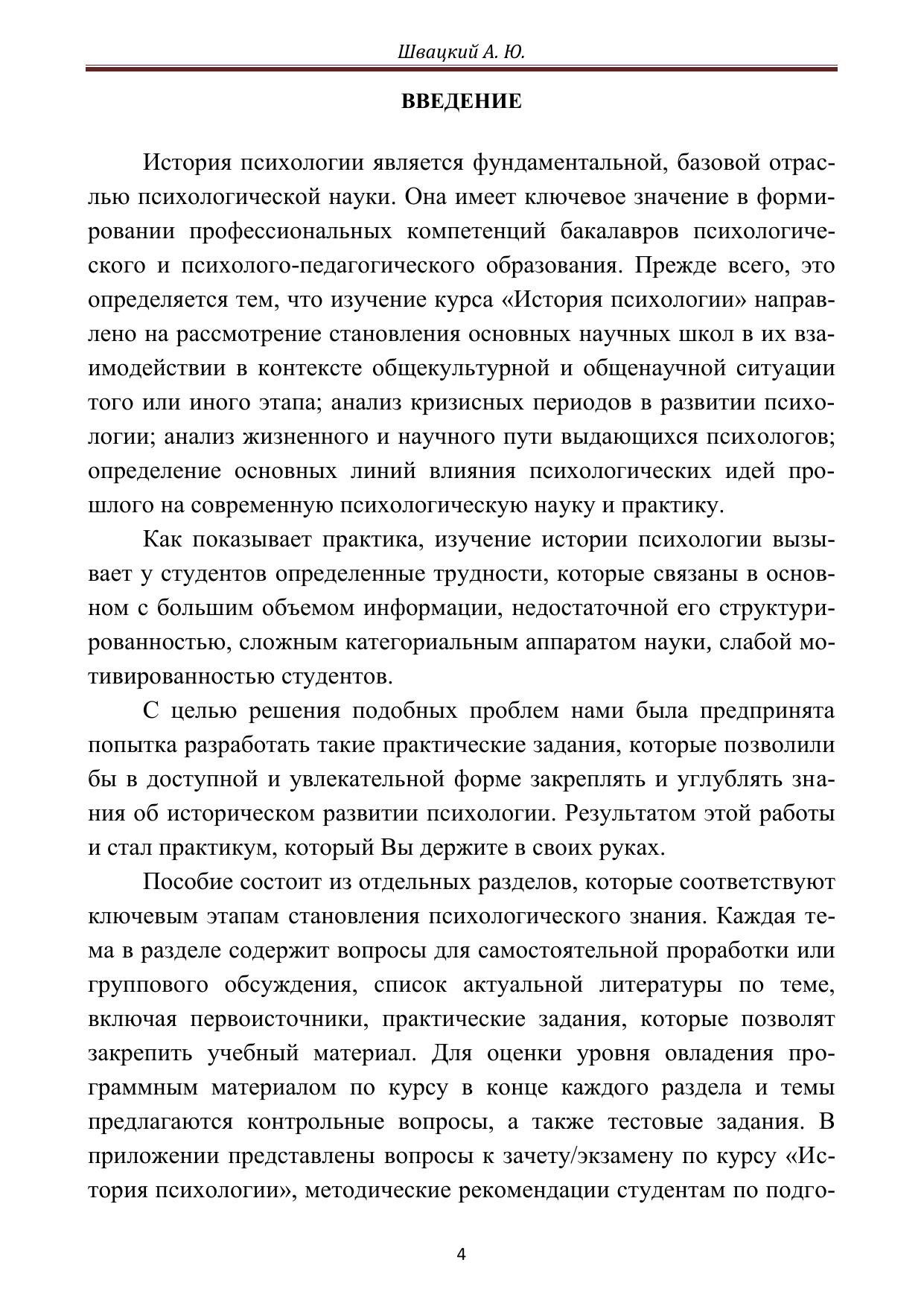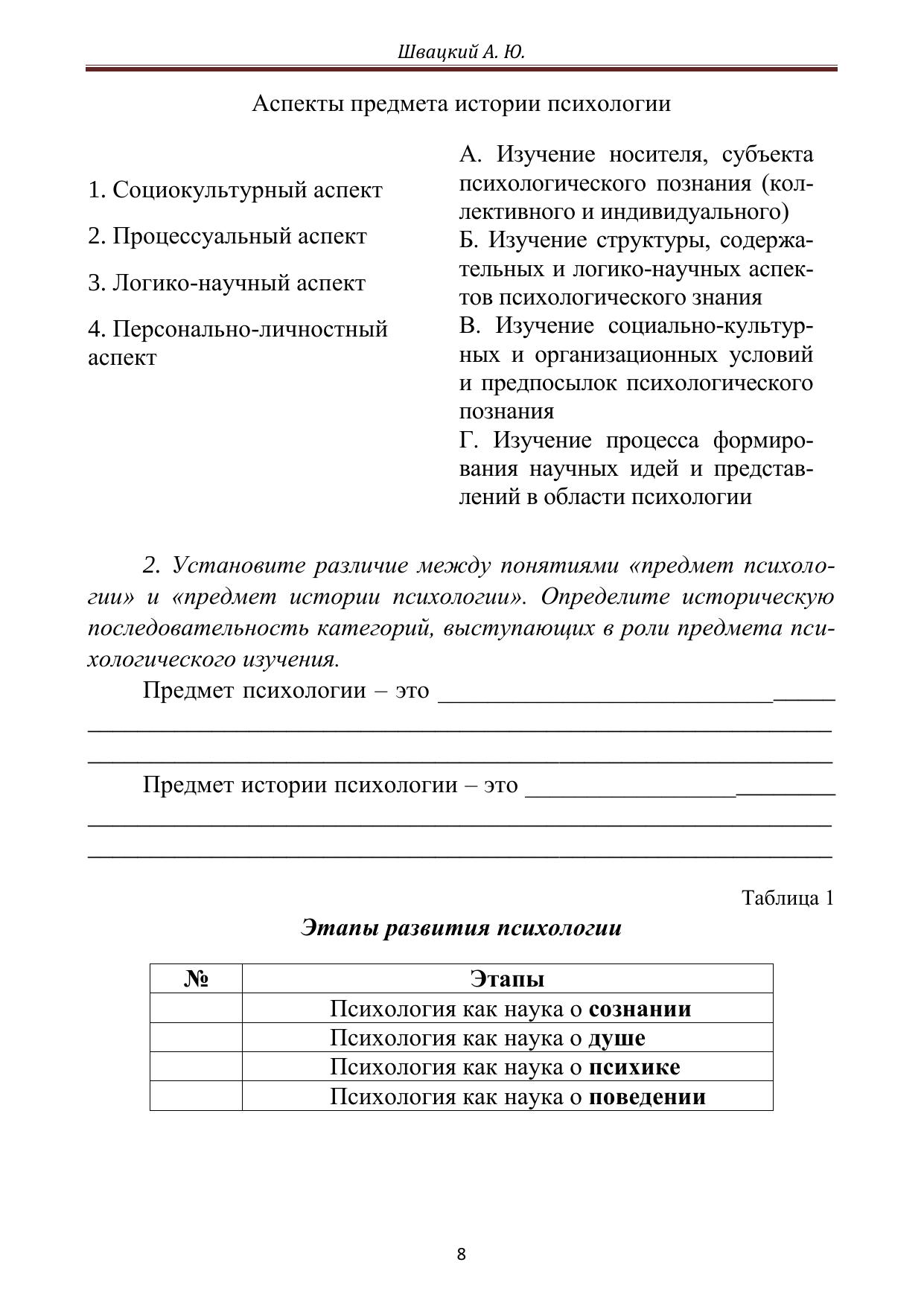 В учебном пособии представлены разнообразные практические и тестовые задания по курсу «История психологии», выполнение которых позволит расширить представления о психологических концепциях и идеях разных исторических периодов, а также проверить степень их понимания. Данное пособие предназначено для студентов психологических и педагогических факультетов вузов, аспирантов, преподавателей, а также будет полезно всем, кто интересуется проблемами истории психологии.