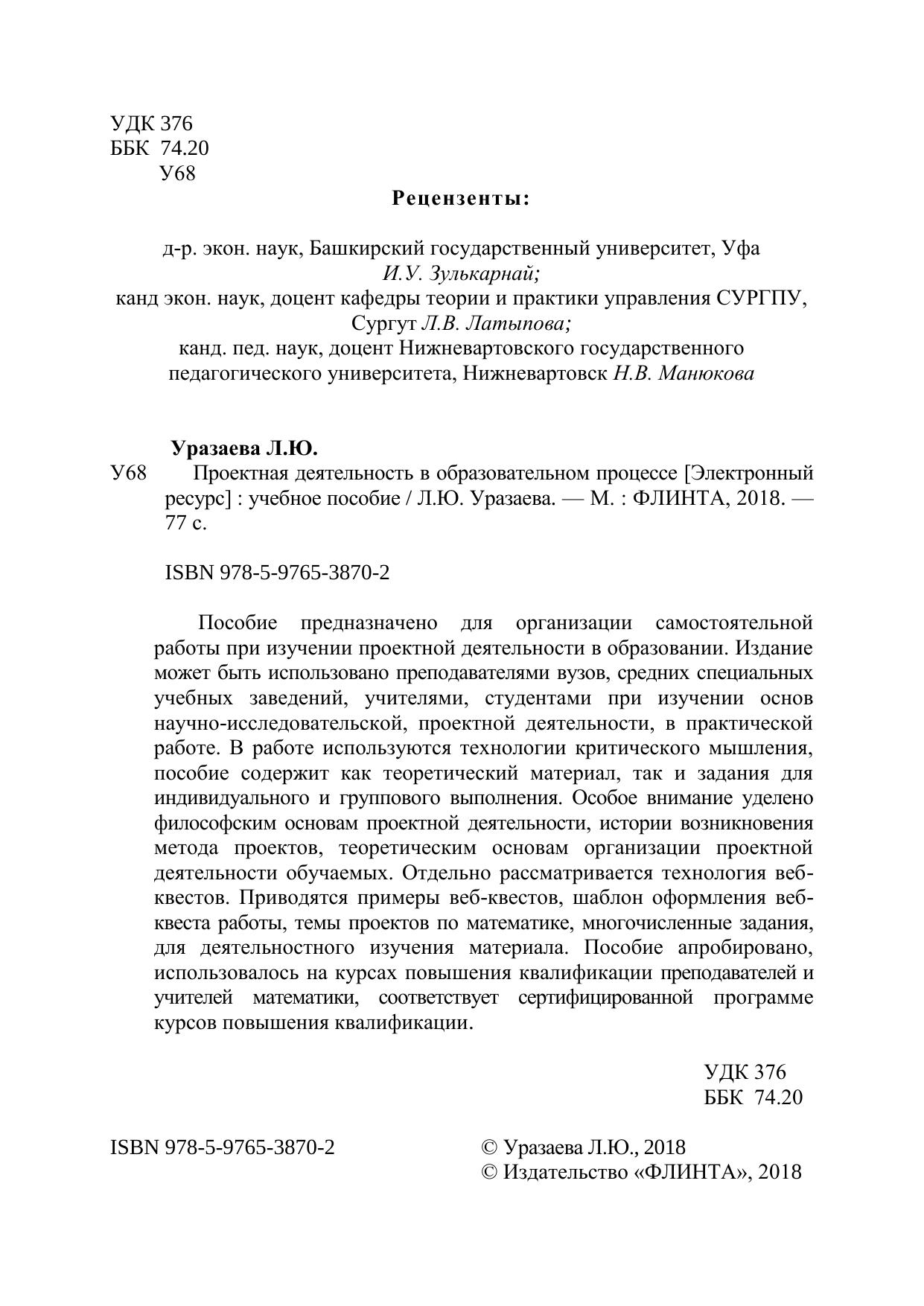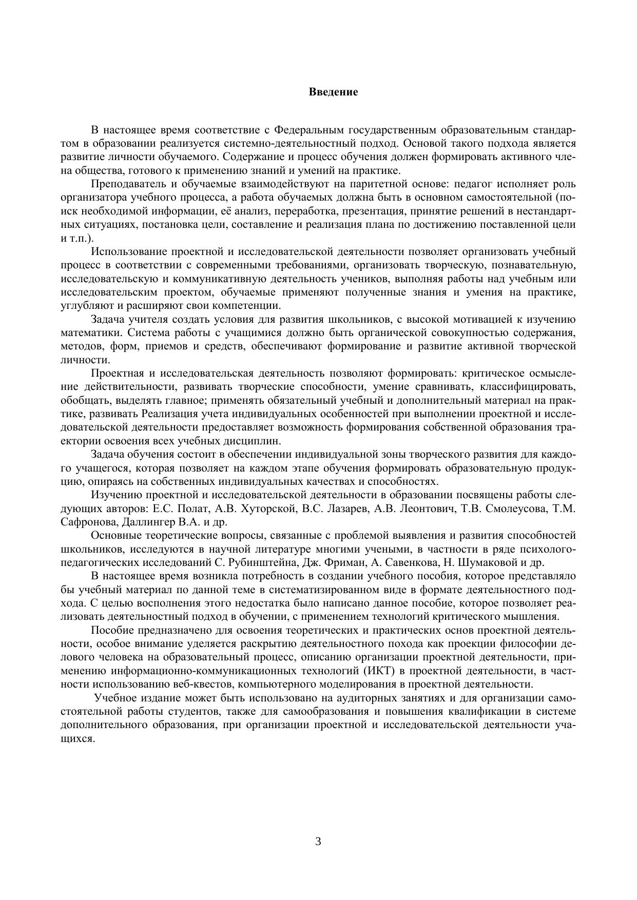 Пособие предназначено для организации самостоятельной работы при изучении проектной деятельности в образовании. Издание может быть использовано преподавателями вузов, средних специальных учебных заведений, учителями, студентами при изучении основ научно-исследовательской, проектной деятельности, в практической работе. В работе используются технологии критического мышления, пособие содержит как теоретический материал, так и задания для индивидуального и группового выполнения. Особое внимание уделено философским основам проектной деятельности, истории возникновения метода проектов, теоретическим основам организации проектной деятельности обучаемых. Отдельно рассматривается технология веб-квестов. Приводятся примеры веб-квестов, шаблон оформления веб-квеста работы, темы проектов по математике, многочисленные задания, для деятельностного изучения материала. Пособие апробировано, использовалось на курсах повышения квалификации преподавателей и учителей математики, соответствует сертифицированной программе курсов повышения квалификации.