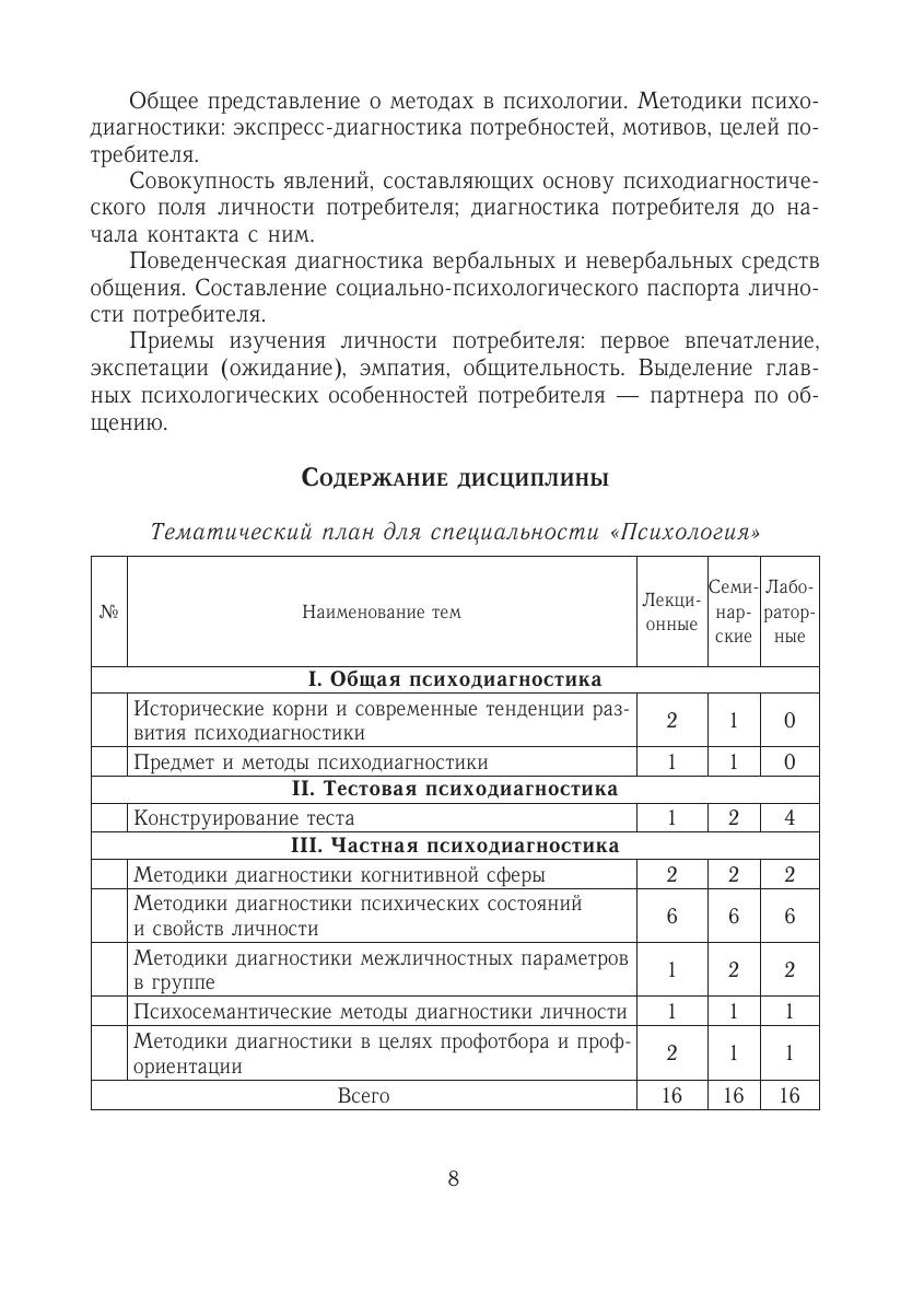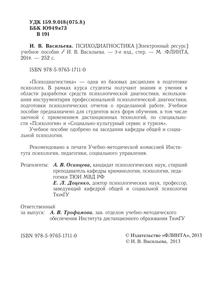 «Психодиагностика» — одна из базовых дисциплин в подготовке психолога. В рамках курса студенты получают знания и умения в области разработки средств психологической диагностики, использования инструментария профессиональной психологической диагностики, подготовки психологических отчетов о проделанной работе. Учебное пособие предназначено для студентов всех форм обучения, в том числе заочной с применением дистанционных технологий, по специальности «Психология» и «Социально-культурный сервис и туризм». Учебное пособие одобрено на заседании кафедры общей и социальной психологии. Рекомендовано к печати Учебно-методической комиссией Института психологии, педагогики, социального управления.
