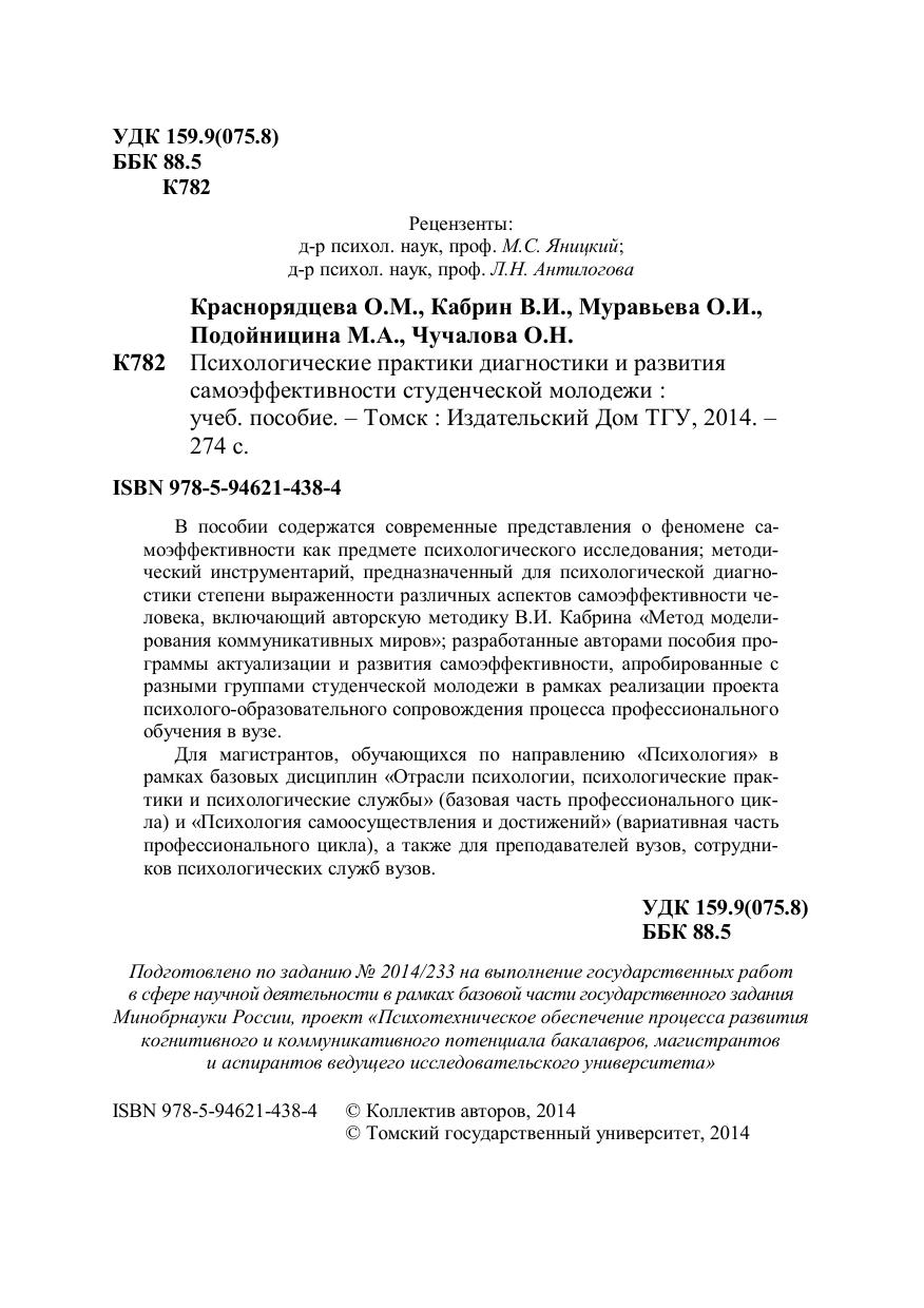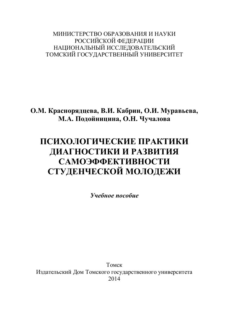 В пособии содержатся современные представления о феномене самоэффективности как предмете психологического исследования, методический инструментарий, предназначенный для психологической диагностики степени выраженности различных аспектов самоэффективности человека, включающий авторскую методику В.И. Кабрина «Метод моделирования коммуникативных миров», разработанные авторами пособия программы актуализации и развития самоэффективности, апробированные с разными группами студенческой молодежи в рамках реализации проекта психолого-образовательного сопровождения процесса профессионального обучения в вузе. Для магистрантов, обучающихся по направлению «Психология» в рамках базовых дисциплин «Отрасли психологии, психологические практики и психологические службы» (базовая часть профессионального цикла) и «Психология самоосуществления и достижений» (вариативная часть профессионального цикла), а также для преподавателей вузов, сотрудников психологических служб вузов. Подготовлено по заданию № 2014/233 на выполнение государственных работ в сфере научной деятельности в рамках базовой части государственного задания Минобрнауки России, проект «Психотехническое обеспечение процесса развития когнитивного и коммуникативного потенциала бакалавров, магистрантов и аспирантов ведущего исследовательского университета»