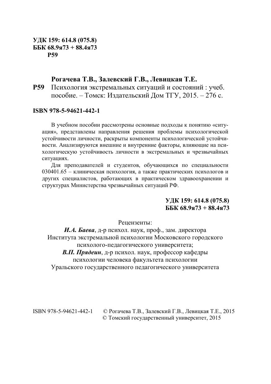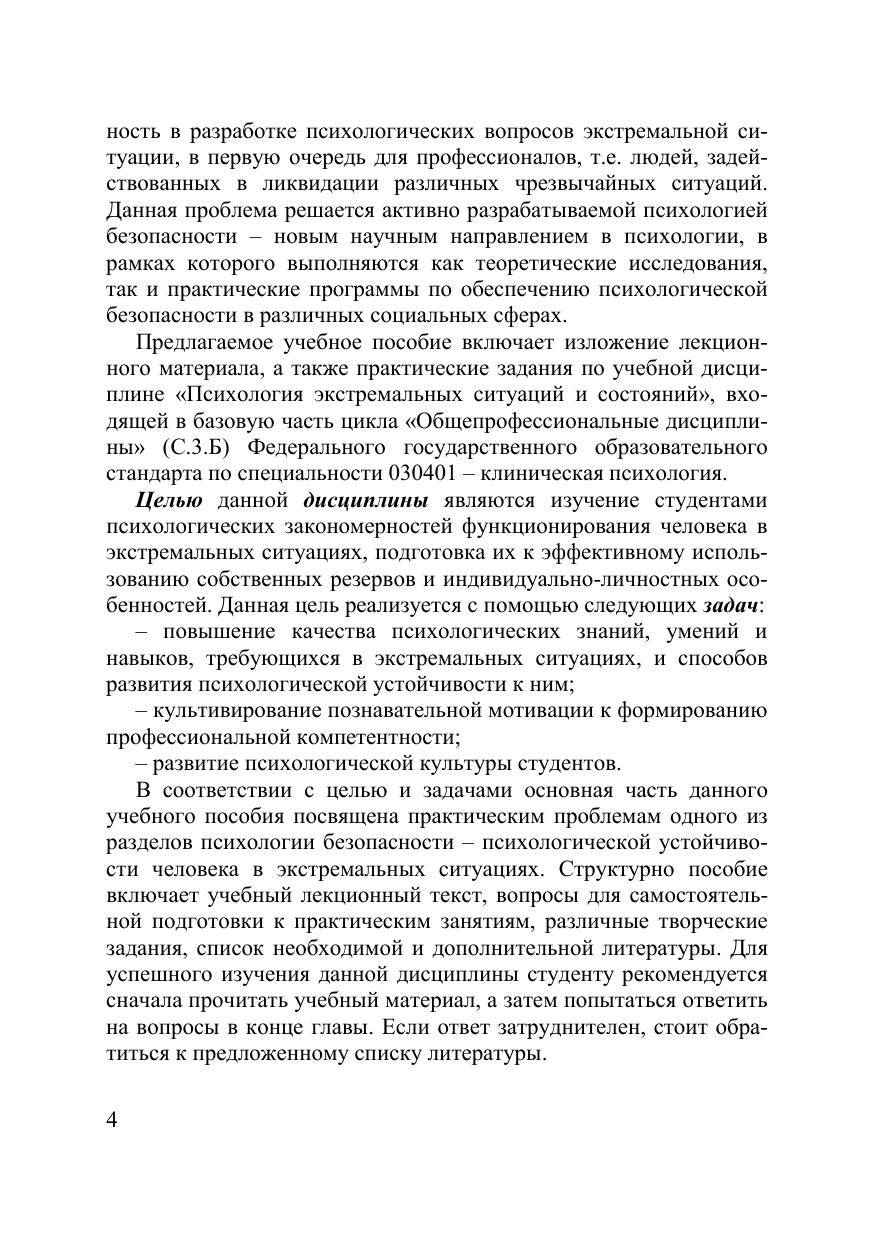 В учебном пособии рассмотрены основные подходы к понятию «ситуация», представлены направления решения проблемы психологической устойчивости личности, раскрыты компоненты психологической устойчивости. Анализируются внешние и внутренние факторы, влияющие на психологическую устойчивость личности в экстремальных и чрезвычайных ситуациях. Для преподавателей и студентов, обучающихся по специальности 030401.65 – клиническая психология, а также практических психологов и других специалистов, работающих в практическом здравоохранении и структурах Министерства чрезвычайных ситуаций РФ