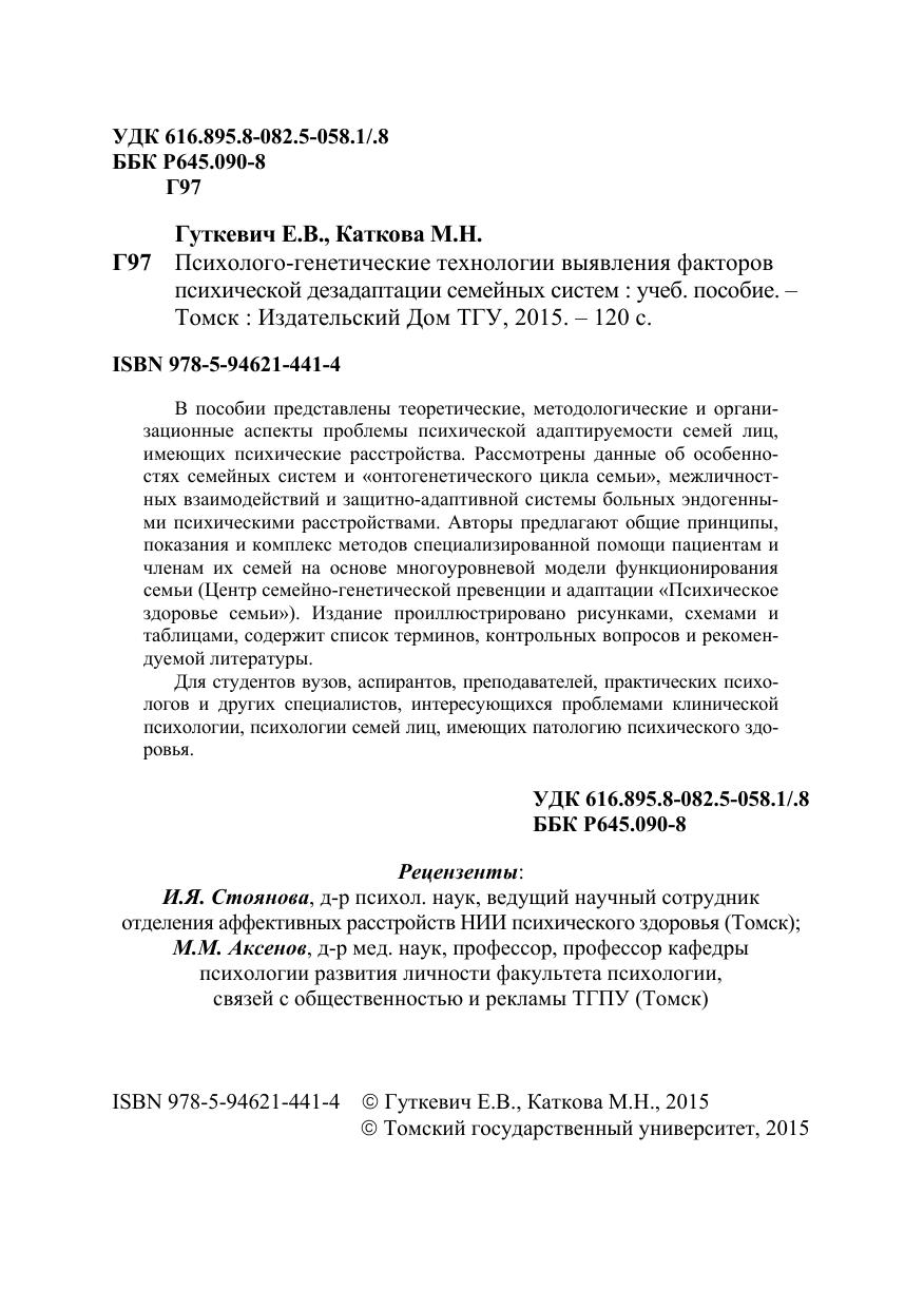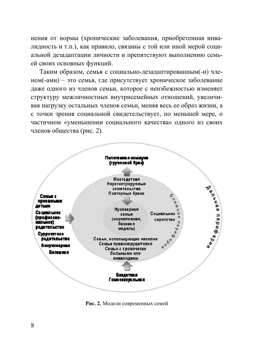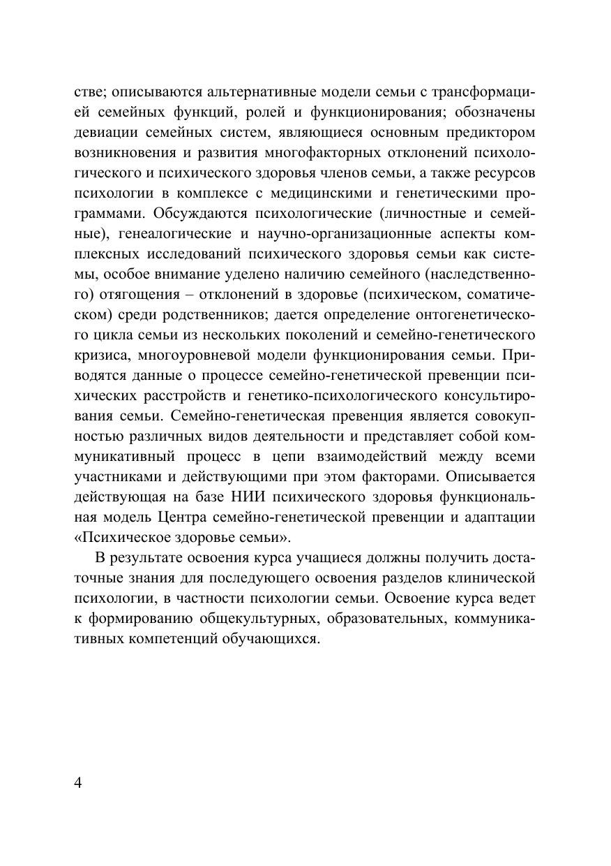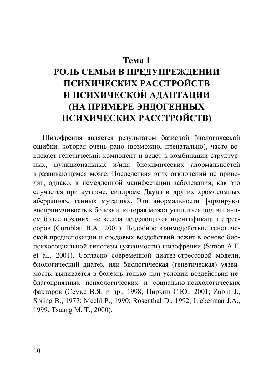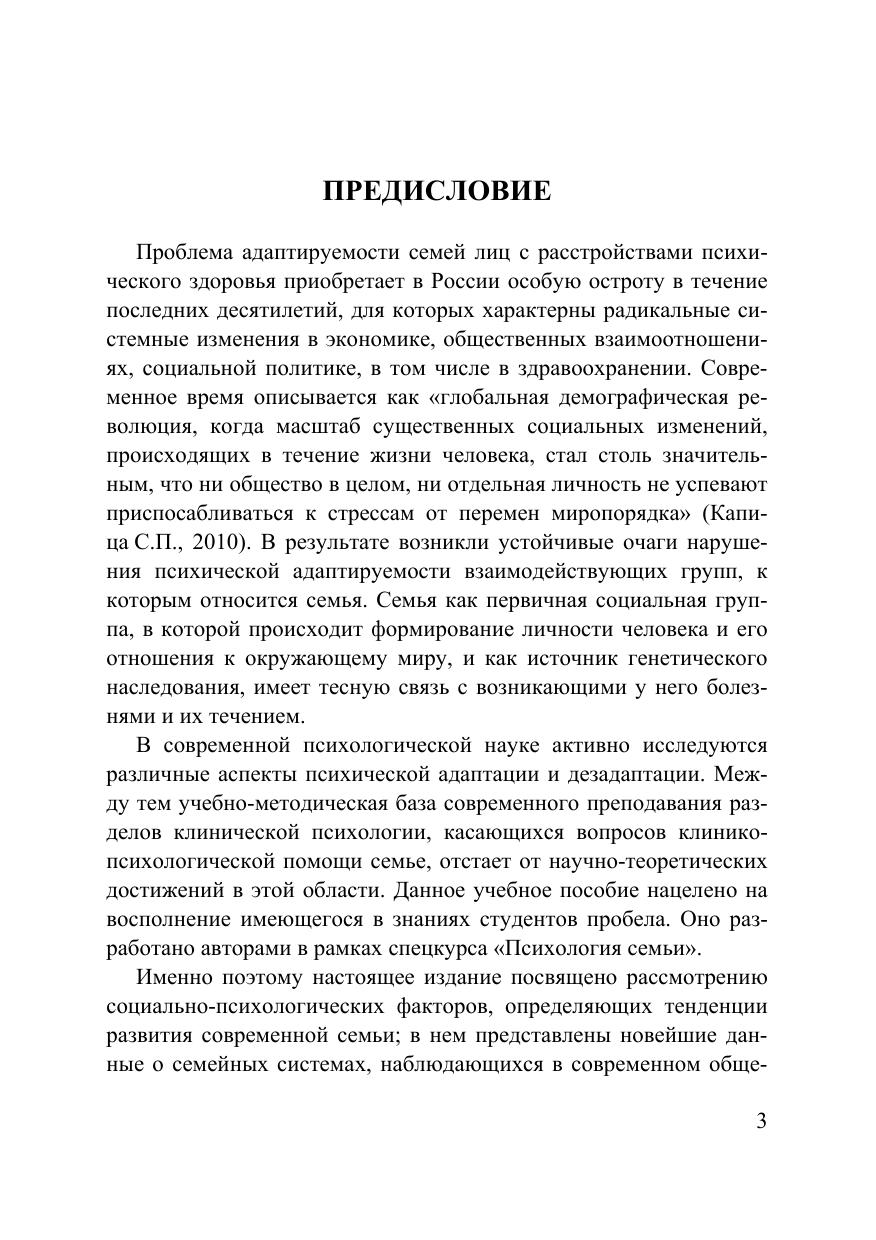 В пособии представлены теоретические, методологические и организационные аспекты проблемы психической адаптируемости семей лиц, имеющих психические расстройства. Рассмотрены данные об особенностях семейных систем и «онтогенетического цикла семьи», межличностных взаимодействий и защитно-адаптивной системы больных эндогенными психическими расстройствами. Авторы предлагают общие принципы, показания и комплекс методов специализированной помощи пациентам и членам их семей на основе многоуровневой модели функционирования семьи (Центр семейно-генетической превенции и адаптации «Психическое здоровье семьи»). Издание проиллюстрировано рисунками, схемами и таблицами, содержит список терминов, контрольных вопросов и рекомендуемой литературы. Для студентов вузов, аспирантов, преподавателей, практических психологов и других специалистов, интересующихся проблемами клинической психологии, психологии семей лиц, имеющих патологию психического здоровья