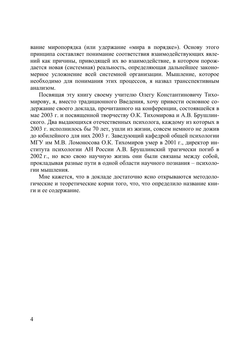 Рассматриваются фундаментальные проблемы психологии, которые открываются в результате анализа «парадигмального сдвига», происходящего в науке, вступающей в стадию постнеклассицизма. Поэтому монографию можно оценить как методологическое введение в постнеклассическую психологию, «вхождение» в которую, по мнению автора, подразумевает смену уровня системности профессионально-психологического мышления. Выделяются признаки нового мышления, которое автор и определил понятием «трансспективный анализ». В призме трансспективного анализа психика человека выступает в необычном ракурсе, а именно как то, что обеспечивает устойчивость человека, понимаемого в качестве открытой системы. Выход за пределы привычного понимания психики как «отражения реальности» требует настолько серьезной перестройки всего образа мира психолога-профессионала, что автор не считает возможным рекомендовать книгу, как это принято, «широкому кругу» коллег. Скорее этой книгой автор возвращает часть своего долга, который накопился у него перед собственными учениками, а также последователями теории психологических систем (ТПС) за 20 лет её разработки.