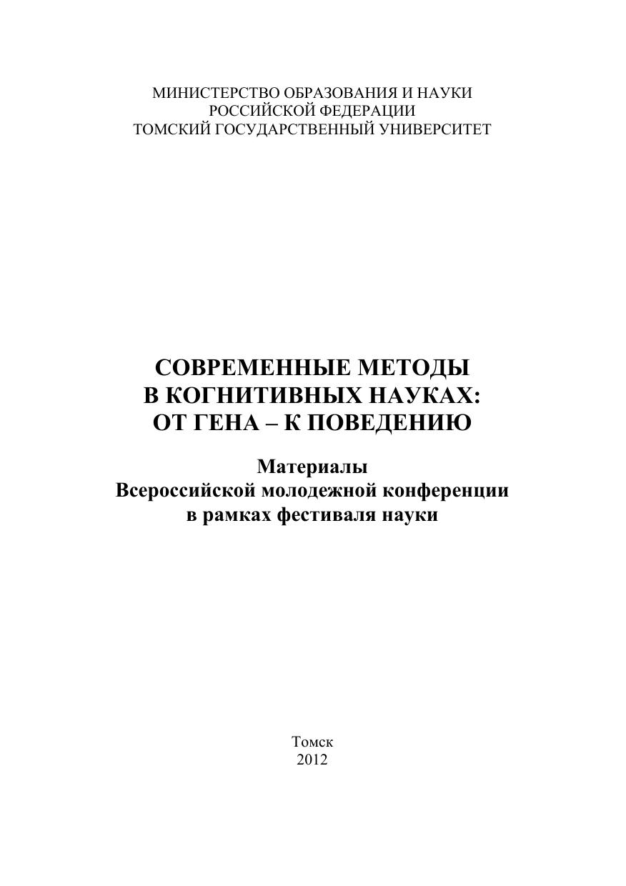 Представлены труды студентов и молодых ученых – участников Всероссийской молодежной конференции «Современные методы в когнитивных науках: от гена – к поведению», состоявшейся в Национальном исследовательском Томском государственном университете в рамках фестиваля науки 19– 20 сентября 2012 года, при финансовой поддержке Министерства образования и науки Российской Федерации (ГК № 14.741.11.0379). Сборник посвящен актуальным проблемам когнитивных исследований и методическим методологическим возможностям организации комплексных исследований в когнитивистике, включает в себя как теоретические, так и эмпирические исследования, выполненные студентами и молодыми учеными Российской Федерации, по основным направлениям когнитивных исследований в русле естественнонаучного и гуманитарного подходов. Для специалистов сферы когнитивных исследований, в том числе психологов, психофизиологов, педагогов, философов, а также всех интересующихся проблемами развития когнитивных наук.
