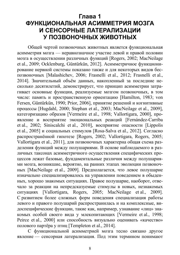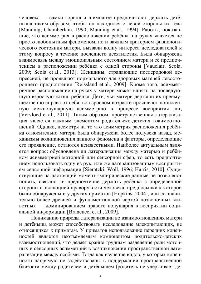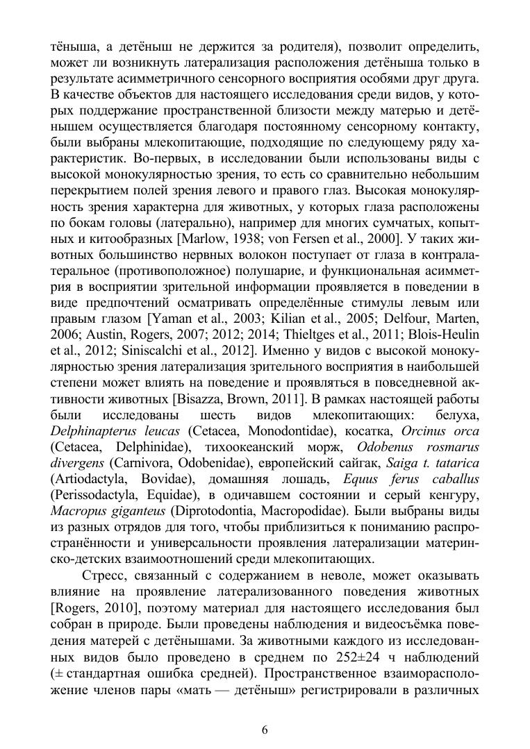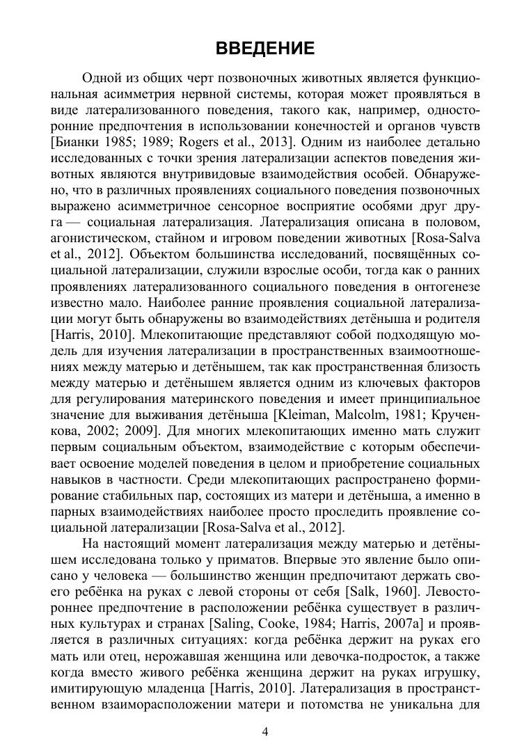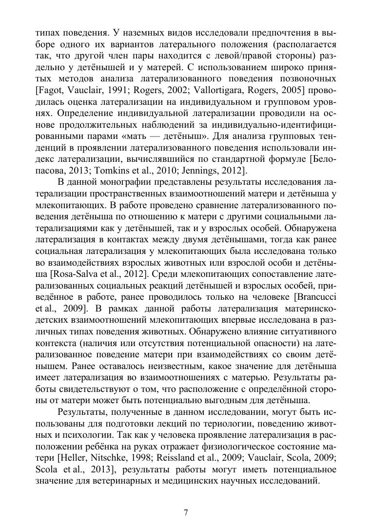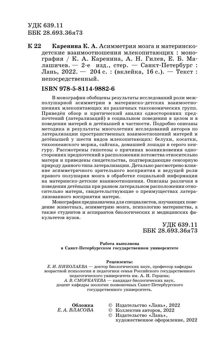 В монографии обобщены результаты исследований роли межполушарной асимметрии в материнско-детских взаимоотношениях млекопитающих из различных таксономических групп. Приведён обзор и критических анализ односторонних предпочтений, латерализаций, в социальном поведении в целом и в поведении матерей и детёнышей в частности. Подробно описаны методика и результаты многолетних исследований авторов по латерализации пространственных взаимоотношений матерей и детёнышей у шести видов млекопитающих: белухи, косатки, тихоокеанского моржа, сайгака, домашней лошади и серого кенгуру. Рассмотрены гипотезы о причинах возникновения односторонних предпочтений в расположении потомства относительно матери и приведены свидетельства, подтверждающие сенсорную природу данного типа латерализации. Детально рассмотрено влияние асимметричного зрительного восприятия и ведущей роли правого полушария мозга в обработке социальной информации на материнско-детские взаимоотношения. Описаны различия в поведении детёныша при разном латеральном расположении относительно матери, свидетельствующие о преимуществах латерализованного восприятия матери.