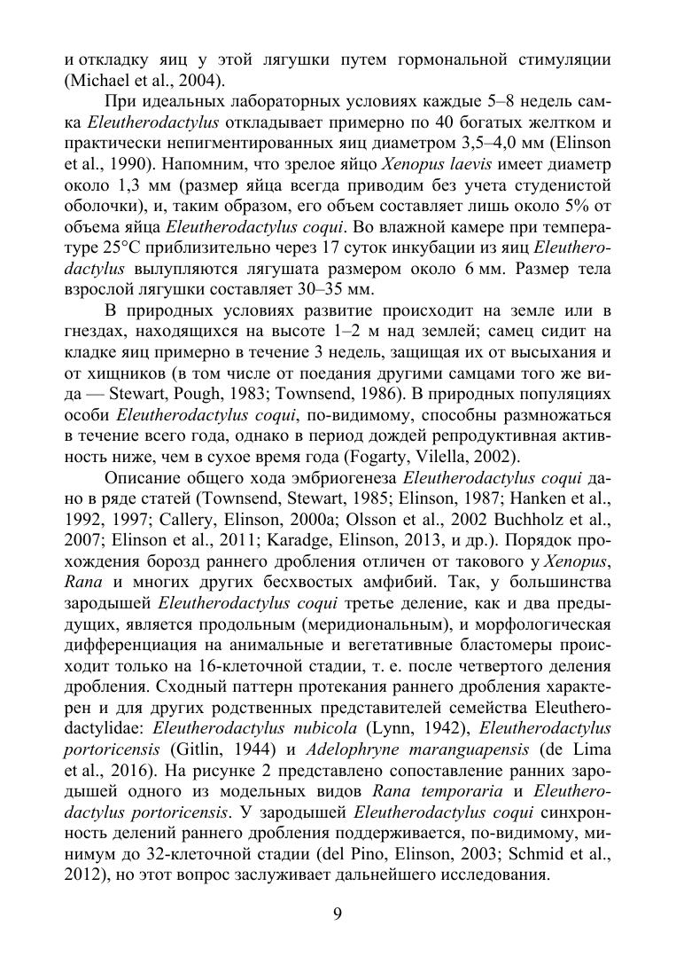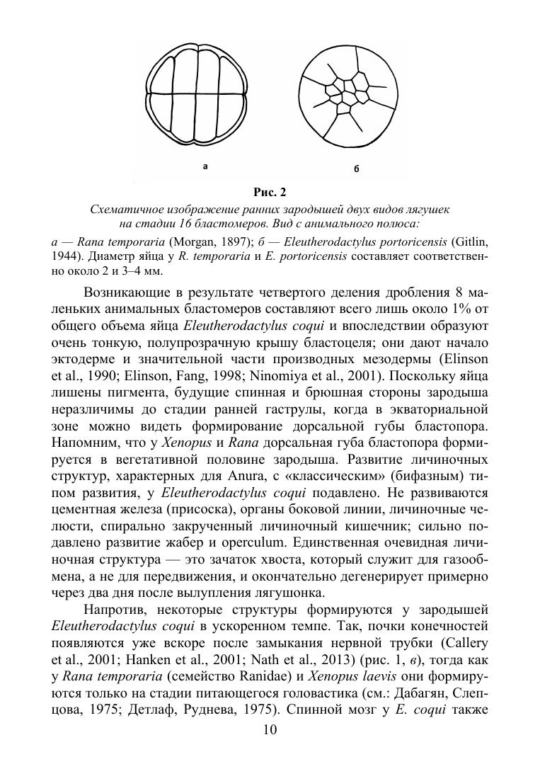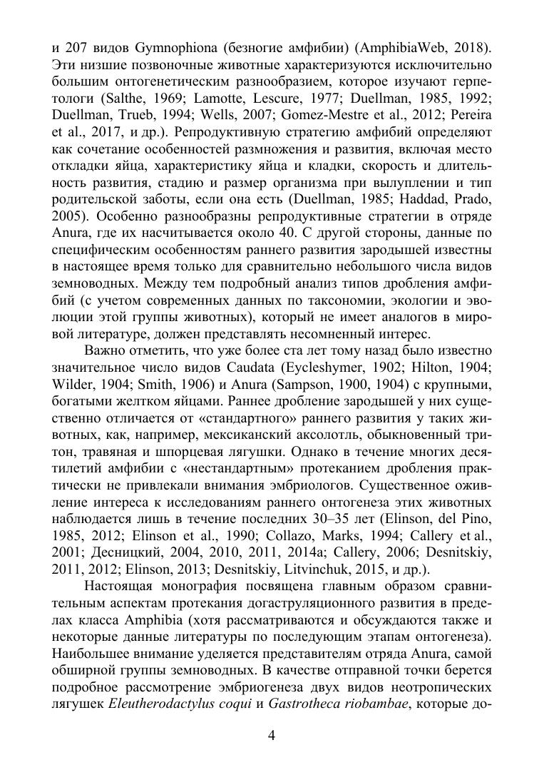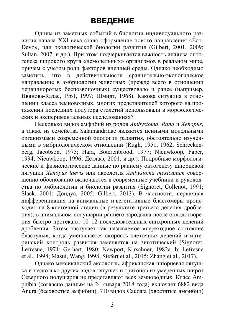 В монографии анализируются сравнительные, эволюционные и экологические аспекты эволюционных преобразований раннего эмбриогенеза в классе амфибий. Критически обсуждаются литературные данные по онтогенетическому разнообразию и начальным (догаструляционным) стадиям эмбрионального развития у представителей различных семейств отряда Anura (прежде всего Eleutherodactylidae, Hemiphractidae, Myobatrachidae, Rhinodermatidae), для которых характерно протекание процессов размножения и эмбрионального развития вне воды. Рассмотрены особенности раннего онтогенеза у представителей разных семейств отряда Caudata (прежде всего Plethodontidae, у которых многие виды полностью утратили связь с водной средой, Ambystomatidae и Salamandridae). Представлены подробный обзор и классификация типов (паттернов) дробления зародышей в классе амфибий. Выявлены эволюционные тенденции преобразований раннего эмбриогенеза у Anura и Caudata. Проведен филогенетический анализ процесса дробления в отряде хвостатых амфибий.