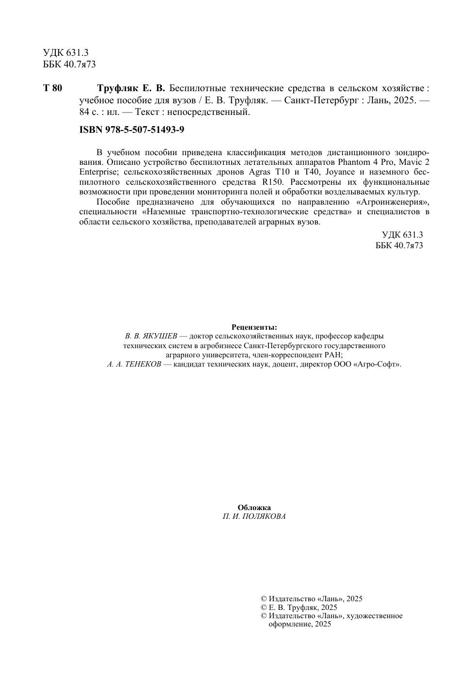 В учебном пособии приведена классификация методов дистанционного зондирования. Описано устройство беспилотных летательных аппаратов Phantom 4 Pro, Mavic 2 Enterprise, сельскохозяйственных дронов Agras T10 и T40, Joyance и наземного беспилотного сельскохозяйственного средства R150. Рассмотрены их функциональные возможности при проведении мониторинга полей и обработки возделываемых культур. Пособие предназначено для обучающихся по направлению «Агроинженерия», специальности «Наземные транспортно-технологические средства», и специалистов в области сельского хозяйства, преподавателей аграрных вузов.