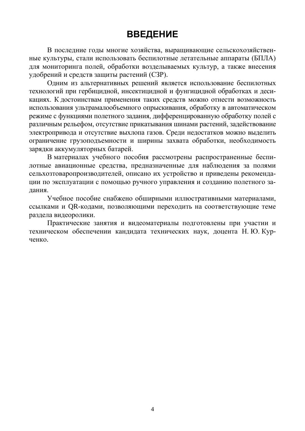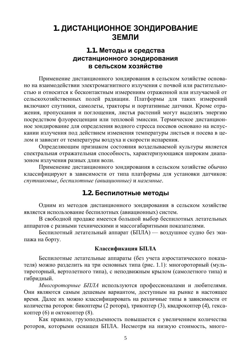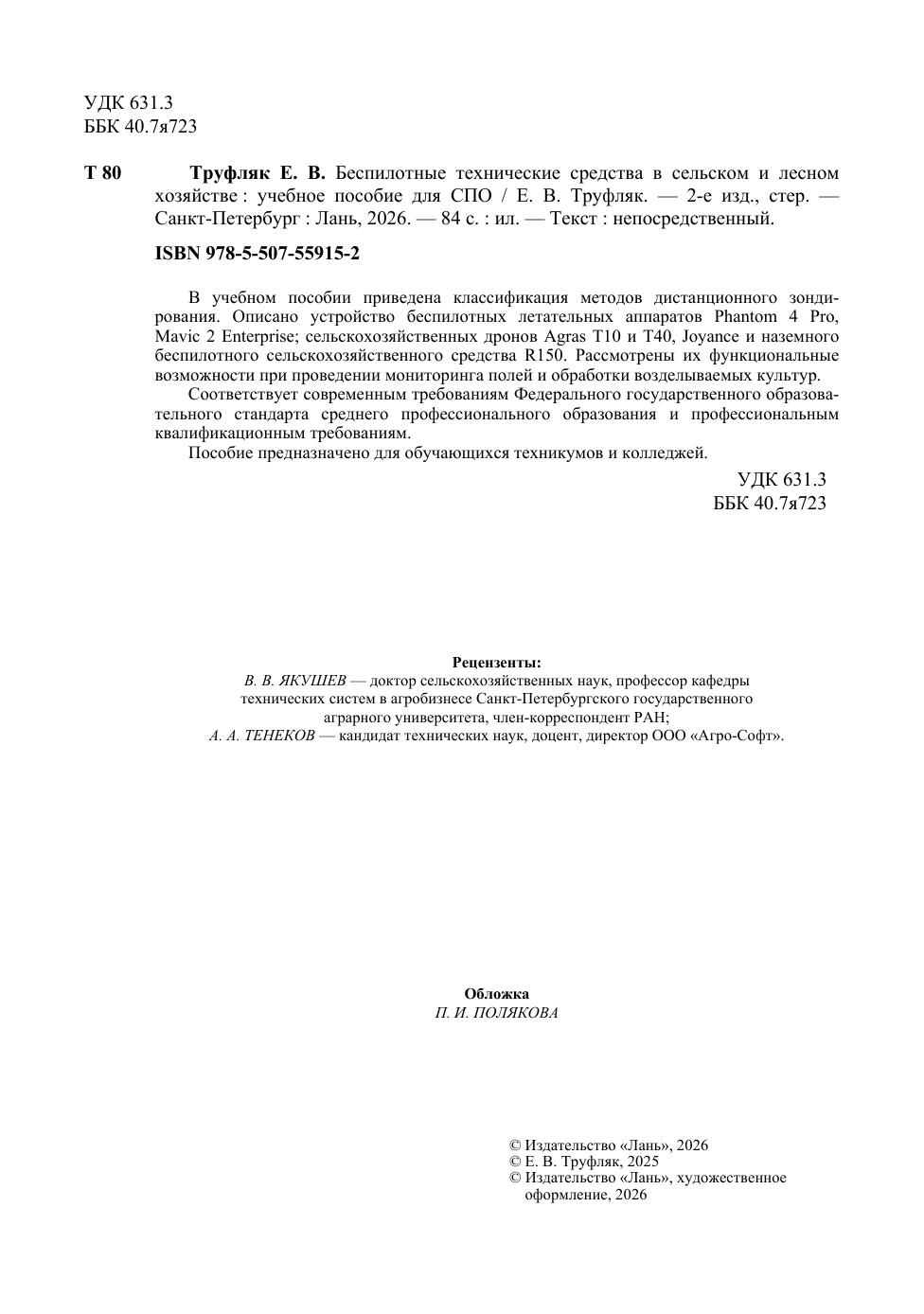 В учебном пособии приведена классификация методов дистанционного зондирования. Описано устройство беспилотных летательных аппаратов Phantom 4 Pro, Mavic 2 Enterprise, сельскохозяйственных дронов Agras T10 и T40, Joyance и наземного беспилотного сельскохозяйственного средства R150. Рассмотрены их функциональные возможности при проведении мониторинга полей и обработки возделываемых культур. Пособие предназначено для обучающихся техникумов и колледжей. Соответствует современным требованиям Федерального государственного образовательного стандарта среднего профессионального образования и профессиональным квалификационным требованиям.