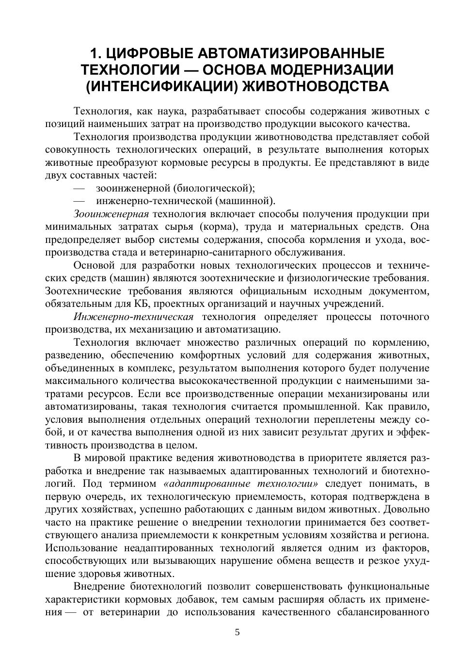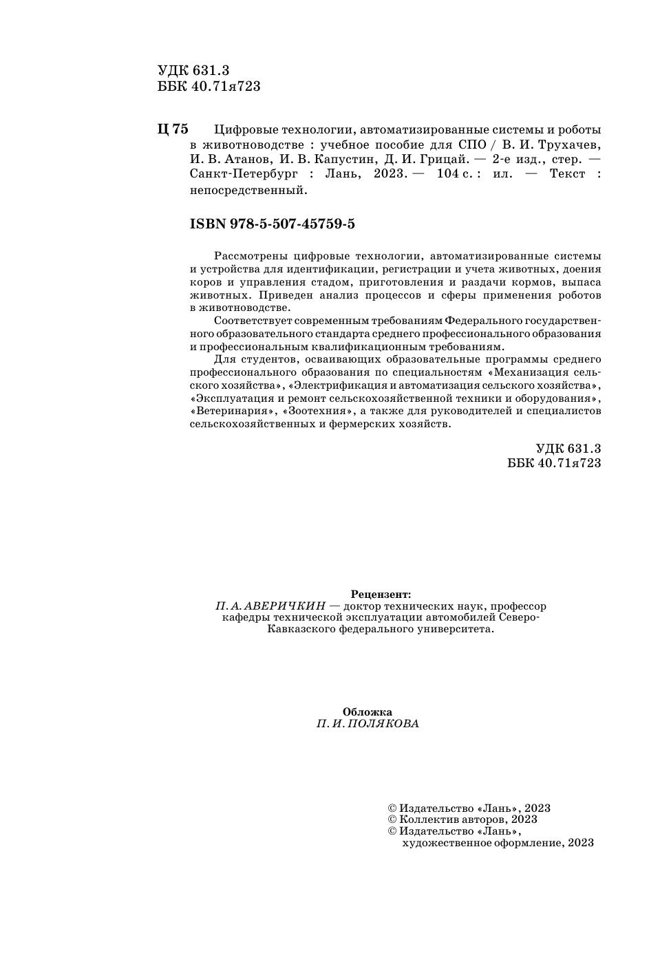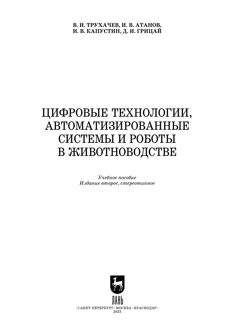 Рассмотрены цифровые технологии, автоматизированные системы и устройства, для идентификации, регистрации и учета животных, доения коров и управления стадом, приготовления и раздачи кормов, выпаса животных. Приведен анализ процессов и сферы применения роботов в животноводстве. Соответствует современным требованиям Федерального государственного образовательного стандарта среднего профессионального образования и профессиональным квалификационным требованиям. Для студентов, осваивающих образовательные программы среднего профессионального образования по специальностям «Механизация сельского хозяйства», «Электрификация и автоматизация сельского хозяйства», «Эксплуатация и ремонт сельскохозяйственной техники и оборудования», «Ветеринария», «Зоотехния», а также для руководителей и специалистов сельскохозяйственных и фермерских хозяйств.