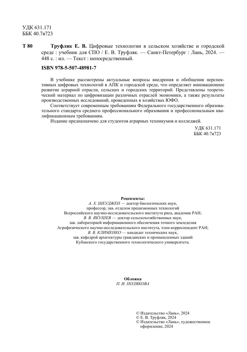 В учебнике рассмотрены актуальные вопросы внедрения и обобщения перспективных цифровых технологий в АПК и городской среде, что определяет инновационное развитие аграрной отрасли, сельских и городских территорий. Представлены теоретический материал по цифровизации различных отраслей экономики, а также результаты производственных исследований, проведенных в хозяйствах ЮФО. Соответствует современным требованиям Федерального государственного образовательного стандарта среднего профессионального образования и профессиональным квалификационным требованиям. Издание предназначено для студентов аграрных техникумов и колледжей.
