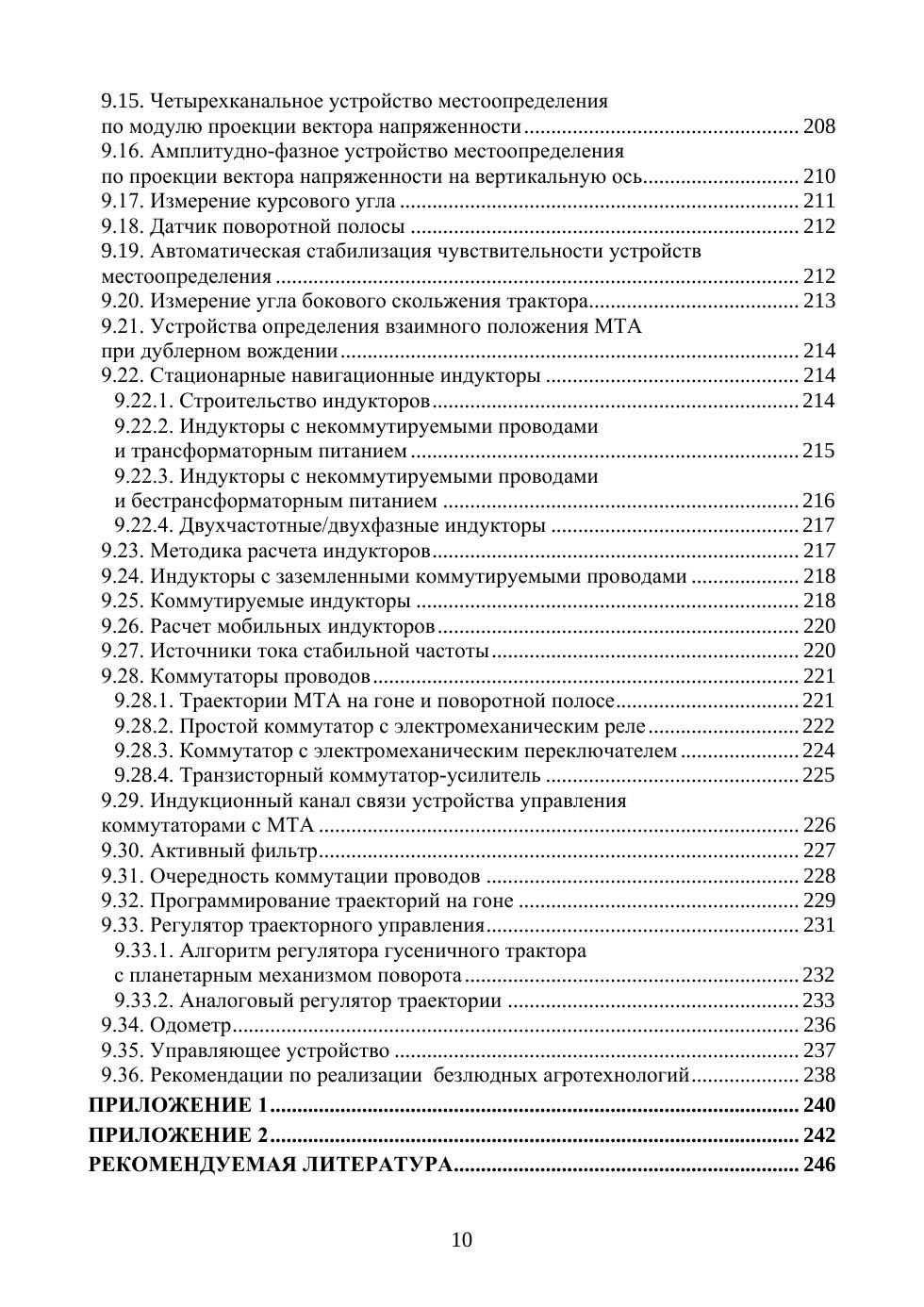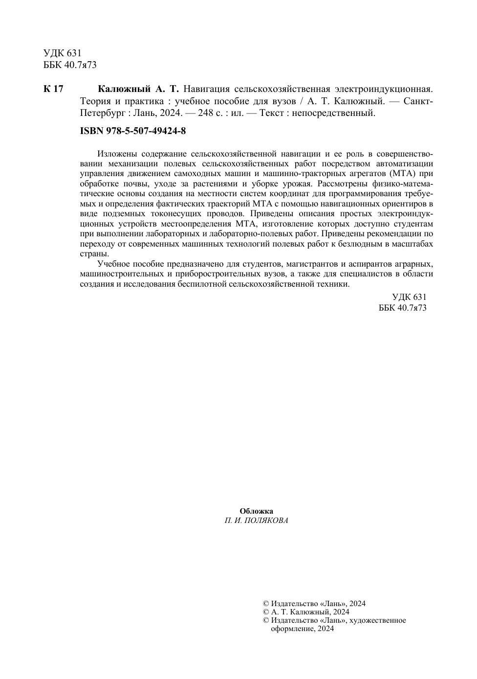 Изложены содержание сельскохозяйственной навигации и ее роль в совершенствовании механизации полевых сельскохозяйственных работ посредством автоматизации управления движением самоходных машин и машинно-тракторных агрегатов (МТА) при обработке почвы, уходе за растениями и уборке урожая. Рассмотрены физико-математические основы создания на местности систем координат для программирования требуемых и определения фактических траекторий МТА с помощью навигационных ориентиров в виде подземных токонесущих проводов. Приведены описания простых электроиндукционных устройств местоопределения МТА, изготовление которых доступно студентам при выполнении лабораторных и лабораторно-полевых работ. Приведены рекомендации по переходу от современных машинных технологий полевых работ к безлюдным в масштабах страны. Учебное пособие предназначено для студентов, магистрантов и аспирантов аграрных, машиностроительных и приборостроительных вузов, а также для специалистов в области создания и исследования беспилотной сельскохозяйственной техники.