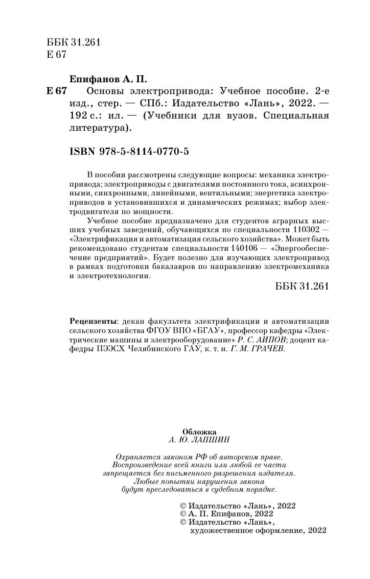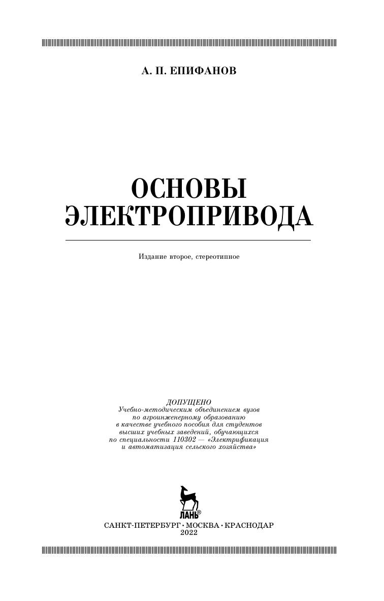 В пособии рассмотрены следующие вопросы: механика электропривода, электроприводы с двигателями постоянного тока, асинхронными, синхронными, линейными, вентильными, энергетика электроприводов в установившихся и динамических режимах, выбор электродвигателя по мощности. Учебное пособие предназначено для студентов аграрных высших учебных заведений, обучающихся по специальности 110302 — «Электрификация и автоматизация сельского хозяйства». Может быть рекомендовано студентам специальности 140106 — «Энергообеспечение предприятий». Будет полезно для изучающих электропривод в рамках подготовки бакалавров по направлению электромеханика и электротехнологии.