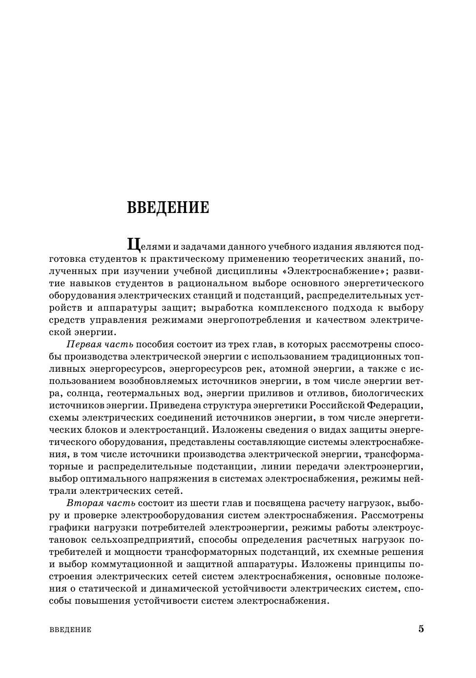 Учебное пособие представляет собой систематизированное изложение основных разделов курса «Электроснабжение» с учетом современных достижений в области энергосбережения в энергетике России и состоит из двух частей. В первой части приводятся общие сведения об электроэнергетике. Материал части разделен на три главы по принципу «производство — преобразование — особенности исполнения способов передачи электроэнергии». Материал второй части разделен на шесть глав и посвящен вопросам проектирования и оптимизации систем электроснабжения, а также экономической оценке принимаемых технических решений. Каждая глава содержит теоретические сведения и примеры расчета объектов энергосистем. Описываются общепринятые и перспективные направления развития технологий энергосбережения. Учебный материал пособия соответствует государственному общеобразовательному стандарту по направлению «Агроинженерия» при подготовке бакалавров. Также пособие может быть полезно студентам электротехнических специальностей, изучающим электроснабжение как учебную дисциплину, и специалистам-практикам широкого профиля деятельности.