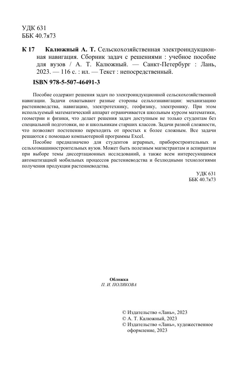 Пособие содержит решения задач по электроиндукционной сельскохозяйственной навигации. Задачи охватывают разные стороны сельхознавигации: механизацию растениеводства, навигацию, электротехнику, геофизику, электронику. При этом используемый математический аппарат ограничивается школьным курсом математики, геометрии и физики, что делает решения задач доступным не только студентам без специальной подготовки, но и школьникам старших классов. Задачи разной сложности, что позволяет постепенно переходить от простых к более сложным. Все задачи решаются с помощью компьютерной программы Excel. Пособие предназначено для студентов аграрных, приборостроительных и сельхозмашиностроительных вузов. Может быть полезным магистрантам и аспирантам при выборе темы диссертационных исследований, а также всем интересующимся автоматизацией мобильных процессов растениеводства и безлюдными технологиями получения продукции растениеводства.