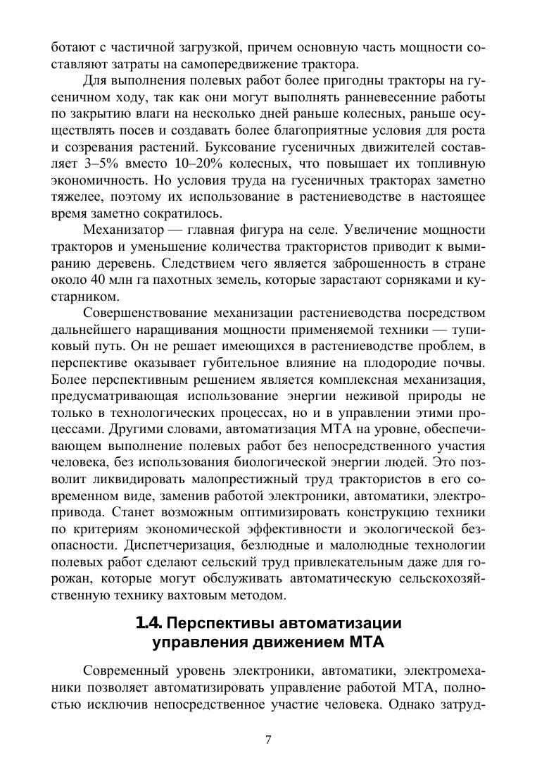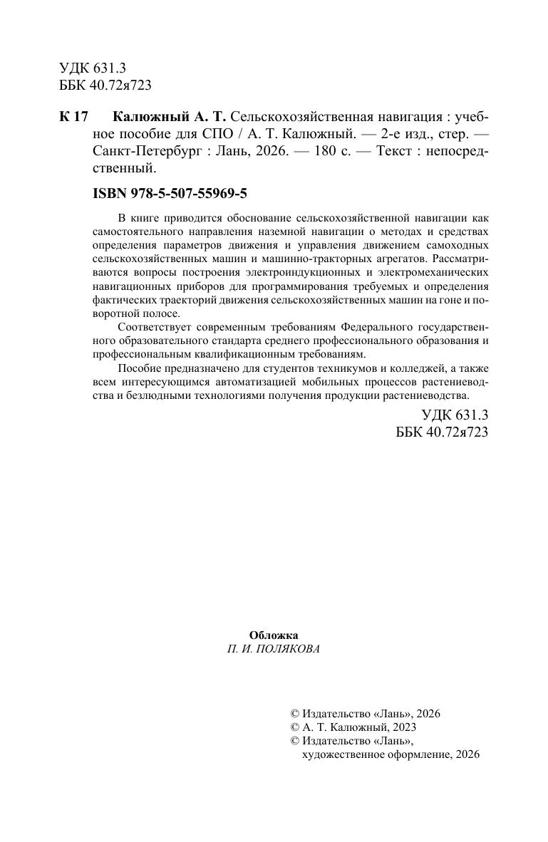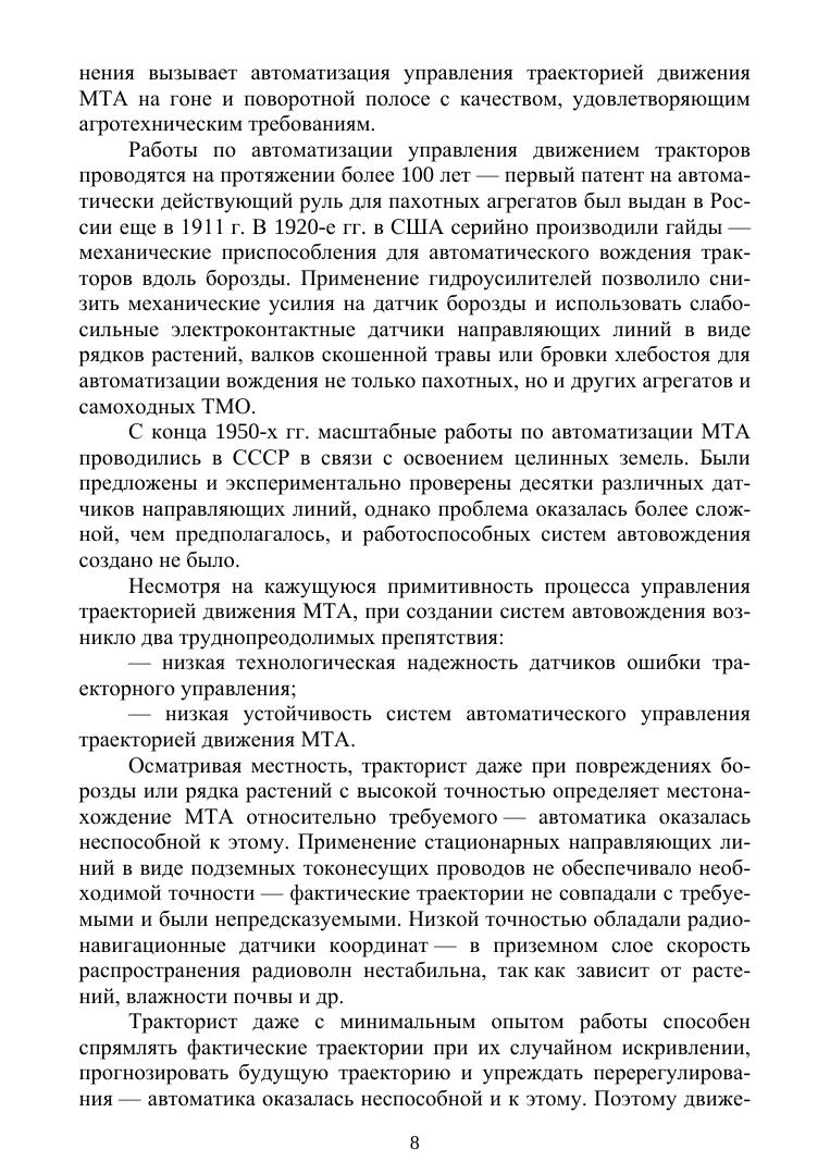 В книге приводится обоснование сельскохозяйственной навигации как самостоятельного направления наземной навигации о методах и средствах определения параметров движения и управления движением самоходных сельскохозяйственных машин и машинно-тракторных агрегатов. Рассматриваются вопросы построения электроиндукционных и электромеханических навигационных приборов для программирования требуемых и определения фактических траекторий движения сельскохозяйственных машин на гоне и поворотной полосе. Соответствует современным требованиям Федерального государственного образовательного стандарта среднего профессионального образования и профессиональным квалификационным требованиям. Пособие предназначено для студентов техникумов и колледжей, а также всем интересующимся автоматизацией мобильных процессов растениеводства и безлюдными технологиями получения продукции растениеводства.