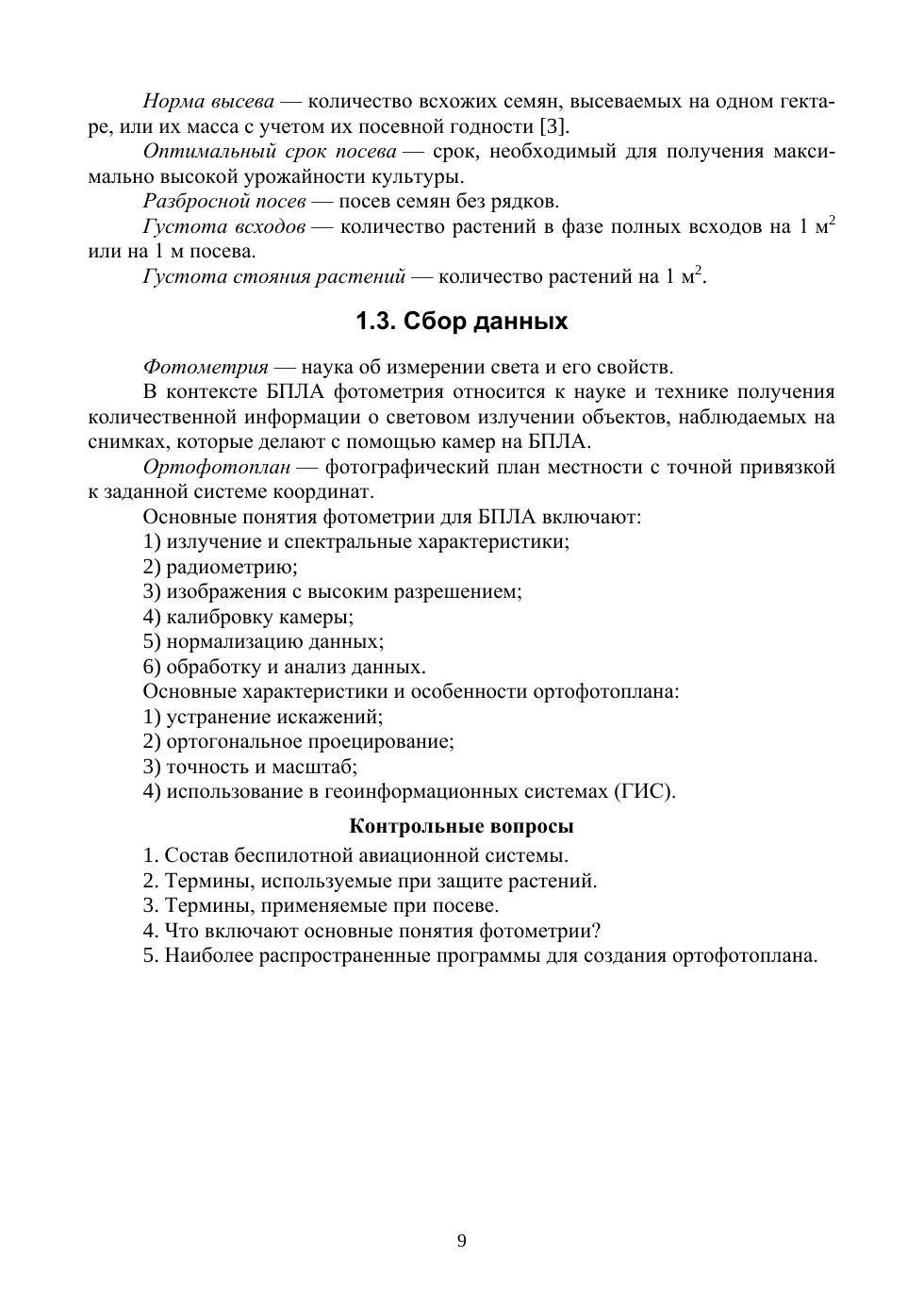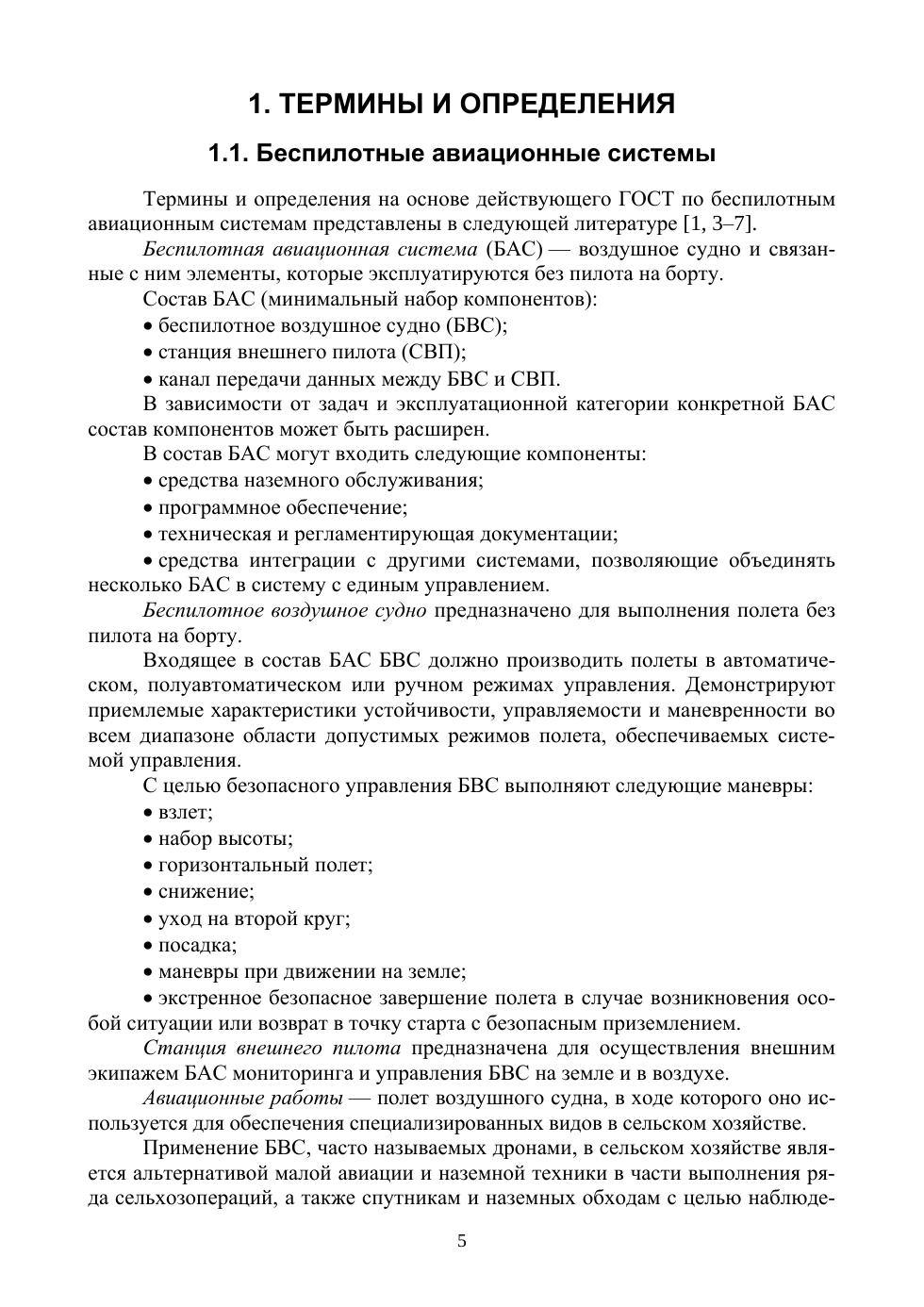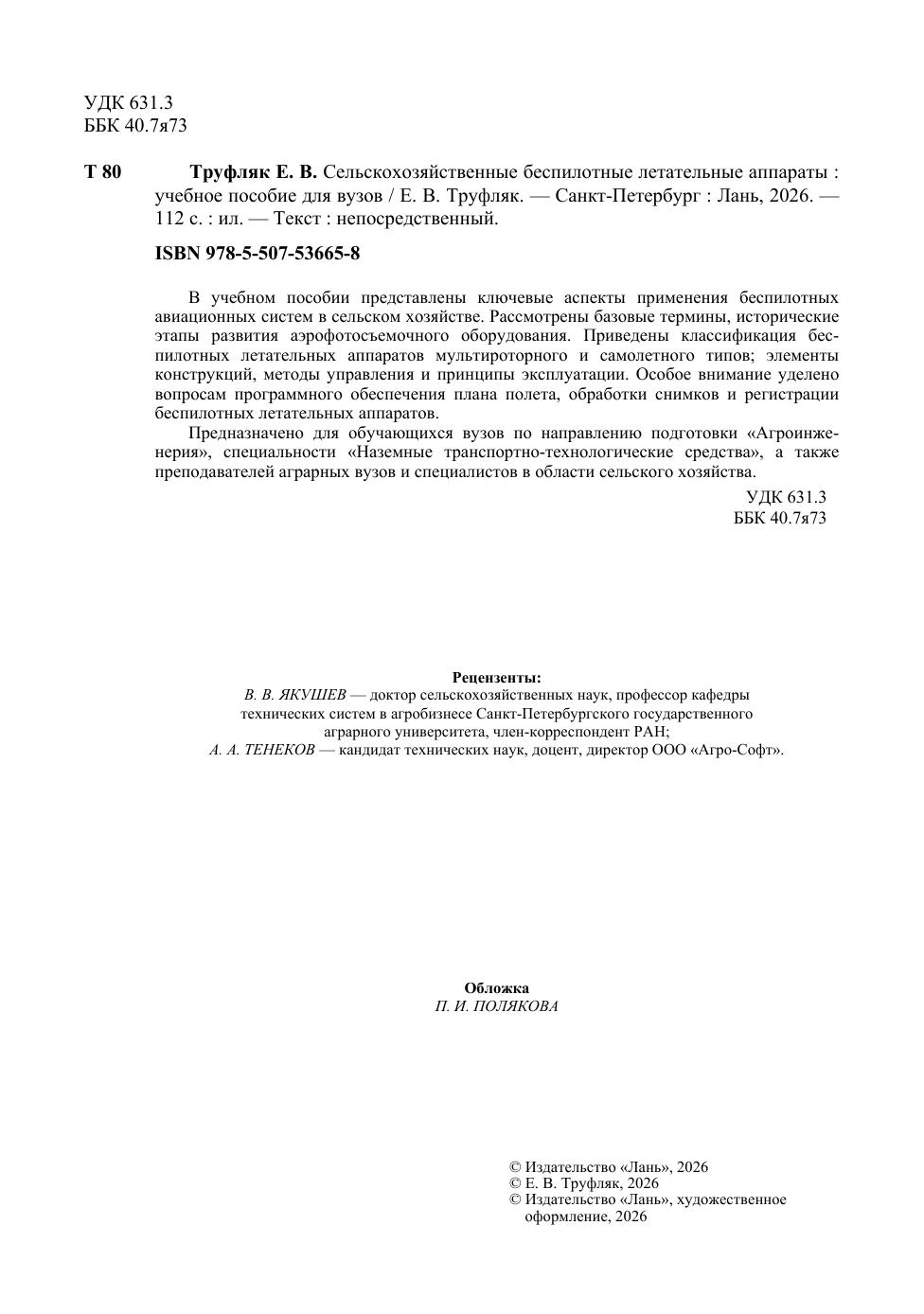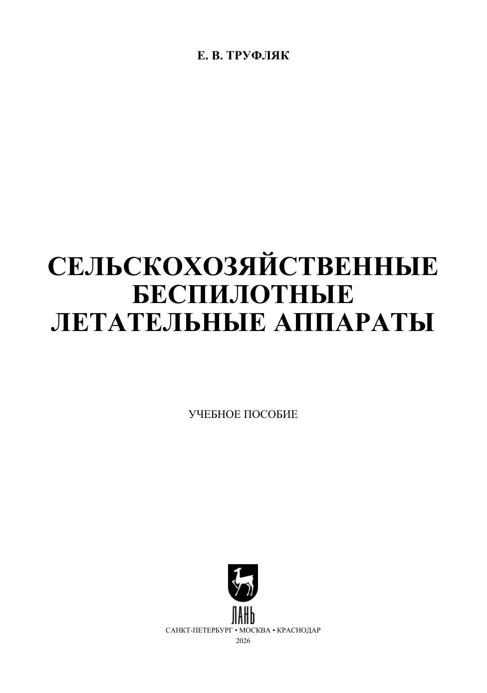 В учебном пособии представлены ключевые аспекты применения беспилотных авиационных систем в сельском хозяйстве. Рассмотрены базовые термины, исторические этапы развития аэрофотосъемочного оборудования. Приведены классификация беспилотных летательных аппаратов мультироторного и самолетного типов, элементы конструкций, методы управления и принципы эксплуатации. Особое внимание уделено вопросам программного обеспечения плана полета, обработки снимков и регистрации беспилотных летательных аппаратов. Предназначено для обучающихся вузов по направлению подготовки «Агроинженерия», специальности «Наземные транспортно-технологические средства», а также преподавателей аграрных вузов и специалистов в области сельского хозяйства.
