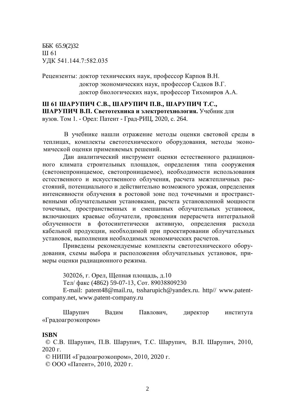 В учебнике нашли отражение методы оценки световой среды в теплицах, комплекты светотехнического оборудования, методы эконо-мической оценки применяемых решений. Дан аналитический инструмент оценки естественного радиацион-ного климата строительных площадок, определения типа сооружения (светонепроницаемое, светопроницаемое), необходимости использования естественного и искусственного облучения, расчета межтепличных рас-стояний, потенциального и действительно возможного урожая, определения интенсивности облучения в ростовой зоне под точечными и пространст-венными облучательными установками, расчета установленной мощности точечных, пространственных и смешанных облучательных установок, включающих краевые облучатели, проведения перерасчета интегральной облученности в фотосинтетически активную, определения расхода кабельной продукции, необходимой при проектировании облучательных установок, выполнения необходимых экономических расчетов.