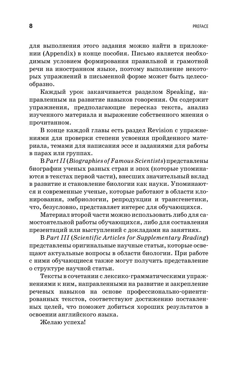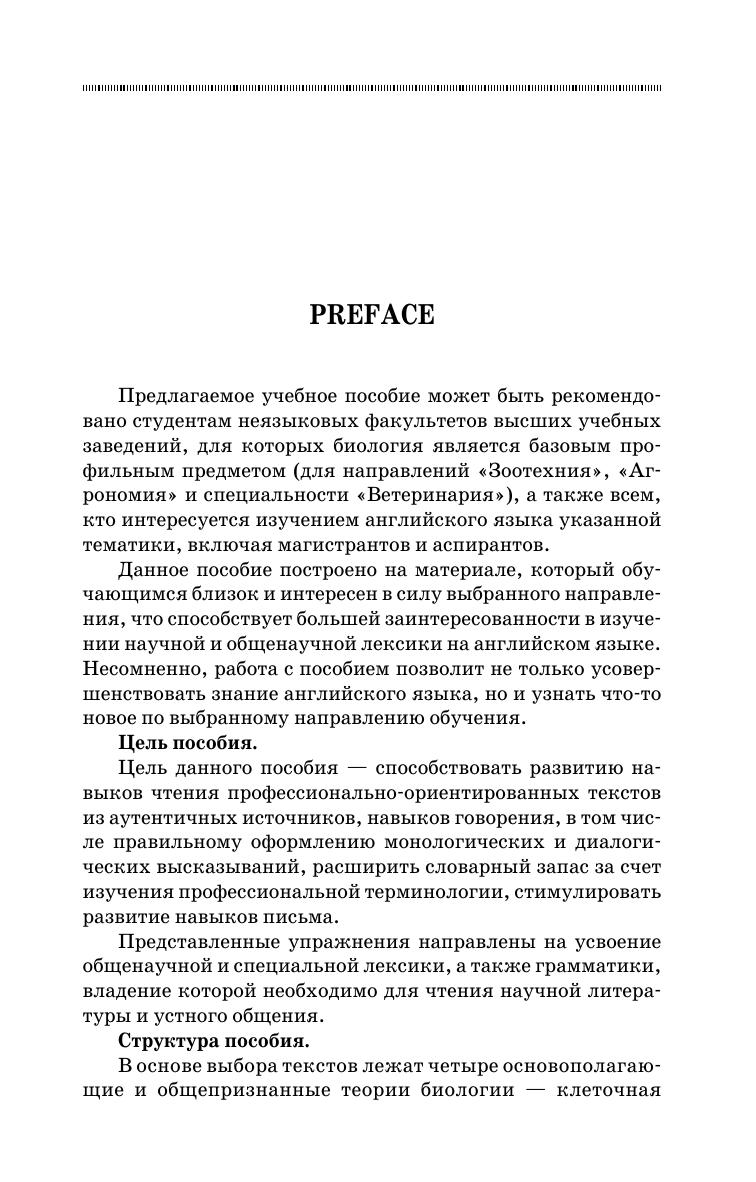 Цель данного пособия — способствовать развитию навыков чтения профессионально-ориентированных текстов из аутентичных источников, навыков говорения, в том числе правильному оформлению монологических и диалогических высказываний, расширить словарный запас за счет изучения профессиональной терминологии, стимулировать развитие навыков письменной речи. Предлагаемое учебное пособие предназначено студентам вузов направлений подготовки «Зоотехния», «Агрономия» и специальности «Ветеринария», а также всем, кто интересуется изучением английского языка указанной тематики.