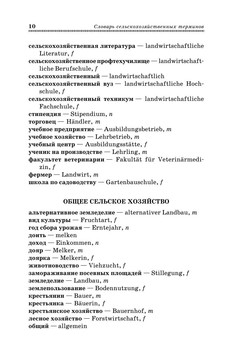 Данный русско-немецкий и немецко-русский сельскохозяйственный словарь предназначен для лиц, изучающих немецкий язык по специальностям: «Ветеринарная медицина», «Биология», «Механизация сельского хозяйства», «Агрономия». Словарь содержит более 4000 терминов и понятий. Словарь рассчитан в первую очередь на лиц, уже в достаточной степени владеющих немецким языком. При разработке тем словаря составитель стремился как можно точнее отразить наиболее современные понятия и точно перевести термины с немецкого языка на русский.