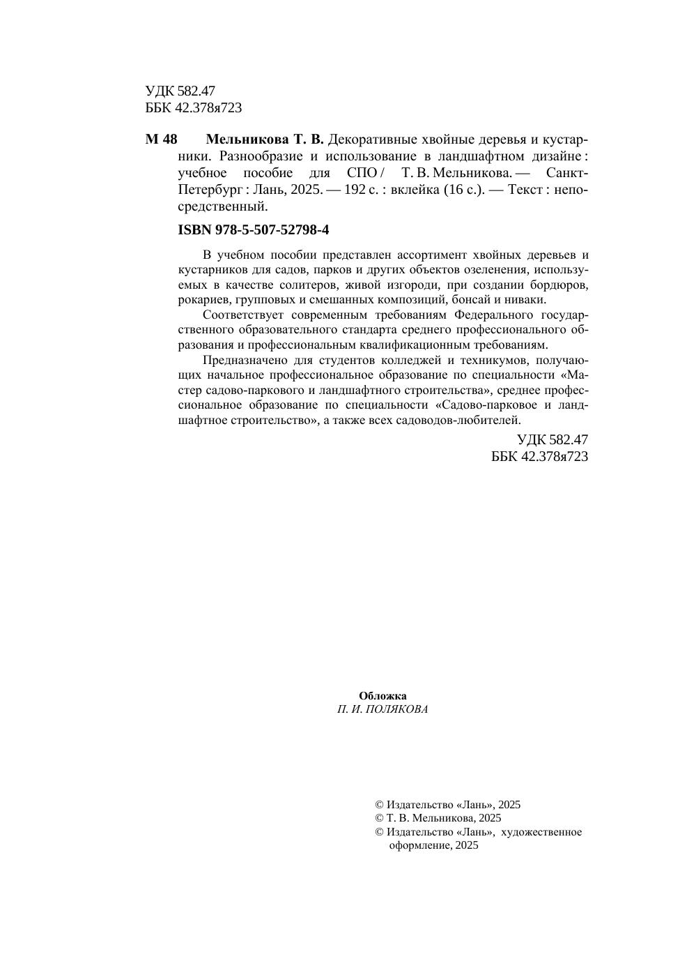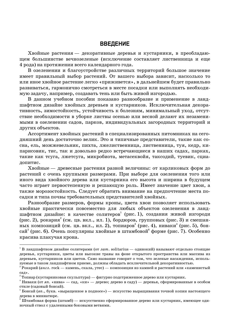 В учебном пособии представлен ассортимент хвойных деревьев и кустарников для садов, парков и других объектов озеленения, используемых в качестве солитеров, живой изгороди, при создании бордюров, рокариев, групповых и смешанных композиций, бонсай и ниваки. Соответствует современным требованиям Федерального государственного образовательного стандарта среднего профессионального образования и профессиональным квалификационным требованиям. Предназначено для студентов колледжей и техникумов, получающих начальное профессиональное образование по специальности «Мастер садово-паркового и ландшафтного строительства», среднее профессиональное образование по специальности «Садово-парковое и ландшафтное строительство», а также всех садоводов-любителей.
