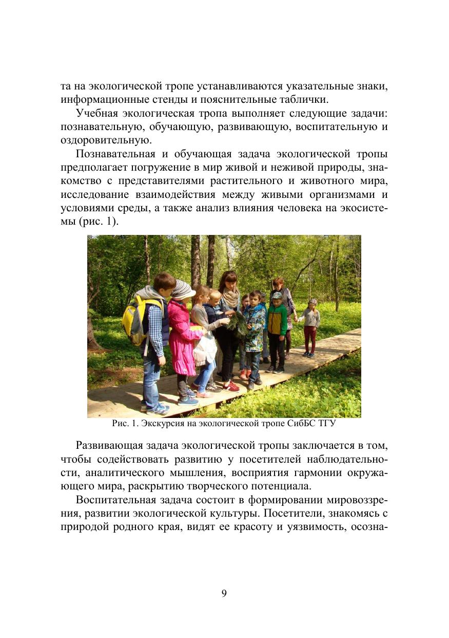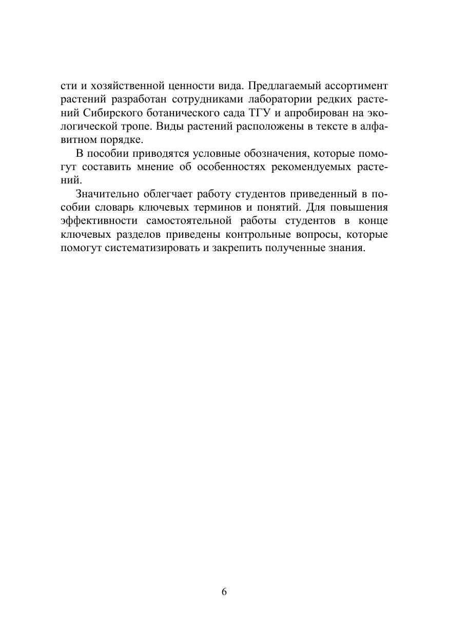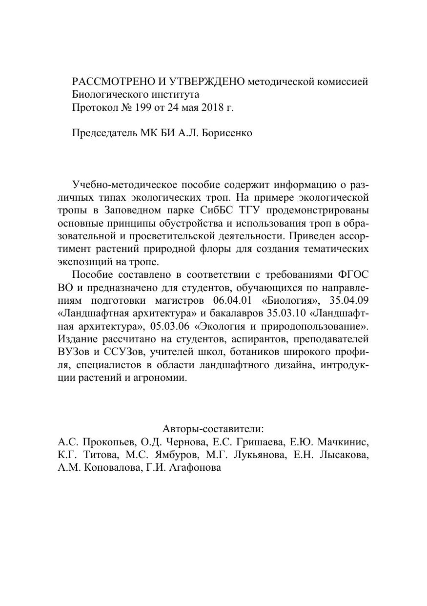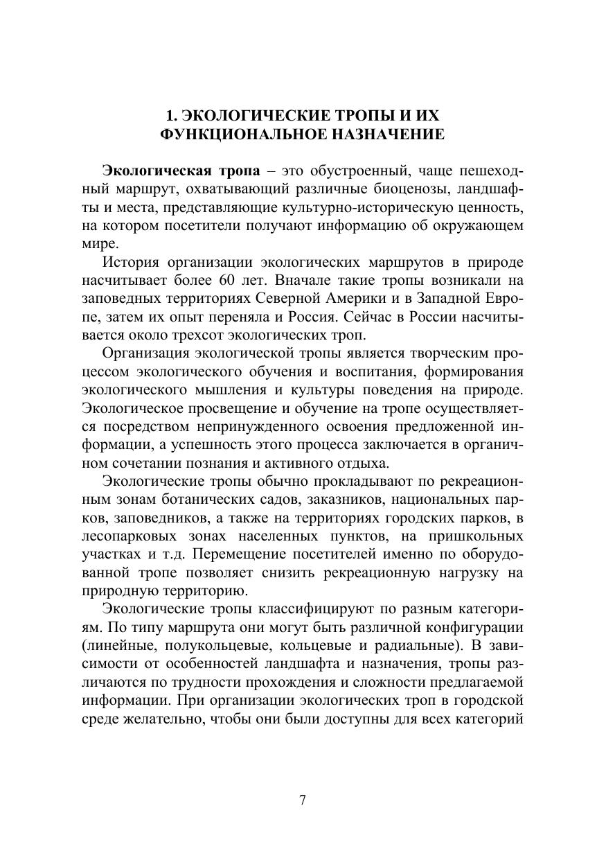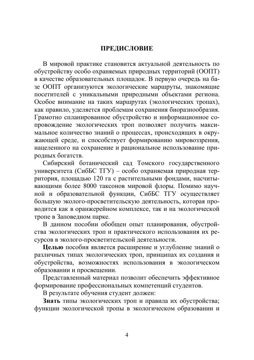 Учебно-методическое пособие содержит информацию о различных типах экологических троп. На примере экологической тропы в Заповедном парке СибБС ТГУ продемонстрированы основные принципы обустройства и использования троп в образовательной и просветительской деятельности. Приведен ассортимент растений природной флоры для создания тематических экспозиций на тропе. Пособие составлено в соответствии с требованиями ФГОС ВО и предназначено для студентов, обучающихся по направлениям подготовки магистров 06.04.01 «Биология», 35.04.09 «Ландшафтная архитектура» и бакалавров 35.03.10 «Ландшафтная архитектура», 05.03.06 «Экология и природопользование». Издание рассчитано на студентов, аспирантов, преподавателей ВУЗов и ССУЗов, учителей школ, ботаников широкого профиля, специалистов в области ландшафтного дизайна, интродукции растений и агрономии.