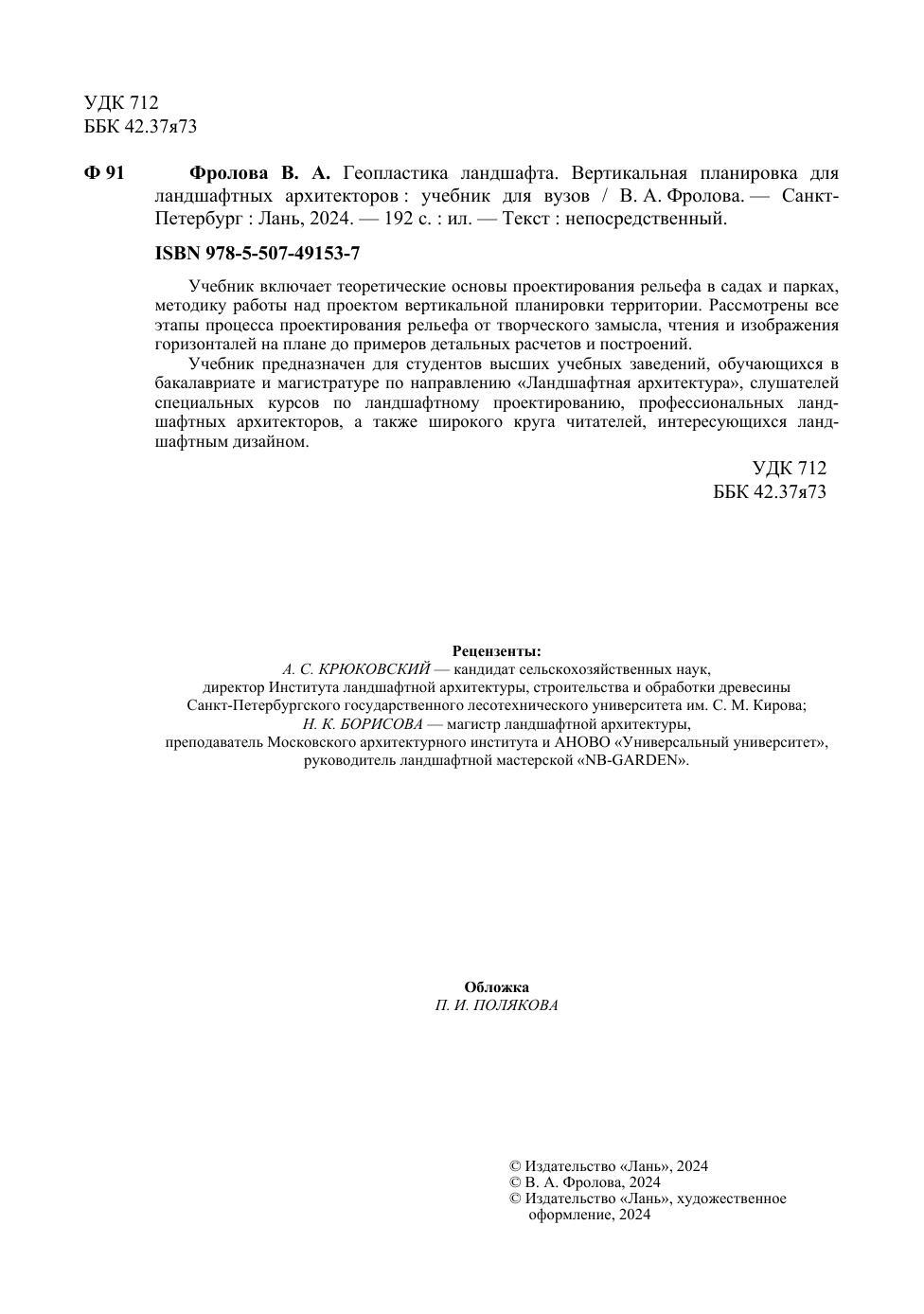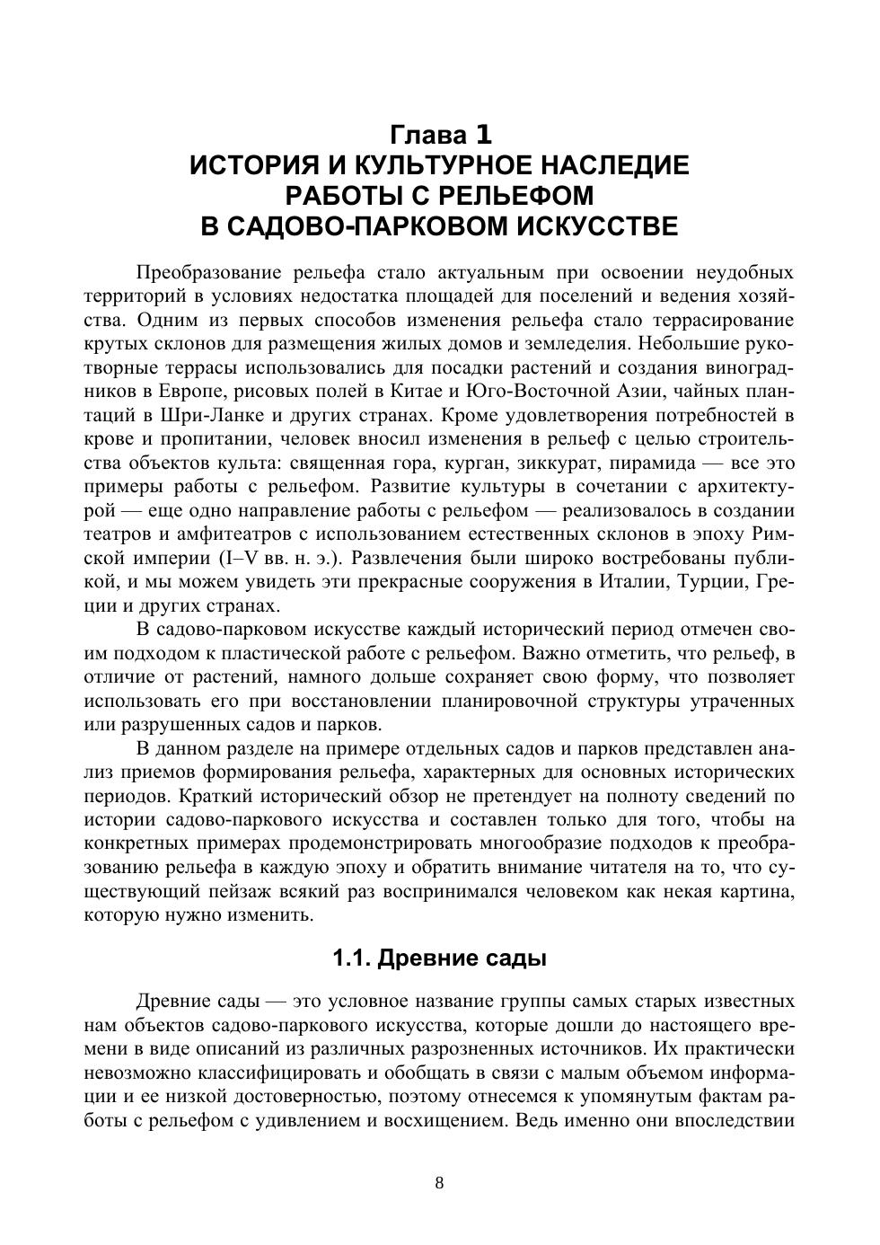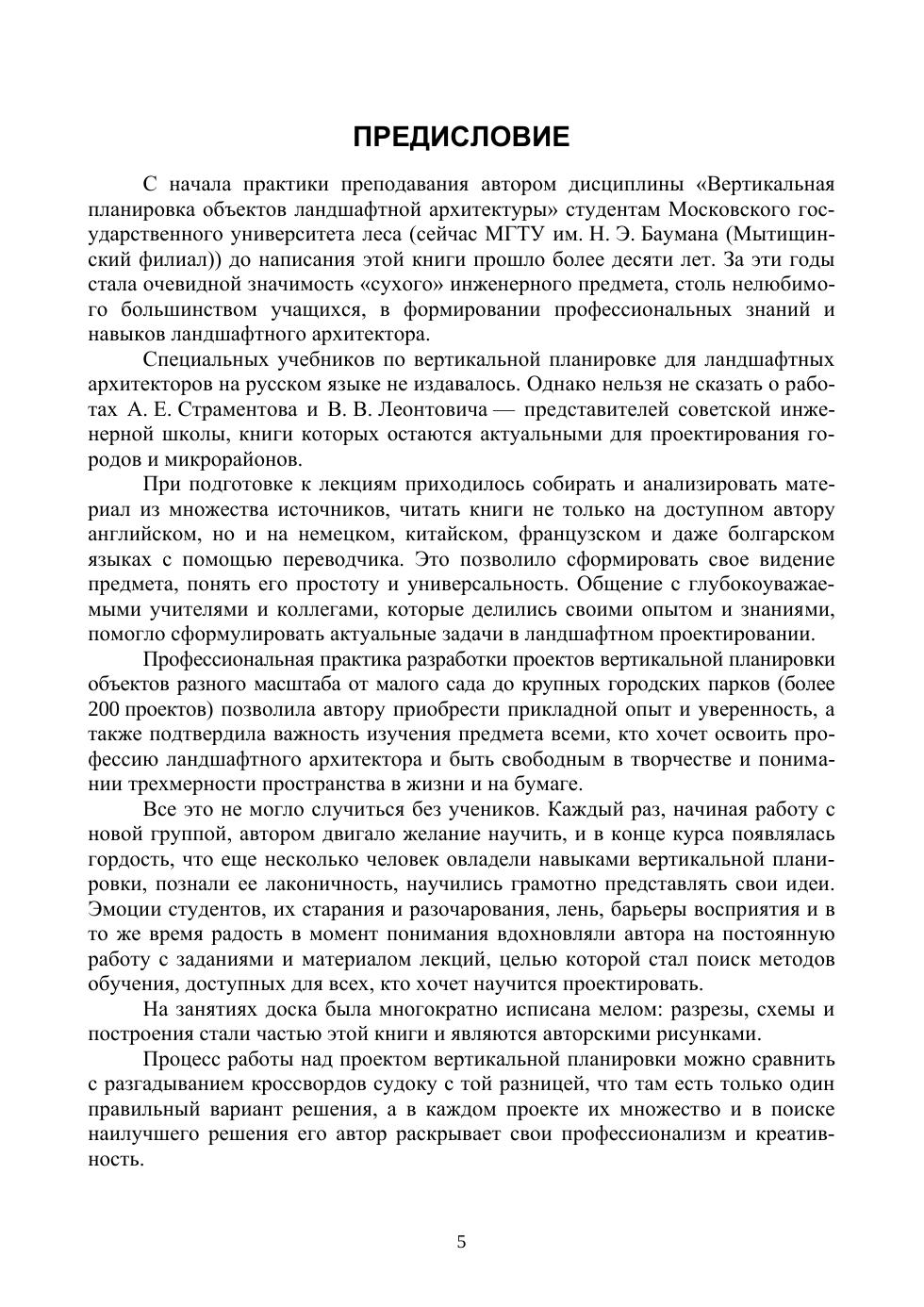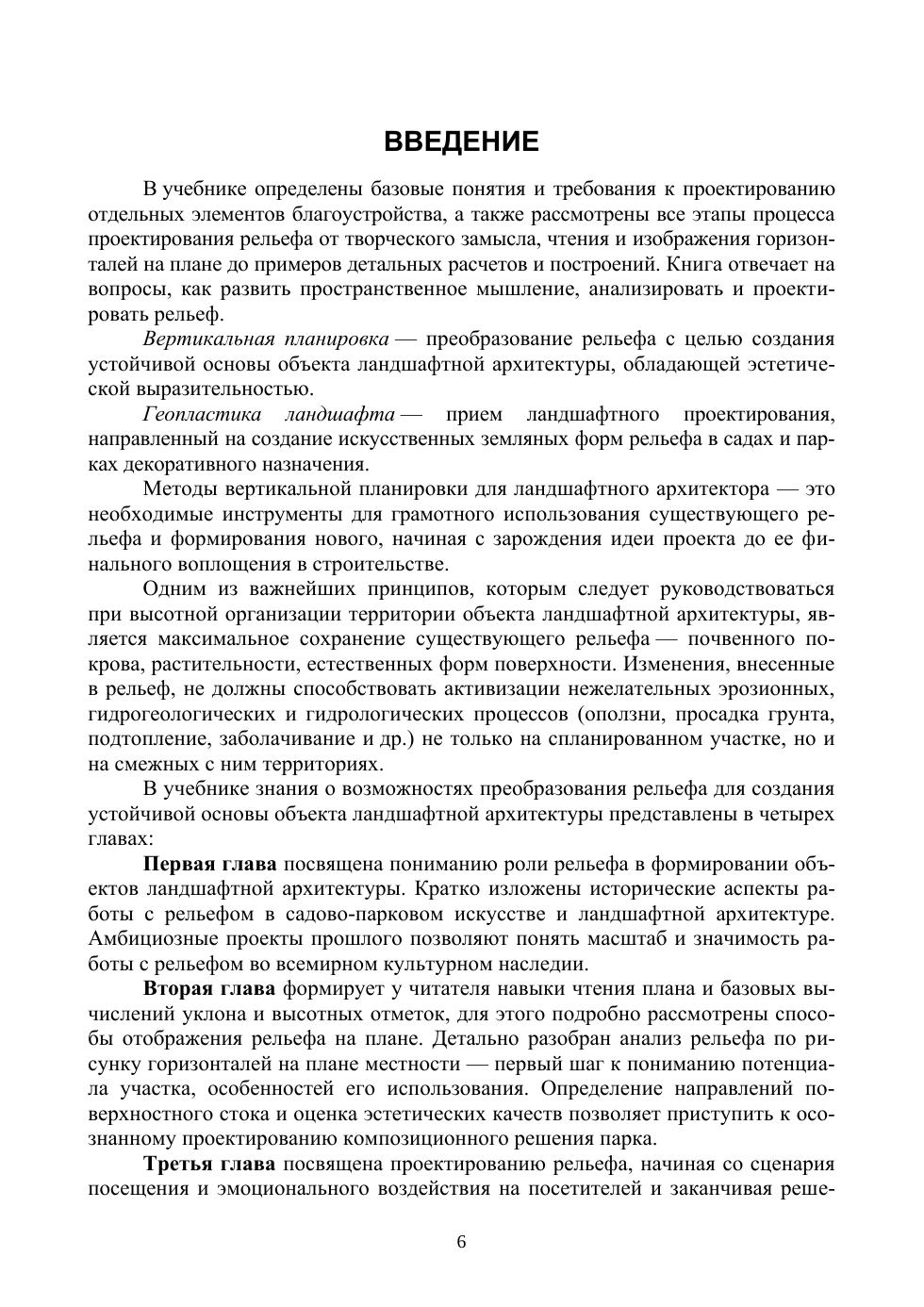 Учебник включает теоретические основы проектирования рельефа в садах и парках, методику работы над проектом вертикальной планировки территории. Рассмотрены все этапы процесса проектирования рельефа от творческого замысла, чтения и изображения горизонталей на плане до примеров детальных расчетов и построений. Учебник предназначен для студентов высших учебных заведений, обучающихся в бакалавриате и магистратуре по направлению «Ландшафтная архитектура», слушателей специальных курсов по ландшафтному проектированию, профессиональных ландшафтных архитекторов, а также широкого круга читателей, интересующихся ландшафтным дизайном.