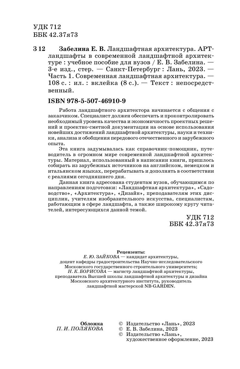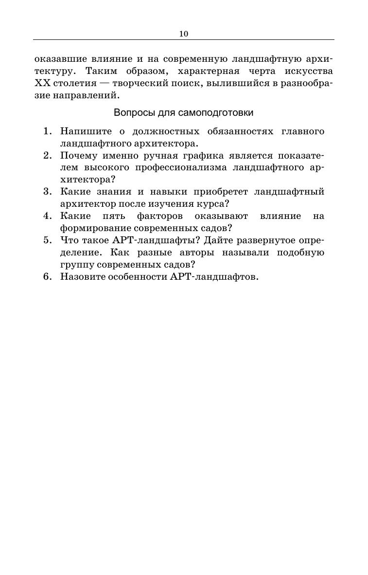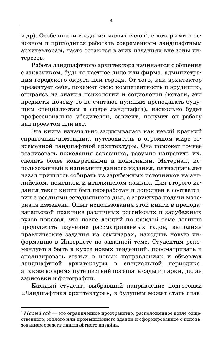Работа ландшафтного архитектора начинается с общения с заказчиком. Специалист должен обеспечить и проконтролировать необходимый уровень качества и экономичность проектных решений и проектно-сметной документации на основе использования новейших достижений ландшафтной архитектуры, науки и техники, анализа и обобщения передового отечественного и зарубежного опыта. Эта книга задумывалась как справочник-помощник, путеводитель в огромном мире современной ландшафтной архитектуры. Материал, использованный в написании книги, пришлось собирать из зарубежных источников на английском, немецком и итальянском языках, перерабатывать и дополнять в соответствии с реалиями сегодняшнего дня. Данная книга адресована прежде всего студентам, обучающимся по направлениям подготовки: «Ландшафтная архитектура», «Садоводство», «Архитектура», «Дизайн», преподавателям этих дисциплин, учителям изобразительного искусства, специалистам, уже работающим в сфере ландшафта, а также широкому кругу читателей, интересующихся данной темой.