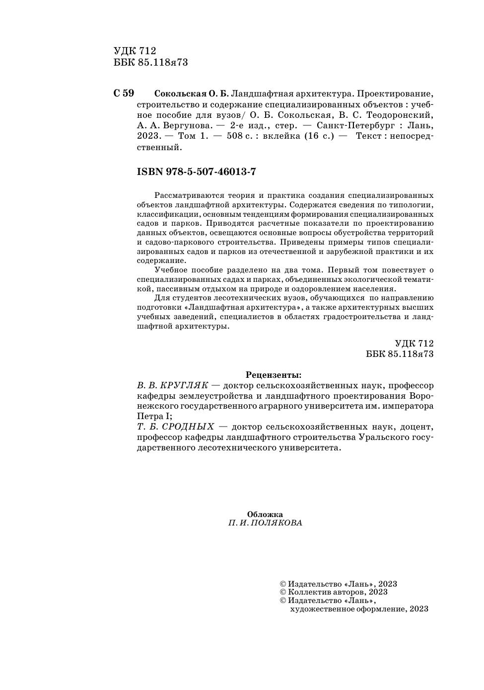 Рассматриваются теория и практика создания специализированных объектов ландшафтной архитектуры. Содержатся сведения по типологии, классификации, основным тенденциям формирования специализированных садов и парков. Приводятся расчетные показатели по проектированию данных объектов, освещаются основные вопросы обустройства территорий и садовопаркового строительства. Приведены примеры типов специализированных садов и парков из отечественной и зарубежной практики и их содержание. Учебное пособие разделено на два тома. Первый том повествует о специализированных садах и парках, объединенных экологической тематикой, пассивным отдыхом на природе и оздоровлением населения. Для студентов лесотехнических вузов, обучающихся по направлению подготовки «Ландшафтная архитектура», а также архитектурных высших учебных заведений, специалистов в областях градостроительства и ландшафтной архитектуры.