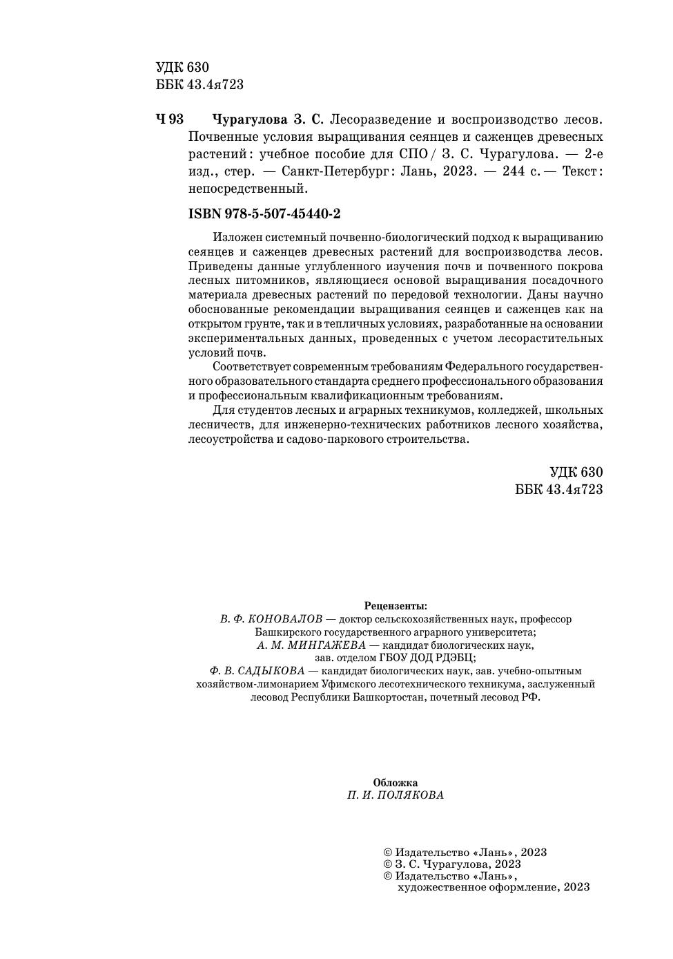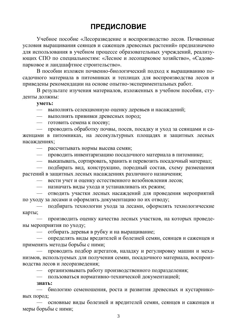 Изложен системный почвенно-биологический подход к выращиванию сеянцев и саженцев древесных растений для воспроизводства лесов. Приведены данные углубленного изучения почв и почвенного покрова лесных питомников, являющиеся основой выращивания посадочного материала древесных растений по передовой технологии. Даны научно обоснованные рекомендации выращивания сеянцев и саженцев, как на открытом грунте, так и в тепличных условиях, разработанные на основании экспериментальных данных, проведенных с учетом лесорастительных условий почв. Соответствует современным требованиям Федерального государственного образовательного стандарта среднего профессионального образования и профессиональным квалификационным требованиям. Для студентов лесных и аграрных техникумов, колледжей, школьных лесничеств, для инженерно-технических работников лесного хозяйства, лесоустройства и садово-паркового строительства.