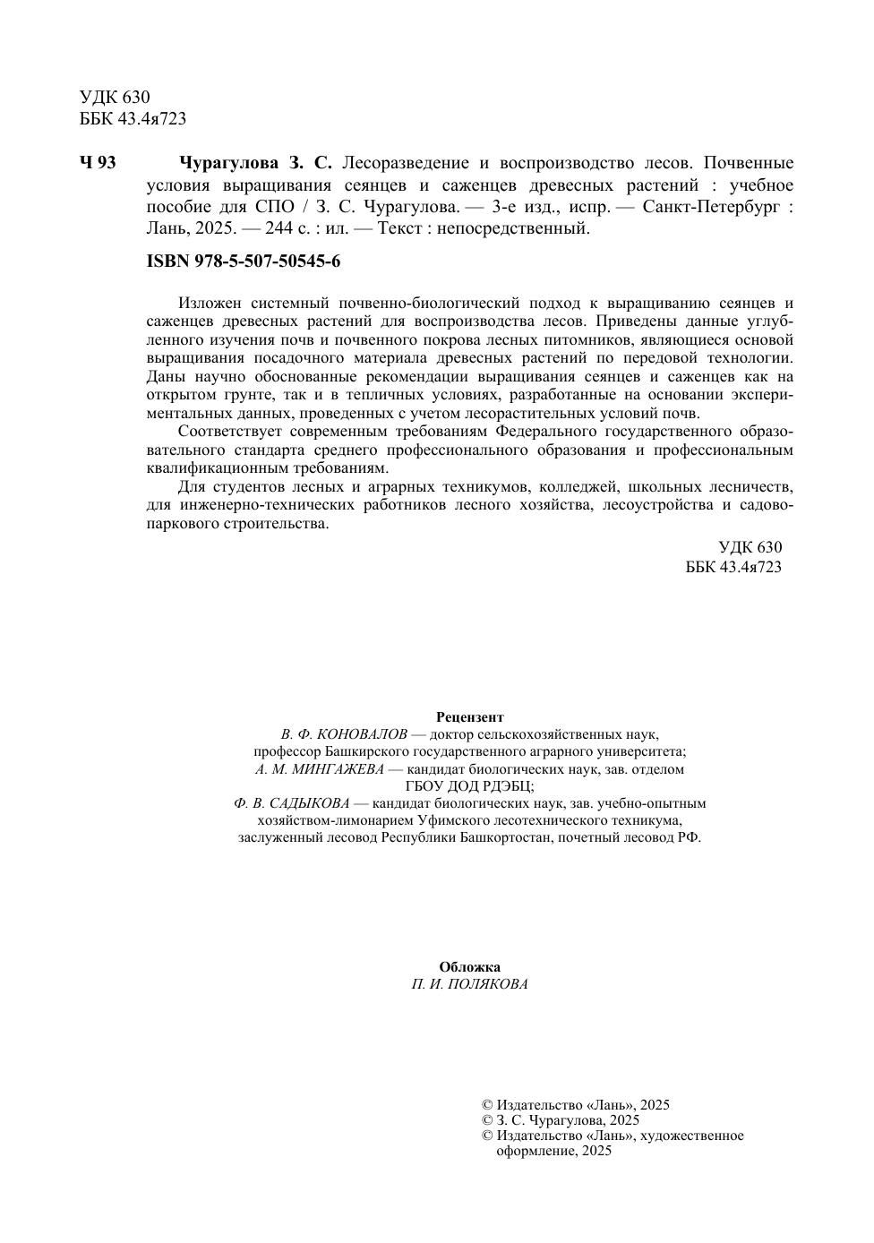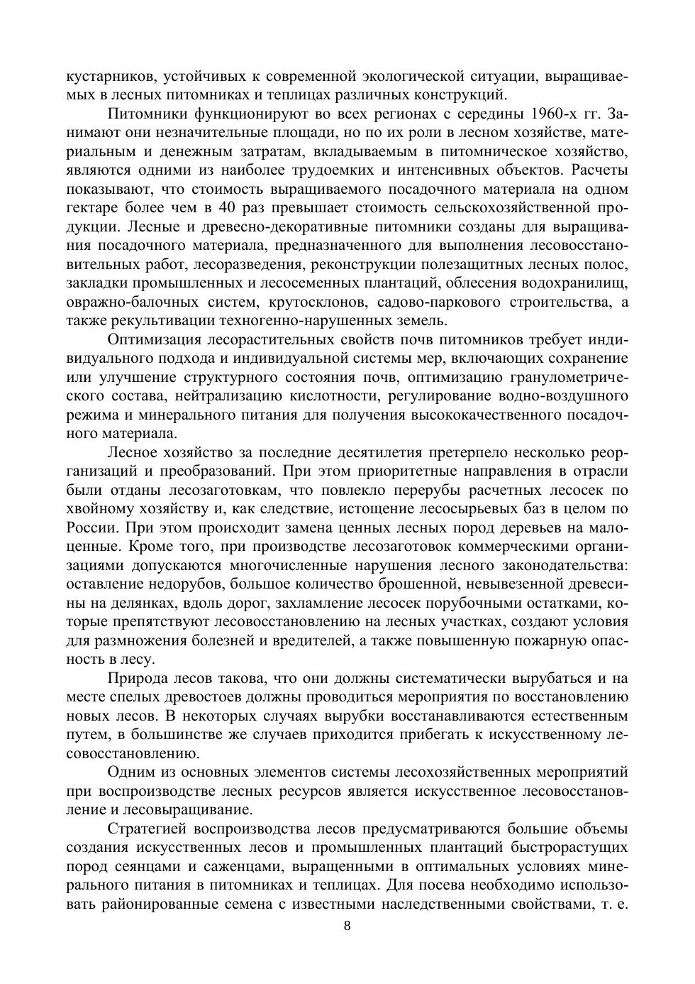 Изложен системный почвенно-биологический подход к выращиванию сеянцев и саженцев древесных растений для воспроизводства лесов. Приведены данные углубленного изучения почв и почвенного покрова лесных питомников, являющиеся основой выращивания посадочного материала древесных растений по передовой технологии. Даны научно обоснованные рекомендации выращивания сеянцев и саженцев как на открытом грунте, так и в тепличных условиях, разработанные на основании экспериментальных данных, проведенных с учетом лесорастительных условий почв. Соответствует современным требованиям Федерального государственного образовательного стандарта среднего профессионального образования и профессиональным квалификационным требованиям. Для студентов лесных и аграрных техникумов, колледжей, школьных лесничеств, для инженерно-технических работников лесного хозяйства, лесоустройства и садово-паркового строительства.
