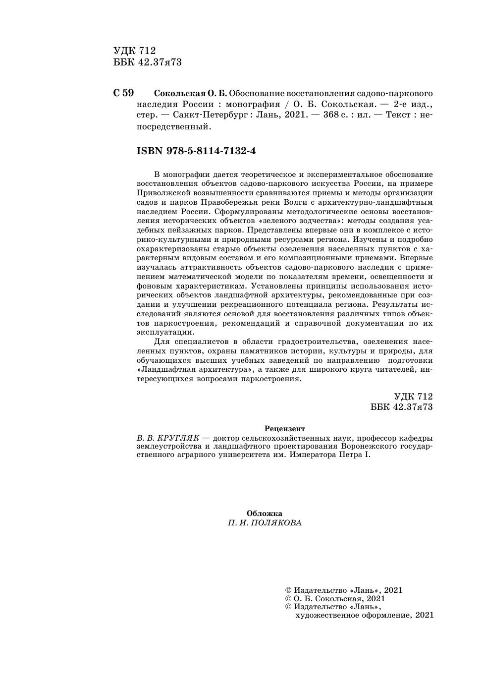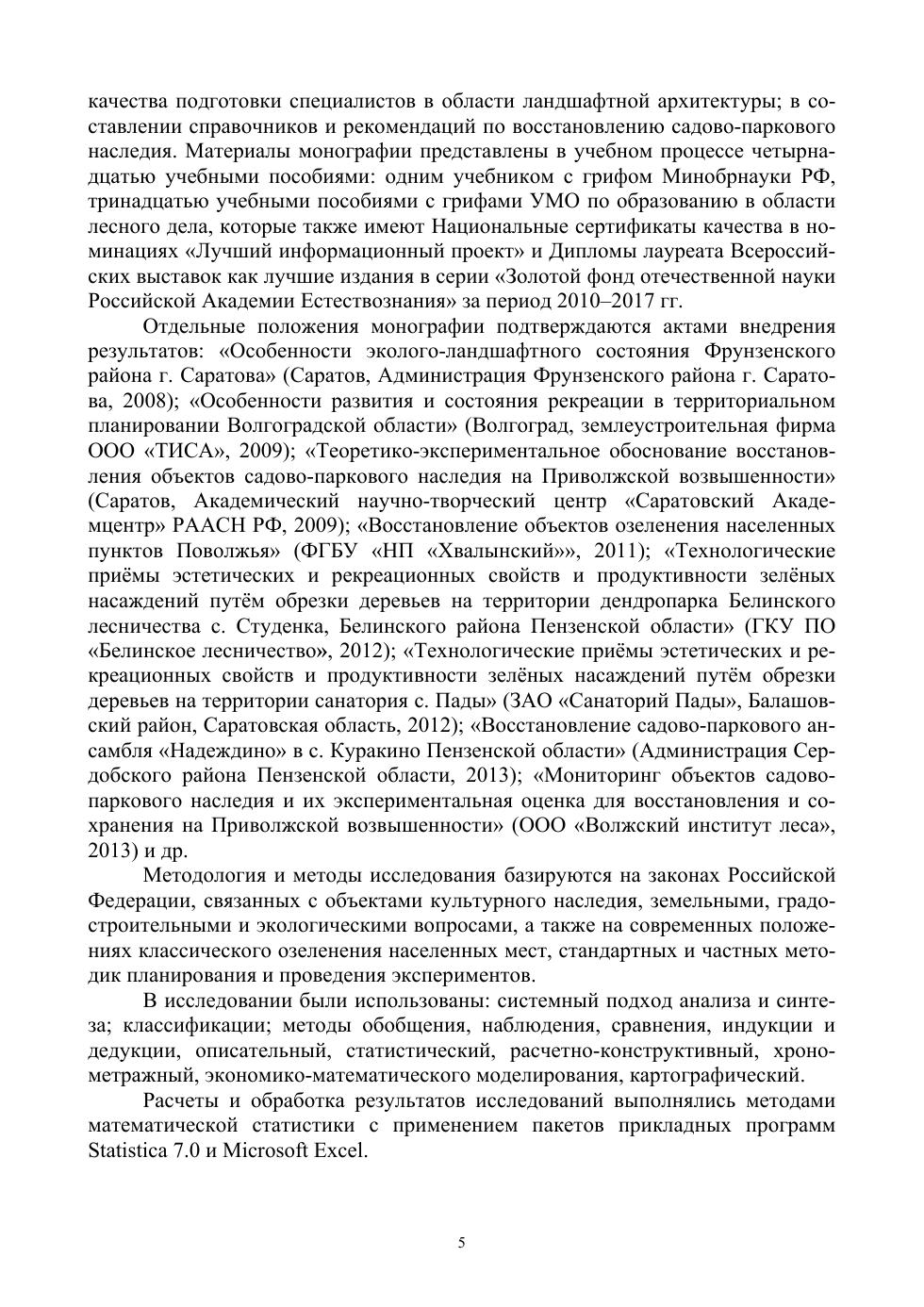 В монографии дается теоретическое и экспериментальное обоснование восстановления объектов садово-паркового искусства России, на примере Приволжской возвышенности сравниваются приемы и методы организации садов и парков Правобережья реки Волги с архитектурно-ландшафтным наследием России. Сформулированы методологические основы восстановления исторических объектов «зеленого зодчества»: методы создания усадебных пейзажных парков. Представлены впервые они в комплексе с историко-культурными и природными ресурсами региона. Изучены и подробно охарактеризованы старые объекты озеленения населенных пунктов с характерным видовым составом и его композиционными приемами. Впервые изучалась аттрактивность объектов садово-паркового наследия с применением математической модели по показателям времени, освещенности и фоновым характеристикам. Установлены принципы использования исторических объектов ландшафтной архитектуры, рекомендованные при создании и улучшении рекреационного потенциала региона. Результаты исследований являются основой для восстановления различных типов объектов паркостроения, рекомендаций и справочной документации по их эксплуатации.