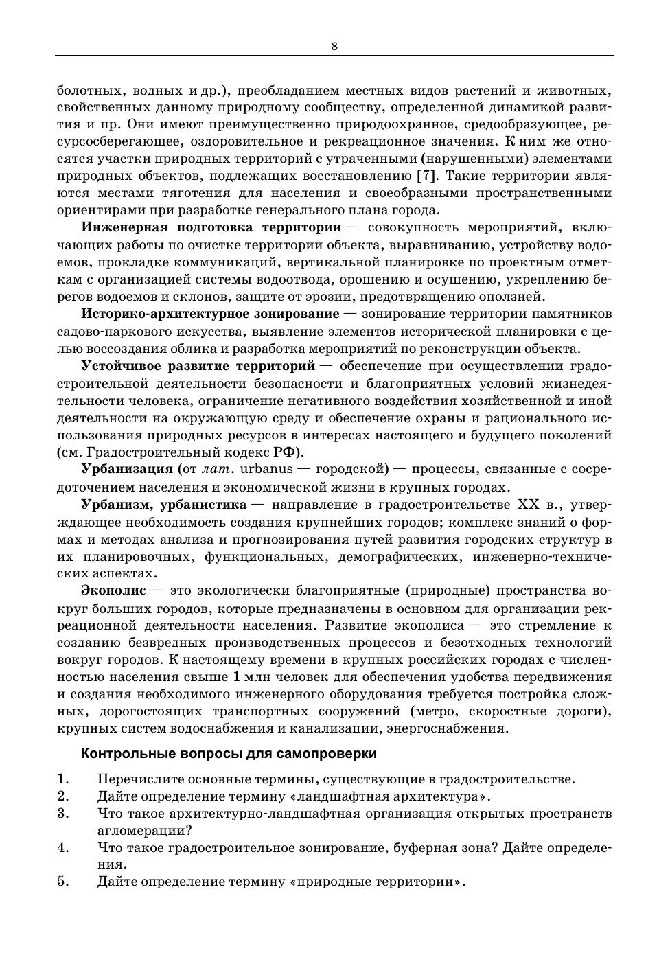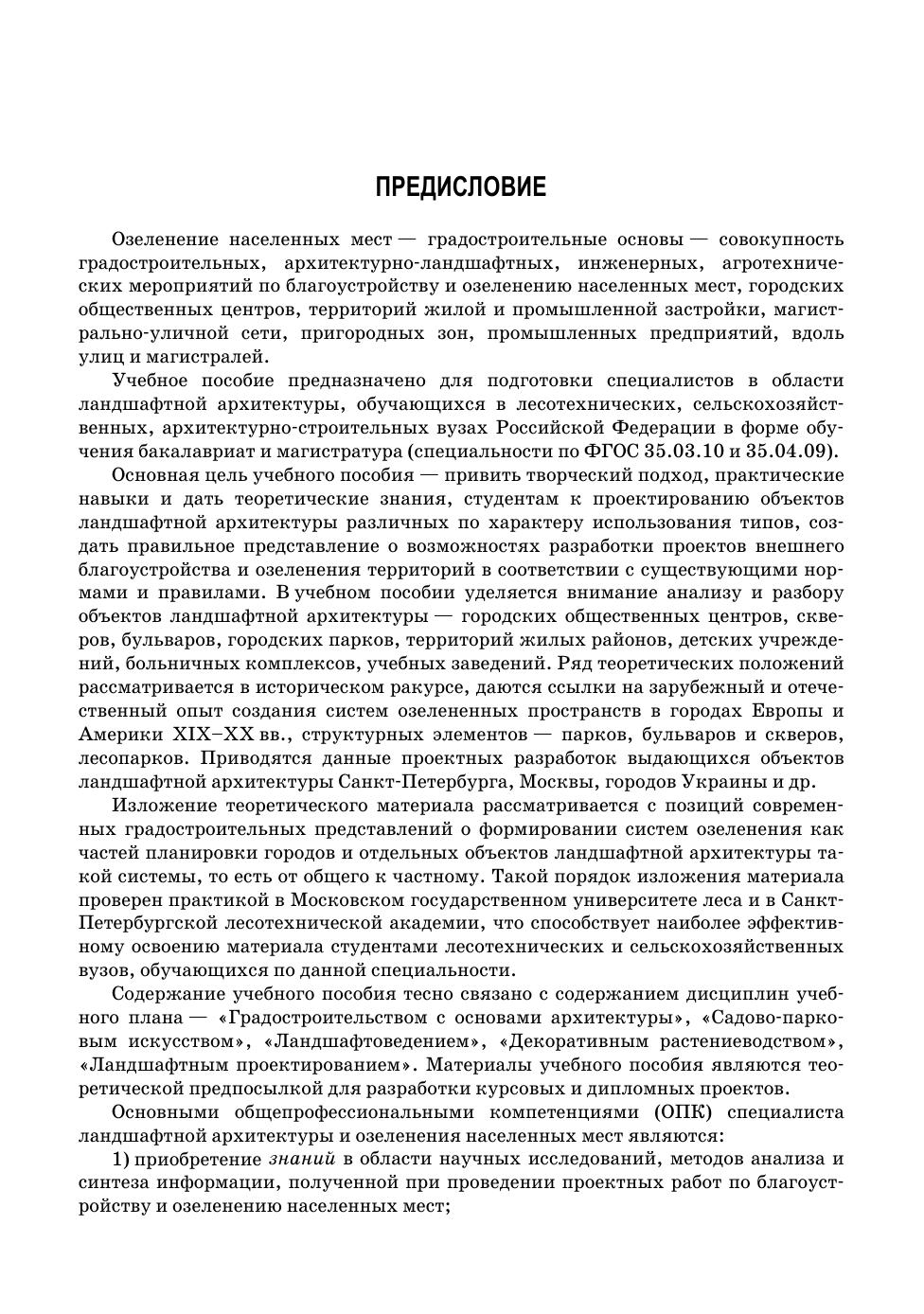 В учебном пособии даны основные сведения и понятия о ландшафтно-планировочной организации населенных мест и самих объектов озеленения с учетом их природно-экологических, социально-демографических и хозяйственно-градостроительных особенностей. Приведены правила и нормы проектирования, принципы структуры и пространственной организации объектов, композиции насаждений, фитоценотические и эстетические аспекты озеленения. Пособие предназначено для студентов лесотехнических вузов по направлению подготовки «Ландшафтная архитектура».