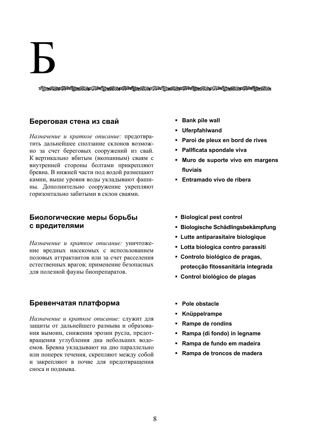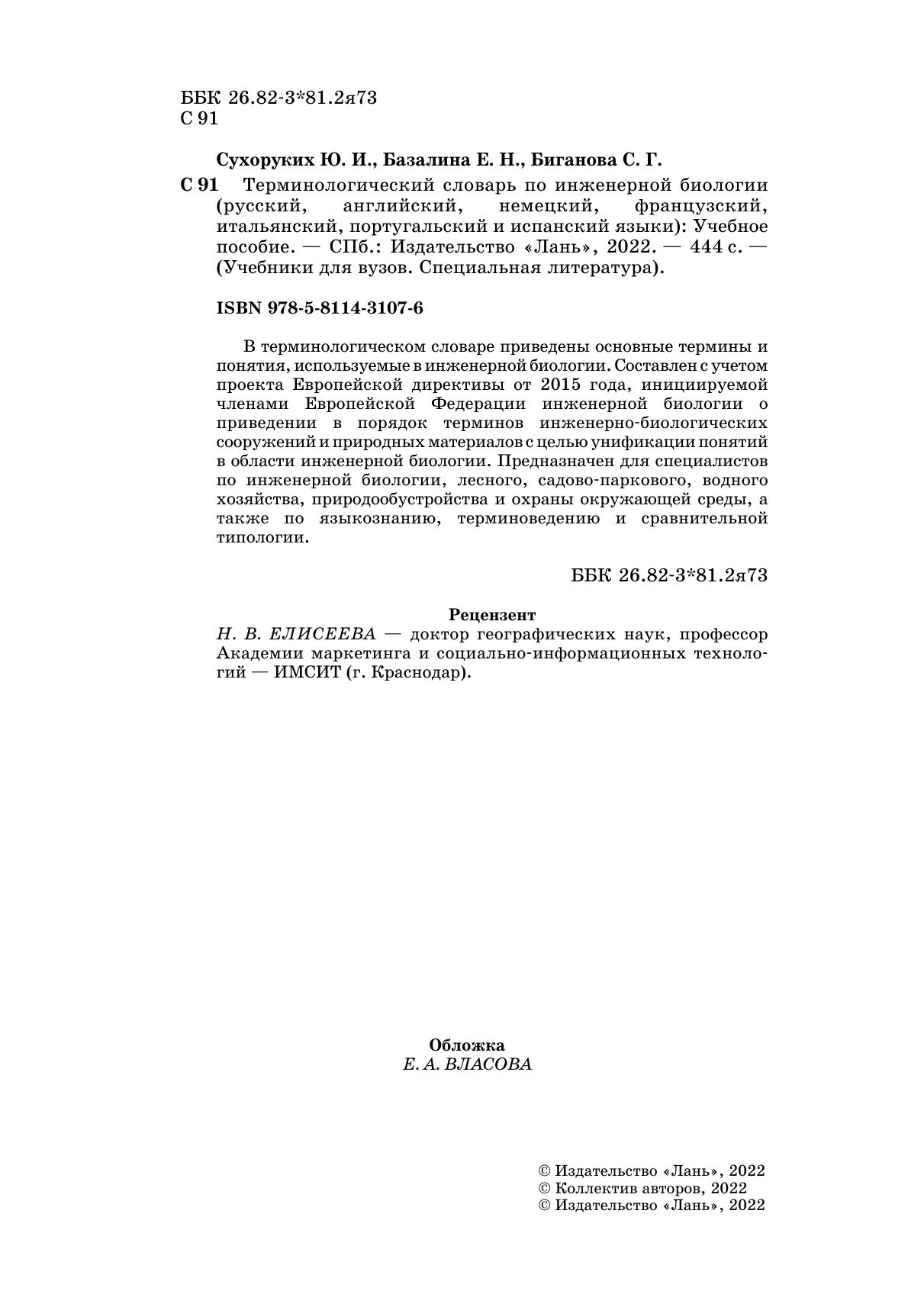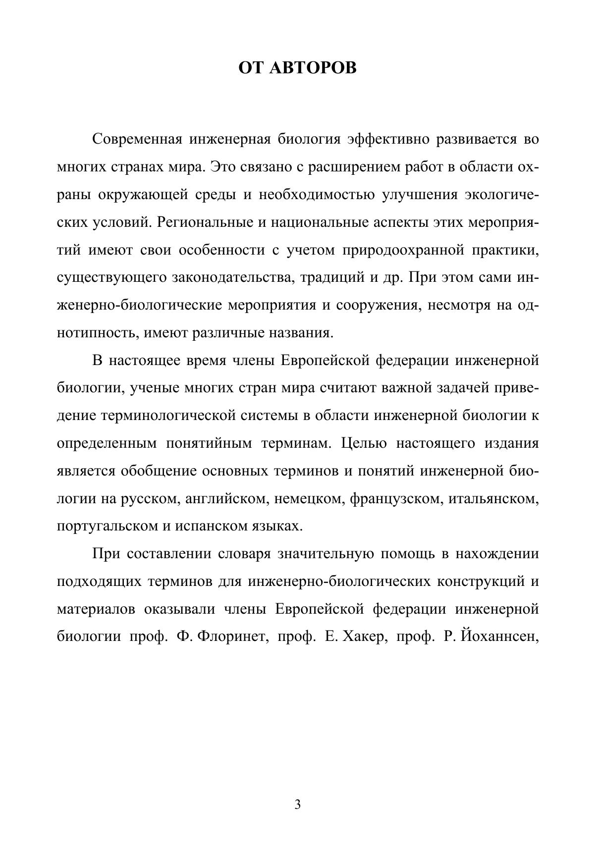 В терминологическом словаре приведены основные термины и понятия, используемые в инженерной биологии. Составлен с учетом проекта Европейской директивы от 2015 года, инициируемой членами Европейской Федерации инженерной биологии о приведение в порядок терминов инженерно-биологических сооружений и природных материалов, с целью унификации понятий в области инженерной биологии. Предназначен для специалистов по инженерной биологии, лесного, садово-паркового, водного хозяйства, природообустройства и охраны окружающей среды, а так же по языкознанию, терминоведению и сравнительной типологии.