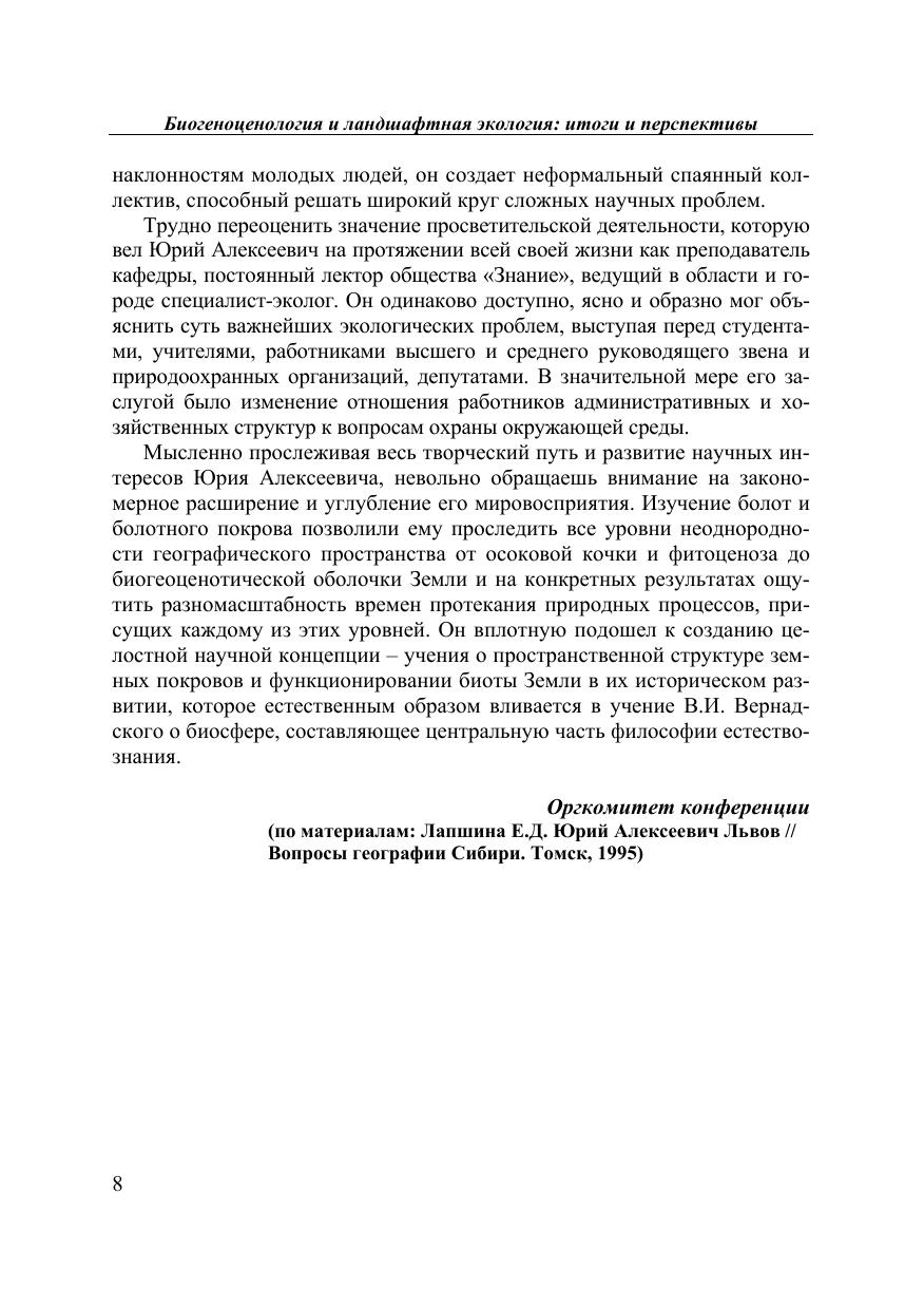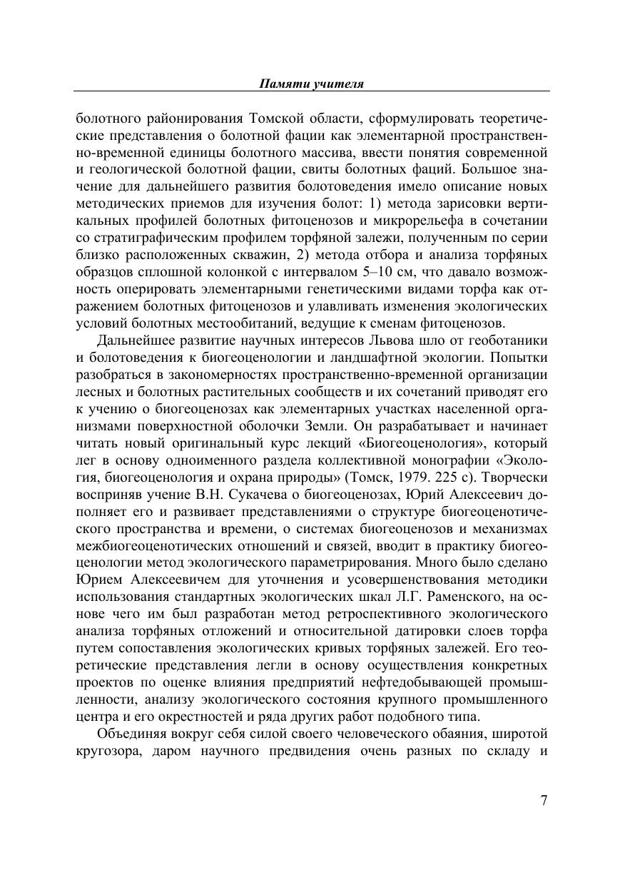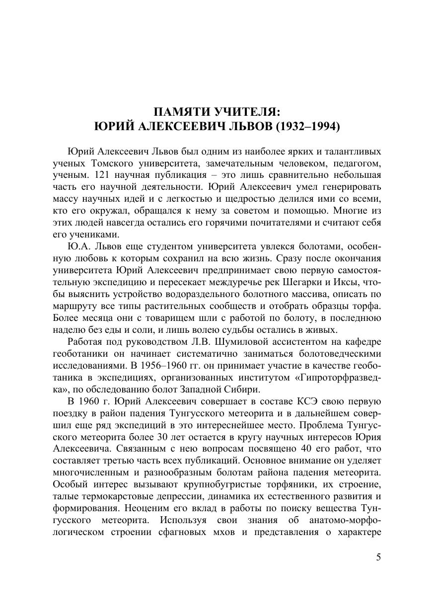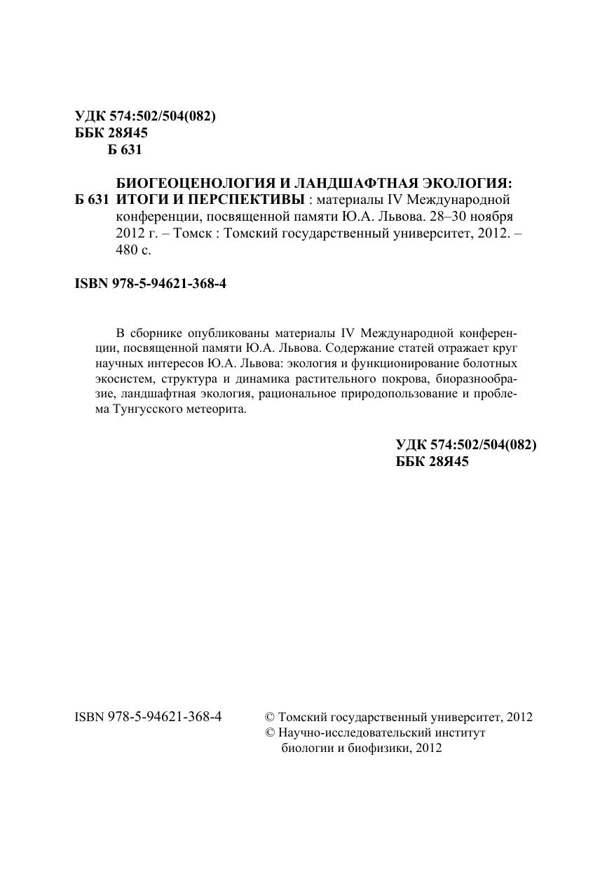 В сборнике опубликованы материалы IV Международной конференции, посвященной памяти Ю.А. Львова. Содержание статей отражает круг научных интересов Ю.А. Львова: экология и функционирование болотных экосистем, структура и динамика растительного покрова, биоразнообразие, ландшафтная экология, рациональное природопользование и проблема Тунгусского метеорита.