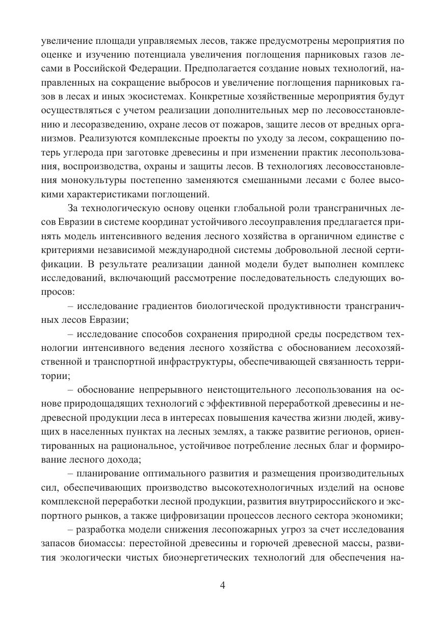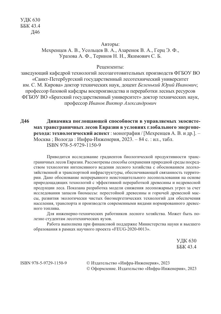 Приводится исследование градиентов биологической продуктивности трансграничных лесов Евразии. Рассмотрены способы сохранения природной среды посредством технологии интенсивного ведения лесного хозяйства с обоснованием лесохозяйственной и транспортной инфраструктуры, обеспечивающей связанность территории. Дано обоснование непрерывного неистощительного лесопользования на основе природощадящих технологий с эффективной переработкой древесины и недревесной продукции леса. Показана разработка модели снижения лесопожарных угроз за счет исследования запасов биомассы: перестойной древесины и горючей древесной массы, развития экологически чистых биоэнергетических технологий для обеспечения населения, транспорта и производств современными видами нормированного древесного топлива.