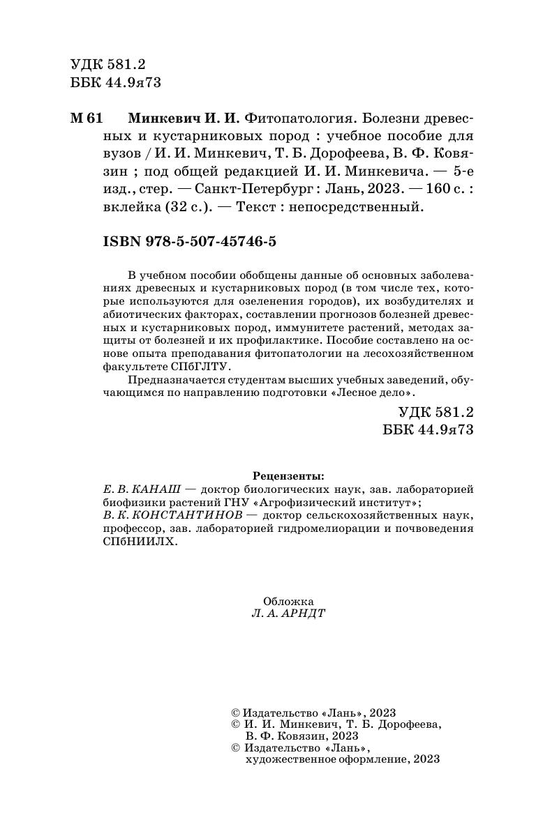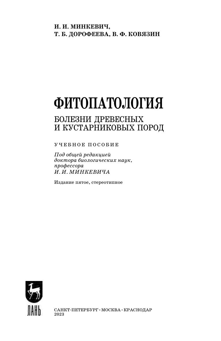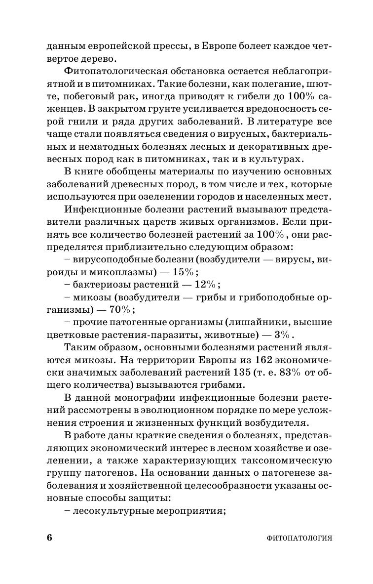 В учебном пособии обобщены данные об основных заболеваниях древесных и кустарниковых пород (в том числе тех, которые используются для озеленения городов), их возбудителях и абиотических факторах, составлении прогнозов болезней древесных и кустарниковых пород, иммунитете растений, методах защиты от болезней и их профилактике. Пособие составлено на основе опыта преподавания фитопатологии на лесохозяйственном факультете СПбГЛТУ. Предназначается студентам высших учебных заведений, обучающимся по направлению подготовки «Лесное дело».